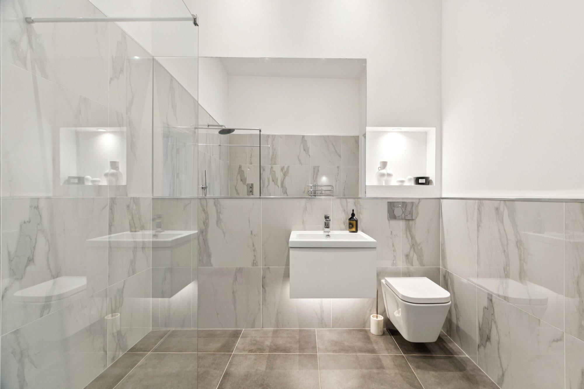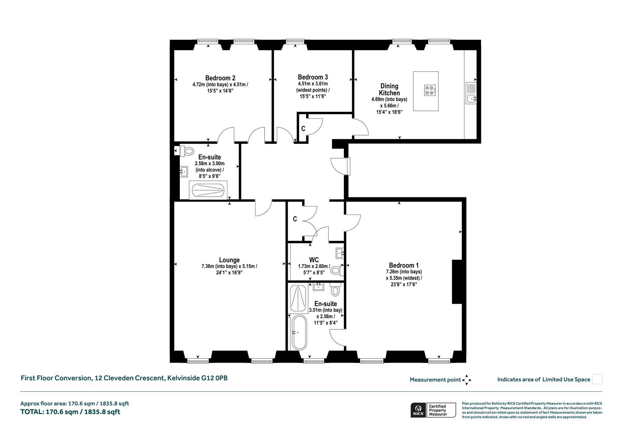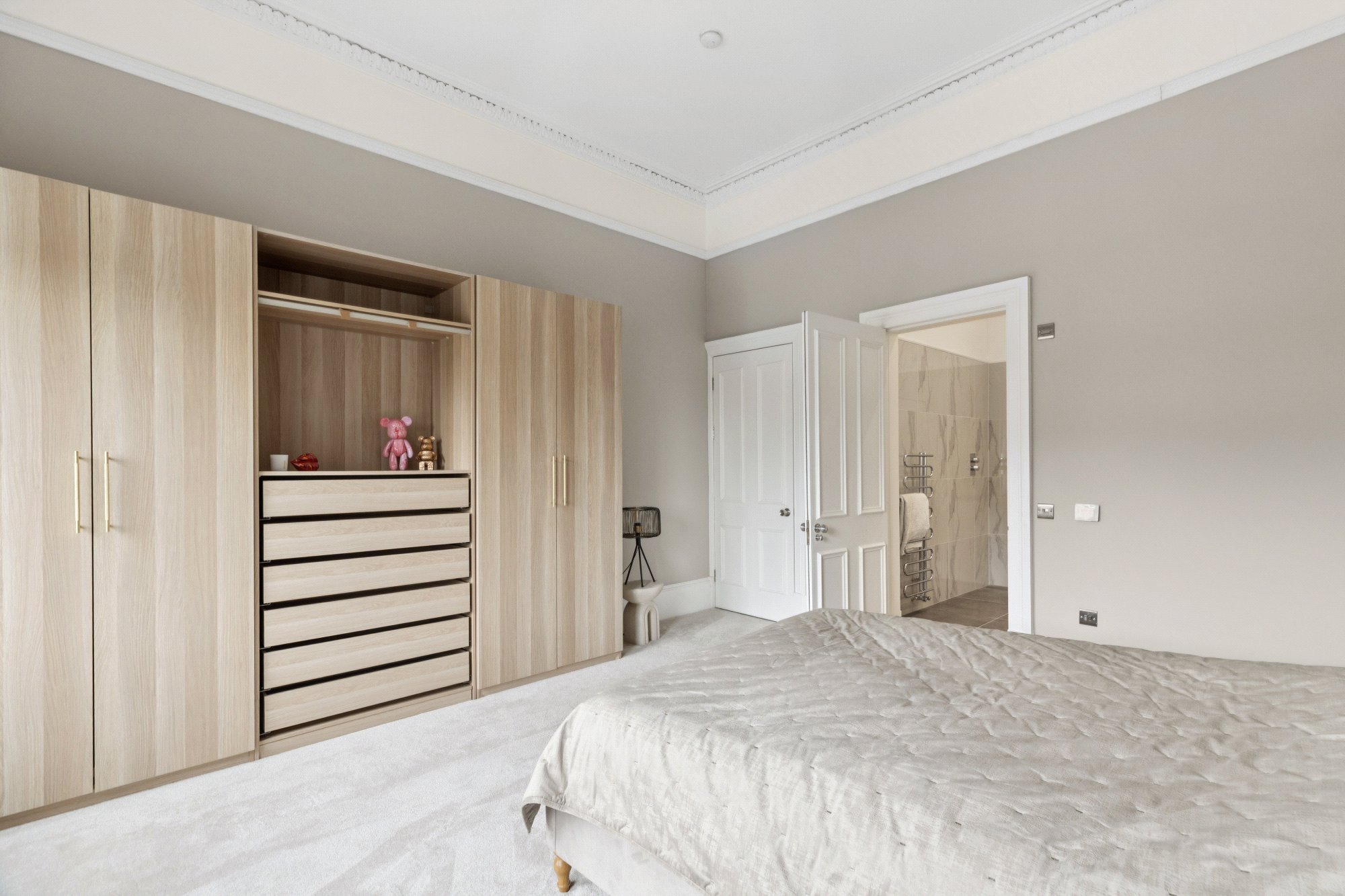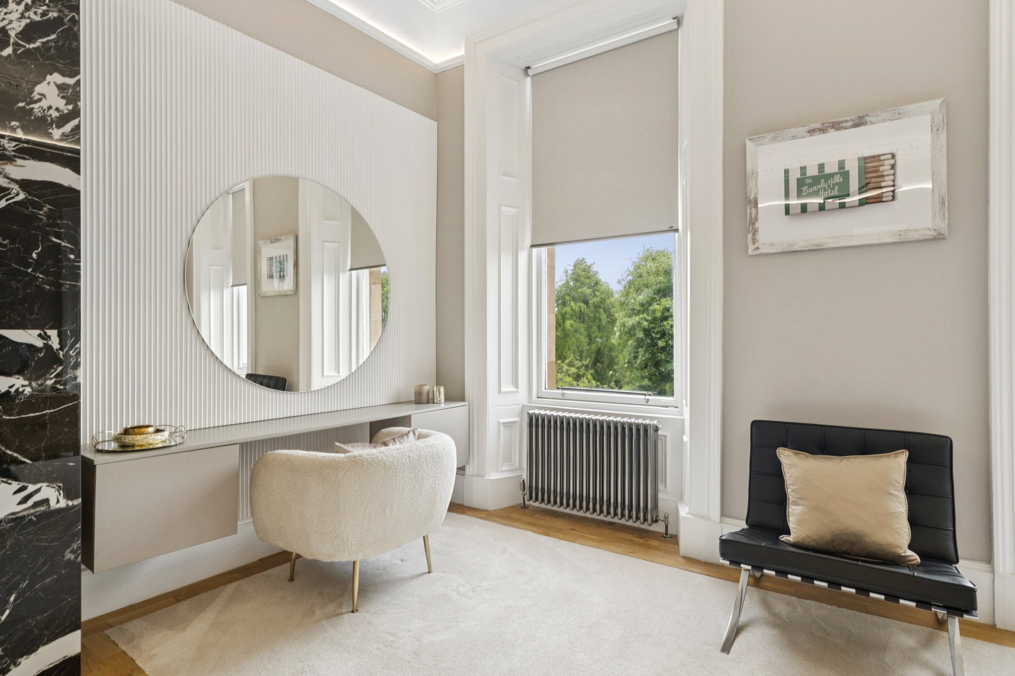 Internally, the flat offers a luxurious specification throughout. The generous reception hallway, lounge/dining space, dining kitchen and bedroom three are united by oak herringbone flooring, while high ceilings, almost full height windows, and quality fixtures contribute to the sense of understated quality. The principal lounge is particularly impressive, offering far-reaching southerly views over Cleveden Gardens towards the hills beyond. It is a spectacular room and provides elegant day-today living.