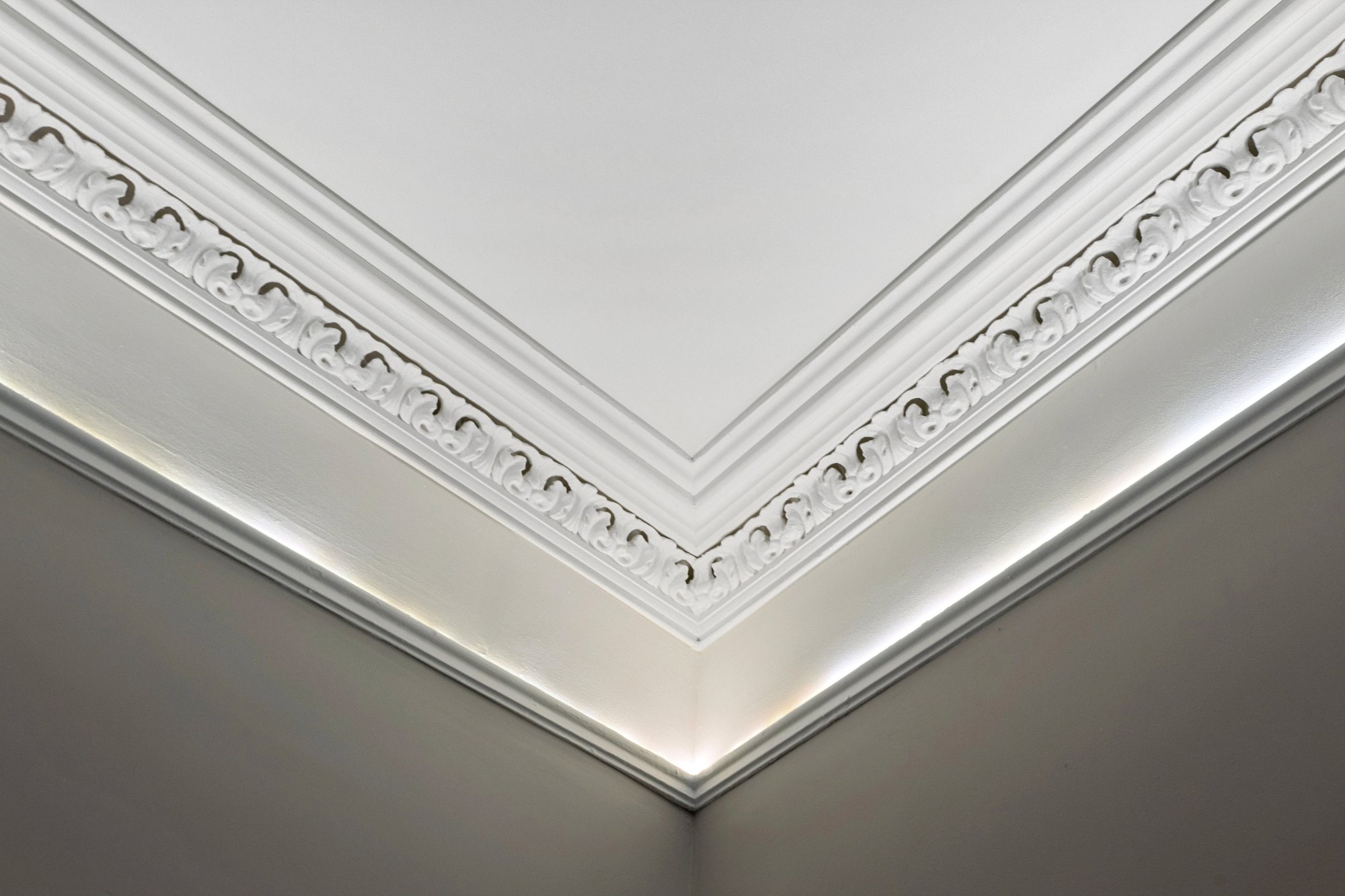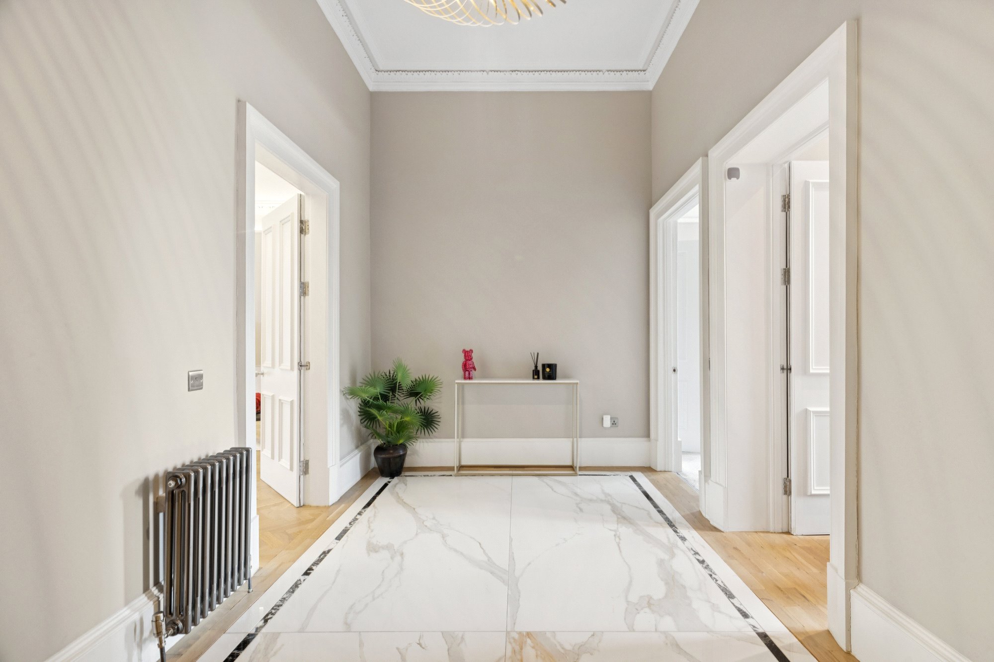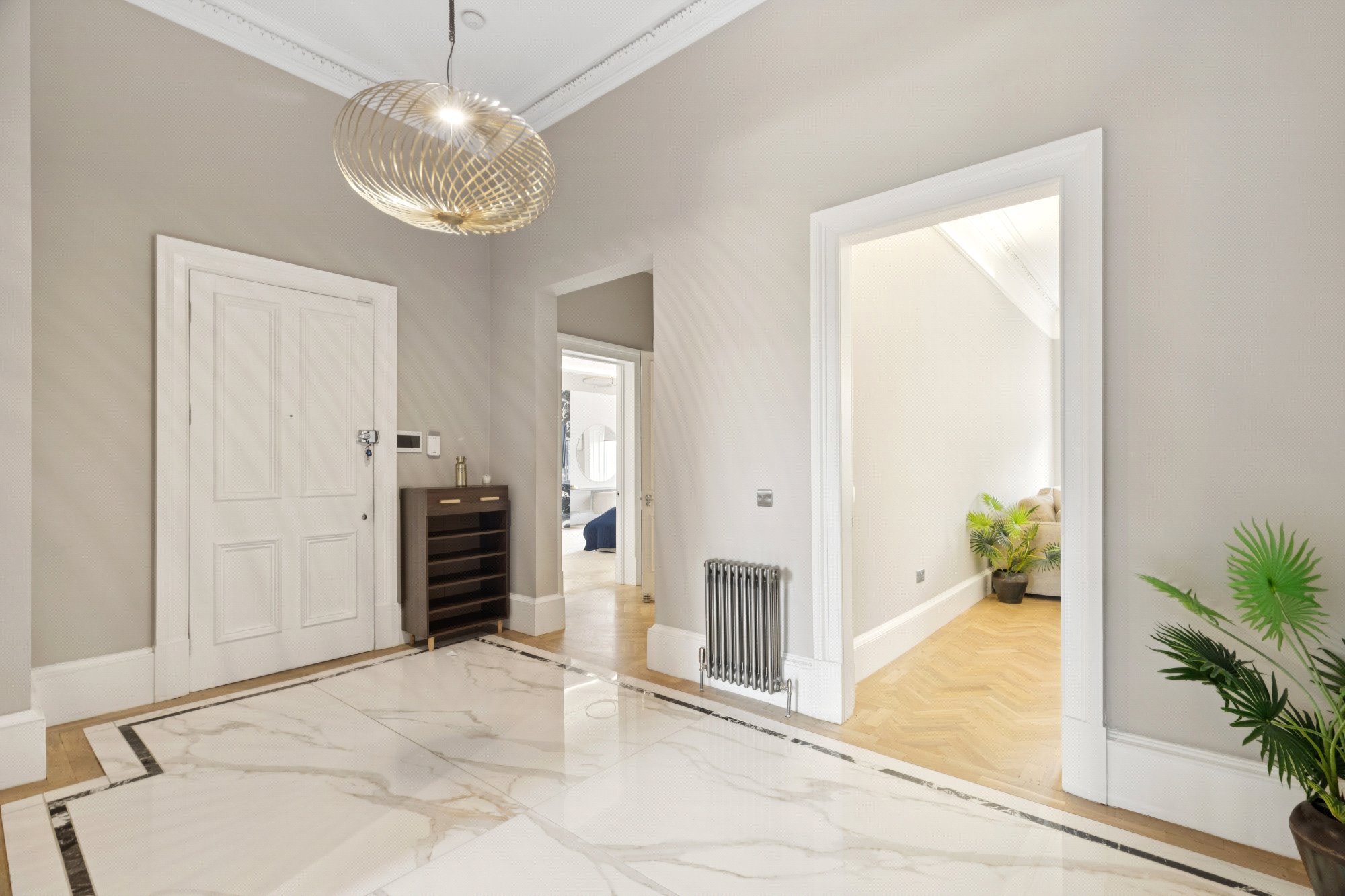 - Luxurious communal entrance hall with ornate pillars and cornicing