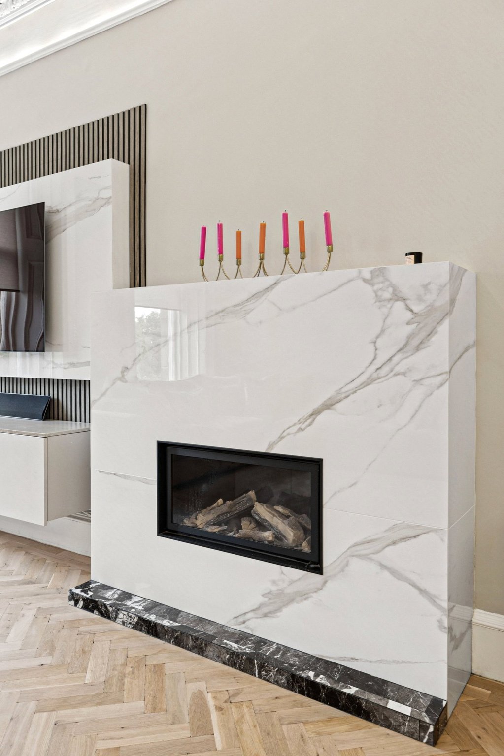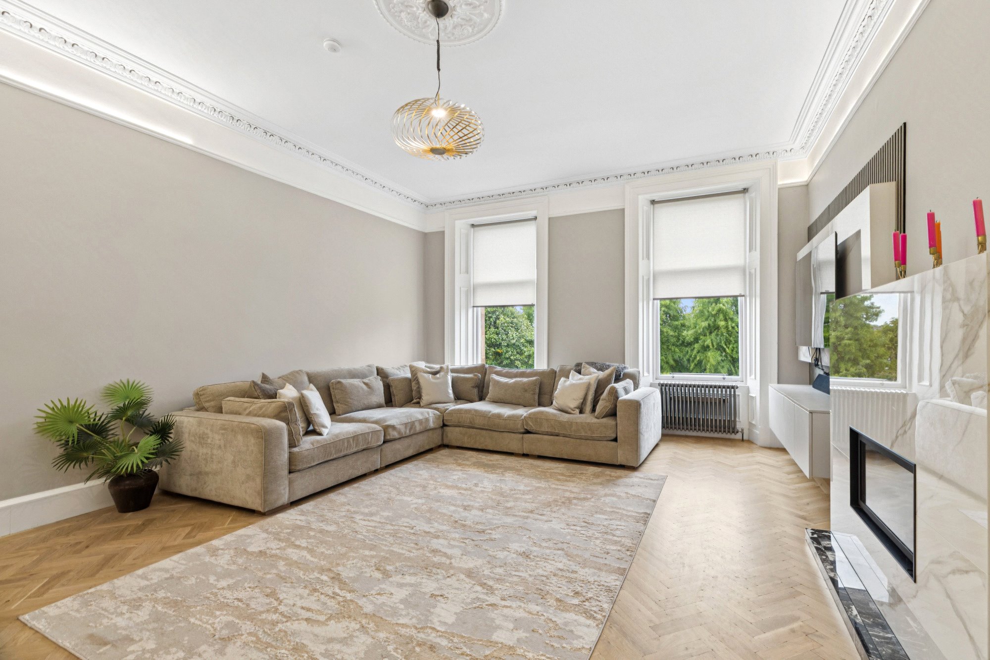 - Stunning main lounge with two large windows to the front, focal point fireplace, herringbone flooring, and ornate cornicing