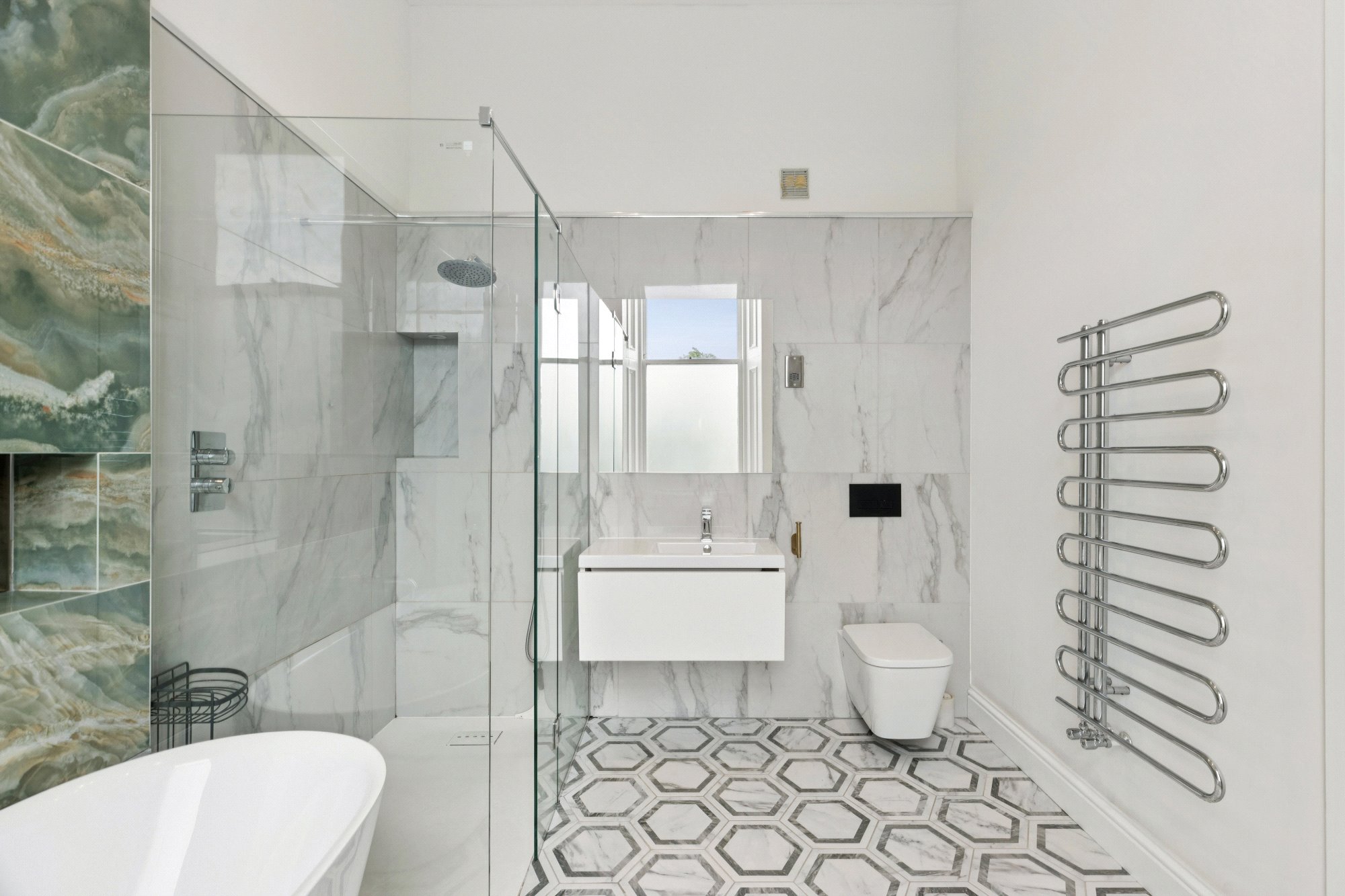 - Amazing en suite bathroom with four piece white suite including a walk-in shower cubicle. Large window to the front