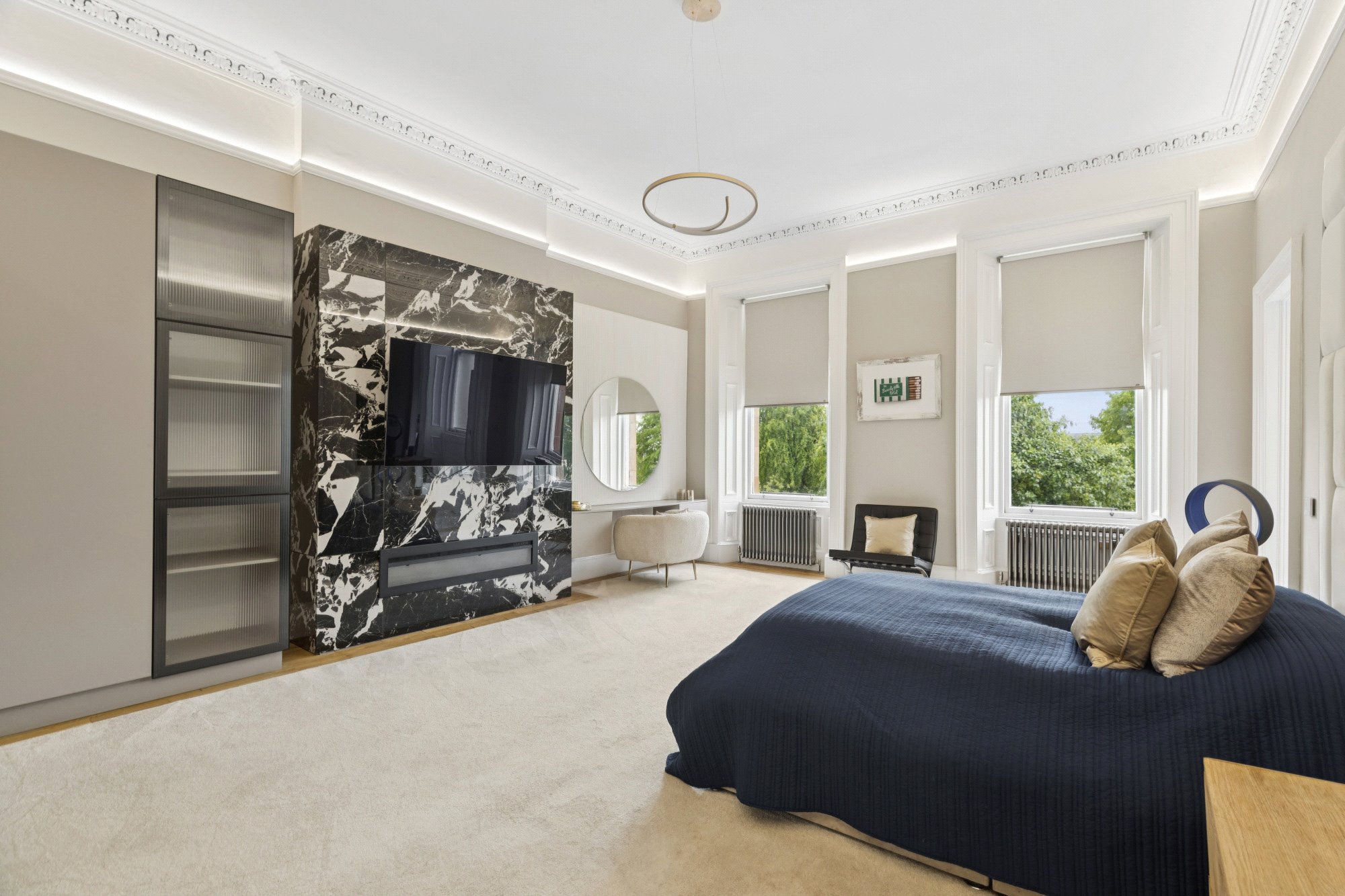 - Bedroom one (principal) which again is of of outstanding proportions and has two large windows to the front, focal point fireplace, quality fitted wardrobes and ornate cornicing
