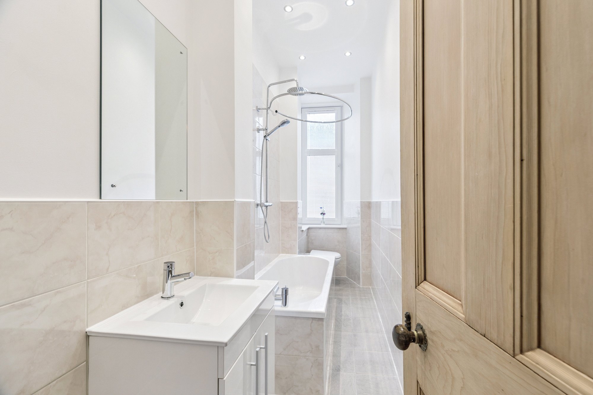 - Three-piece bathroom comprising bath, over bath shower, toilet and wash hand basin. Window to the front