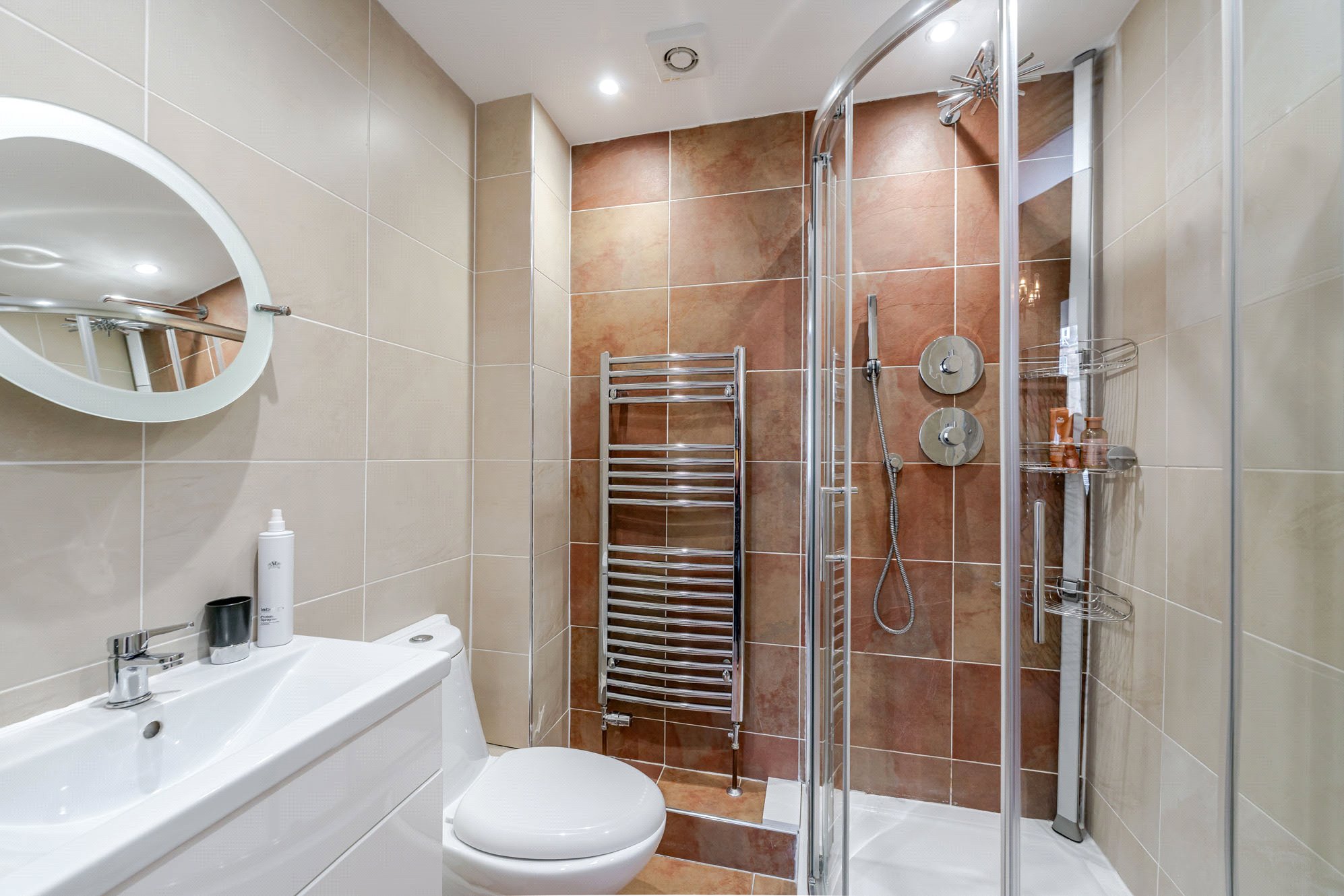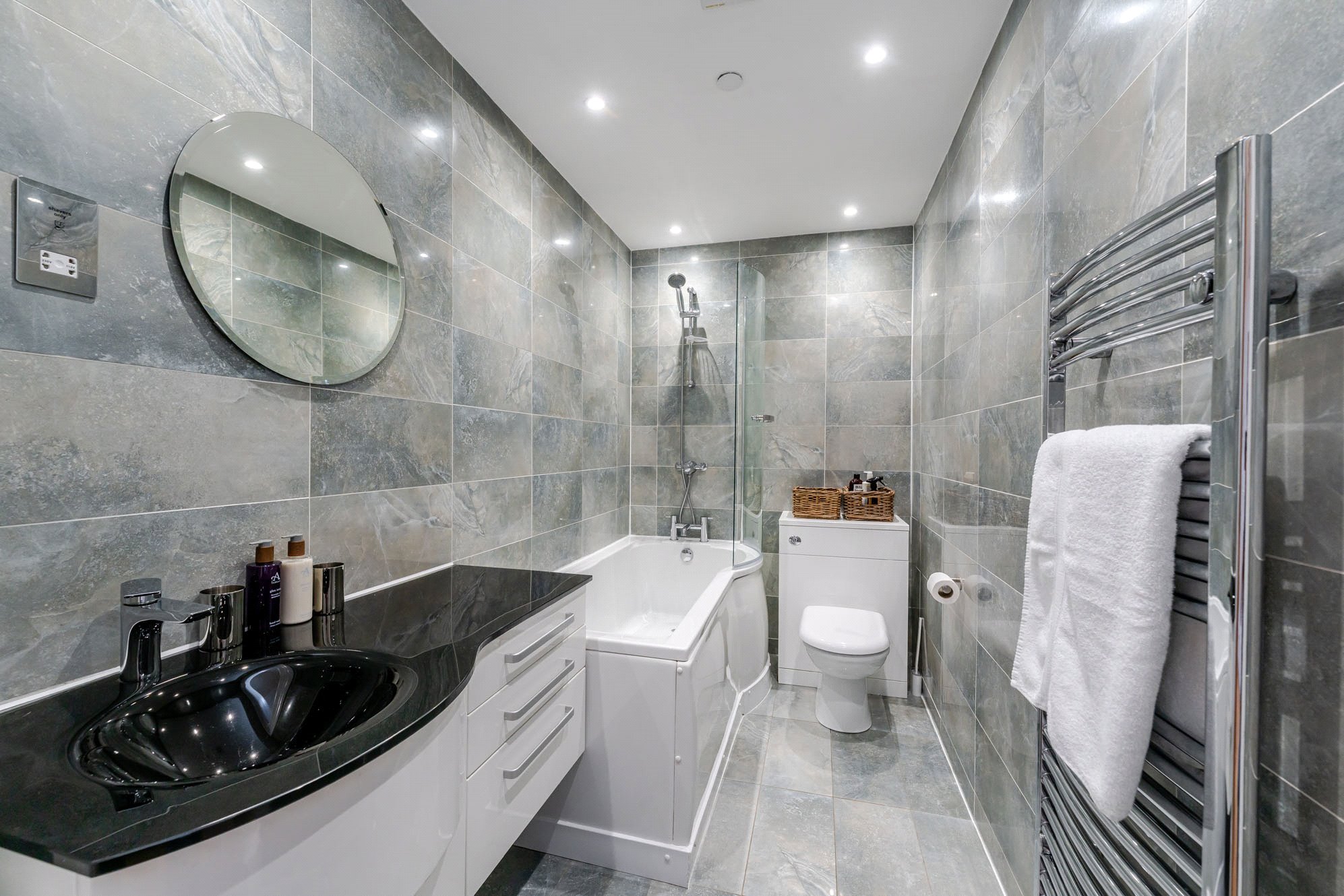 • Impressive main bathroom finished with contemporary tiling and stylish fittings