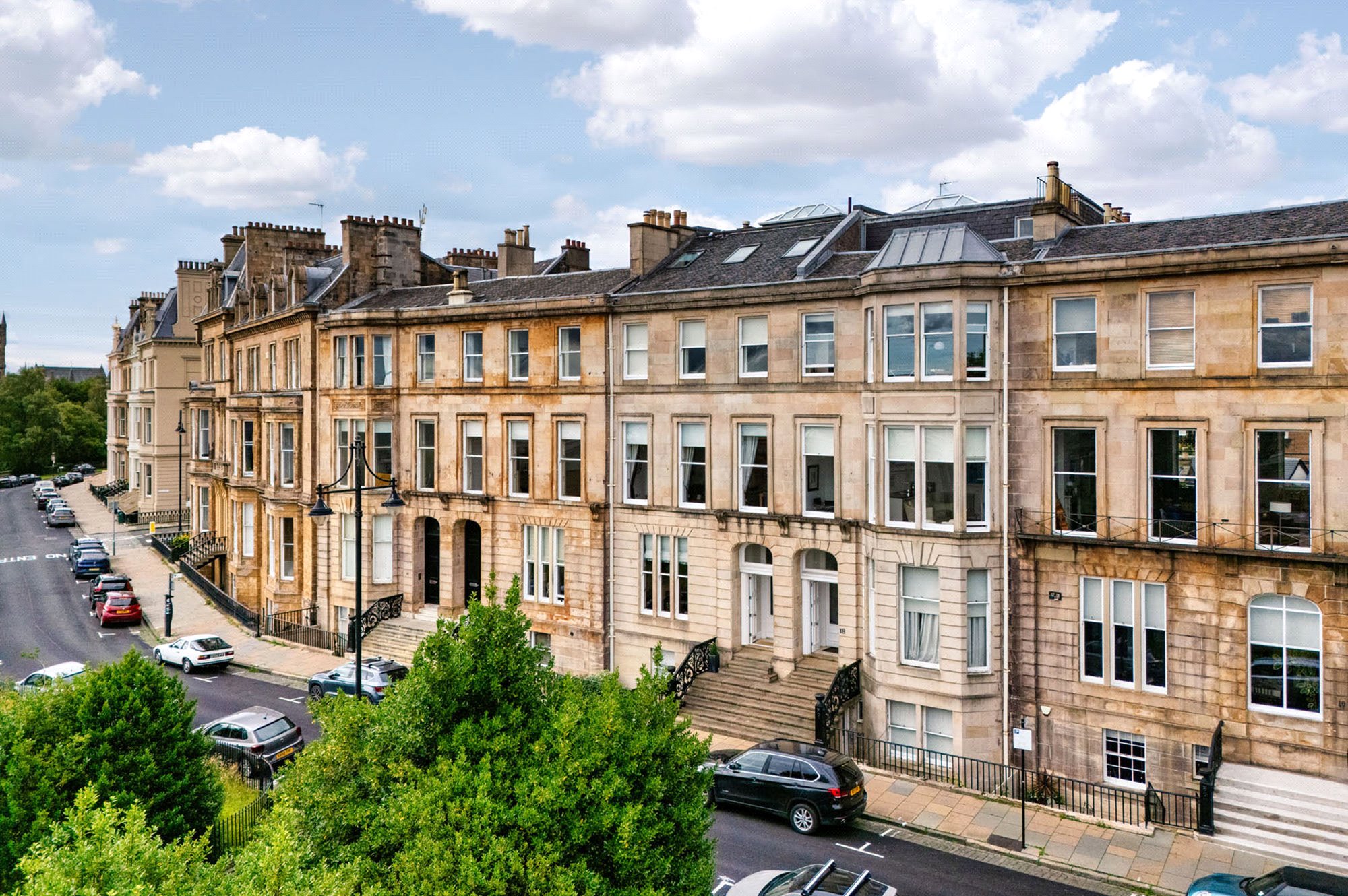 Benefitting from a superb South facing position within a handsome stone terrace at the edge of the upper tier of Glasgow’s revered Park District, this substantial two-bedroom conversion benefits from a preferred first floor position and offers an appealing combination of luxurious accommodation, superb convenience and great levels of privacy.