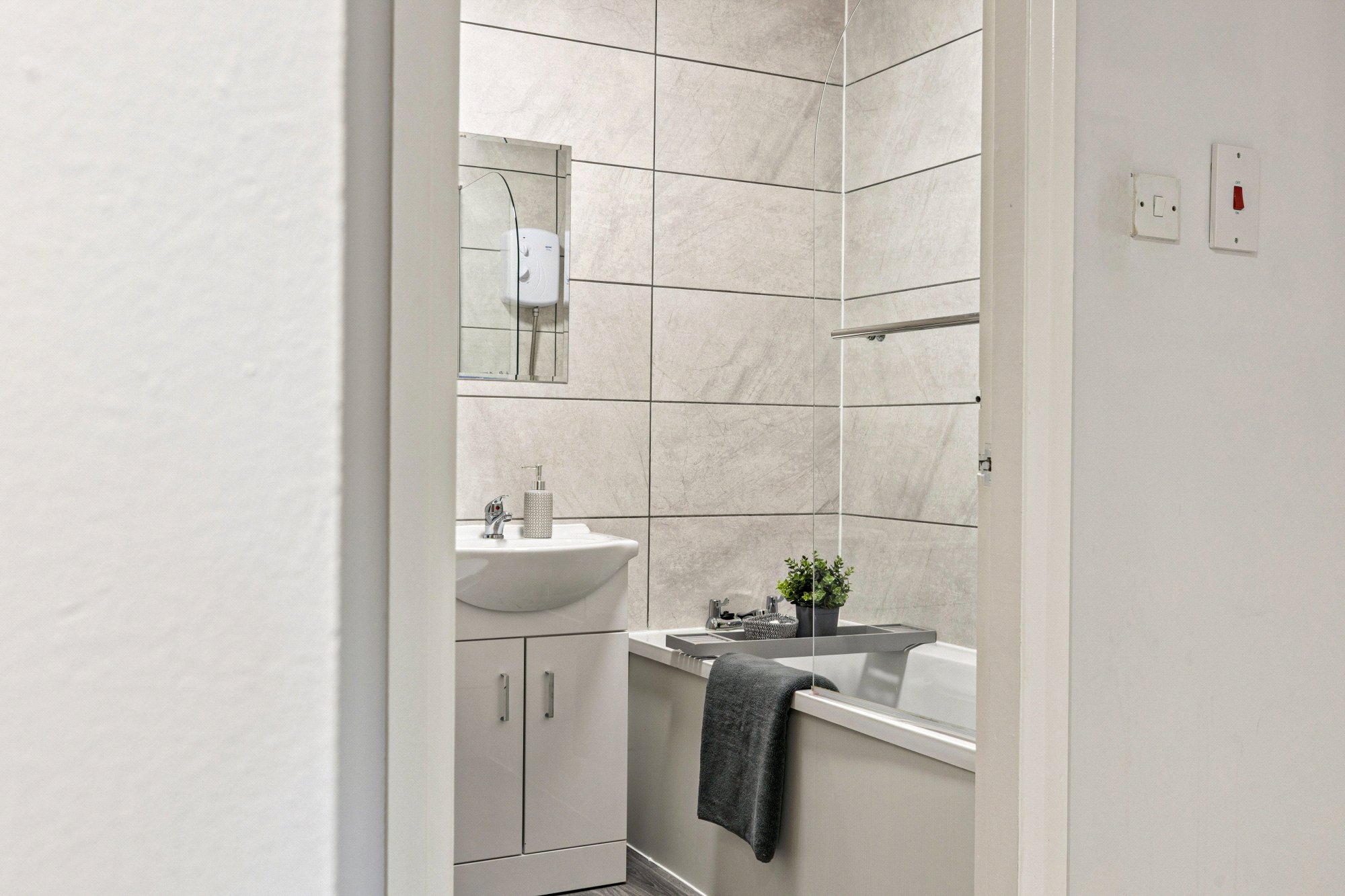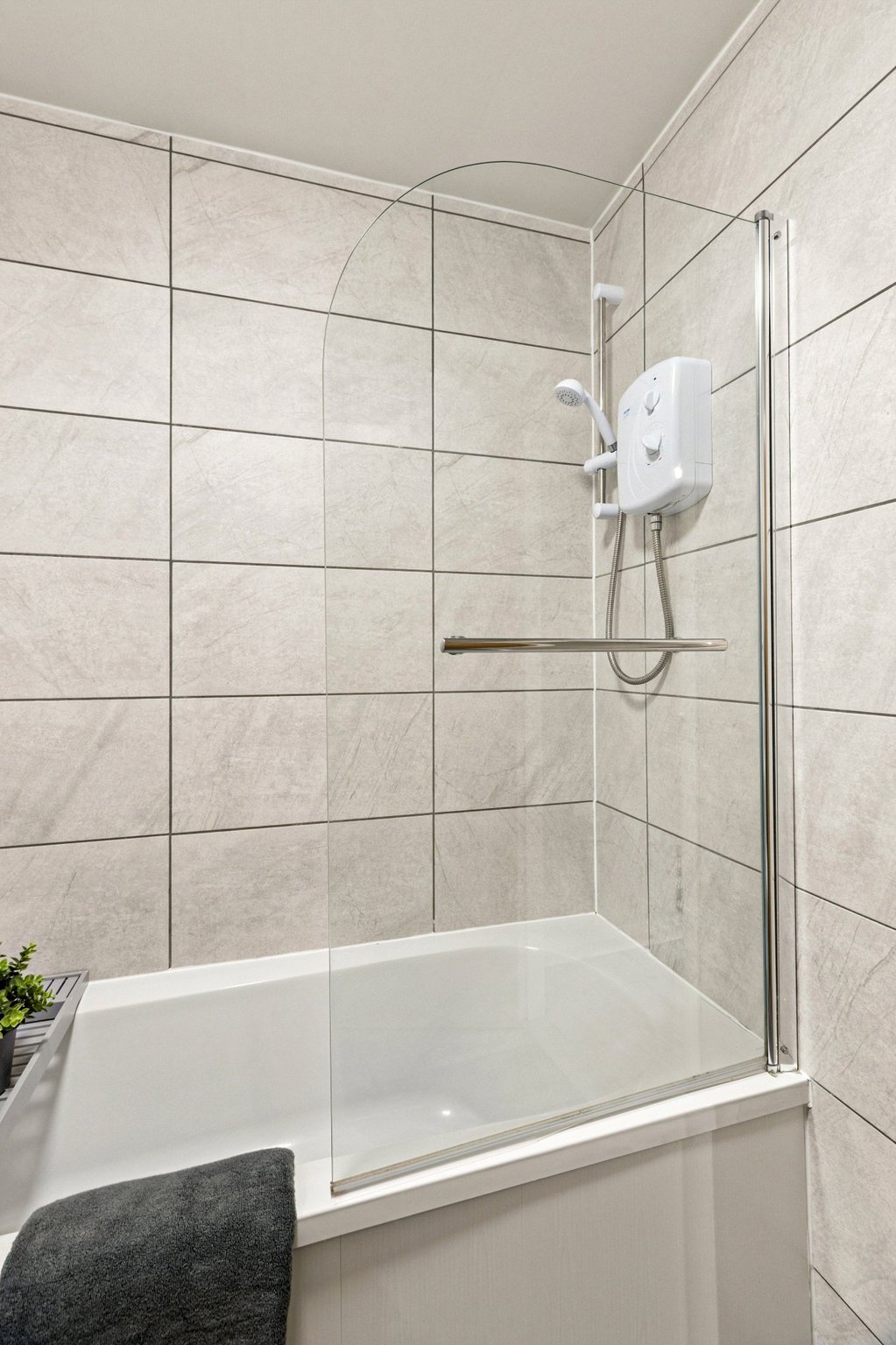 - Modern fitted bathroom with three piece white suite and electric shower over the bath.