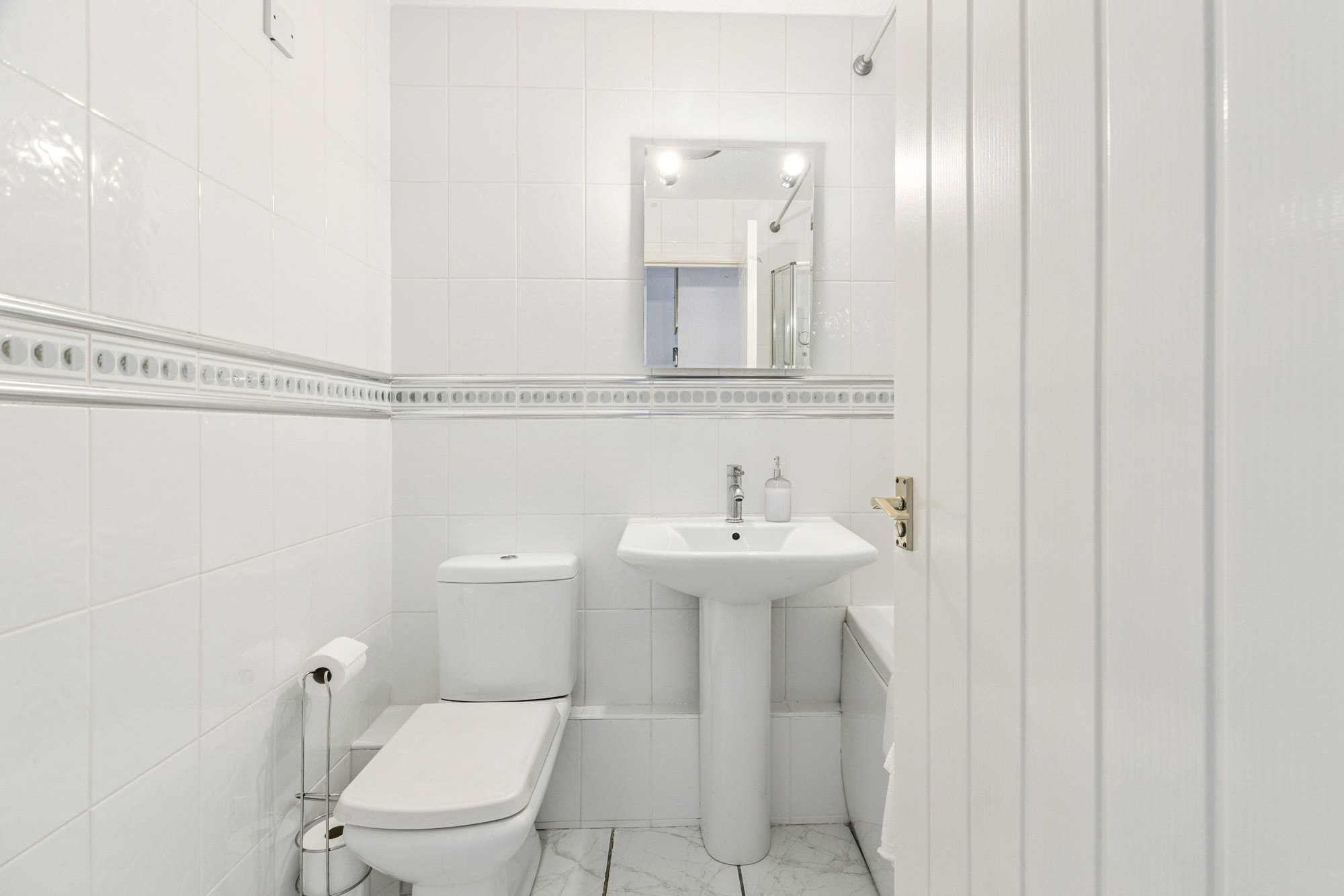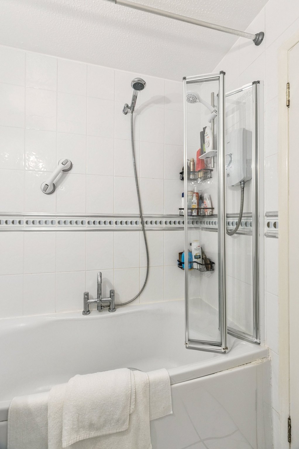 - Three-piece bathroom comprising bath, over bath shower, toilet and wash hand basin