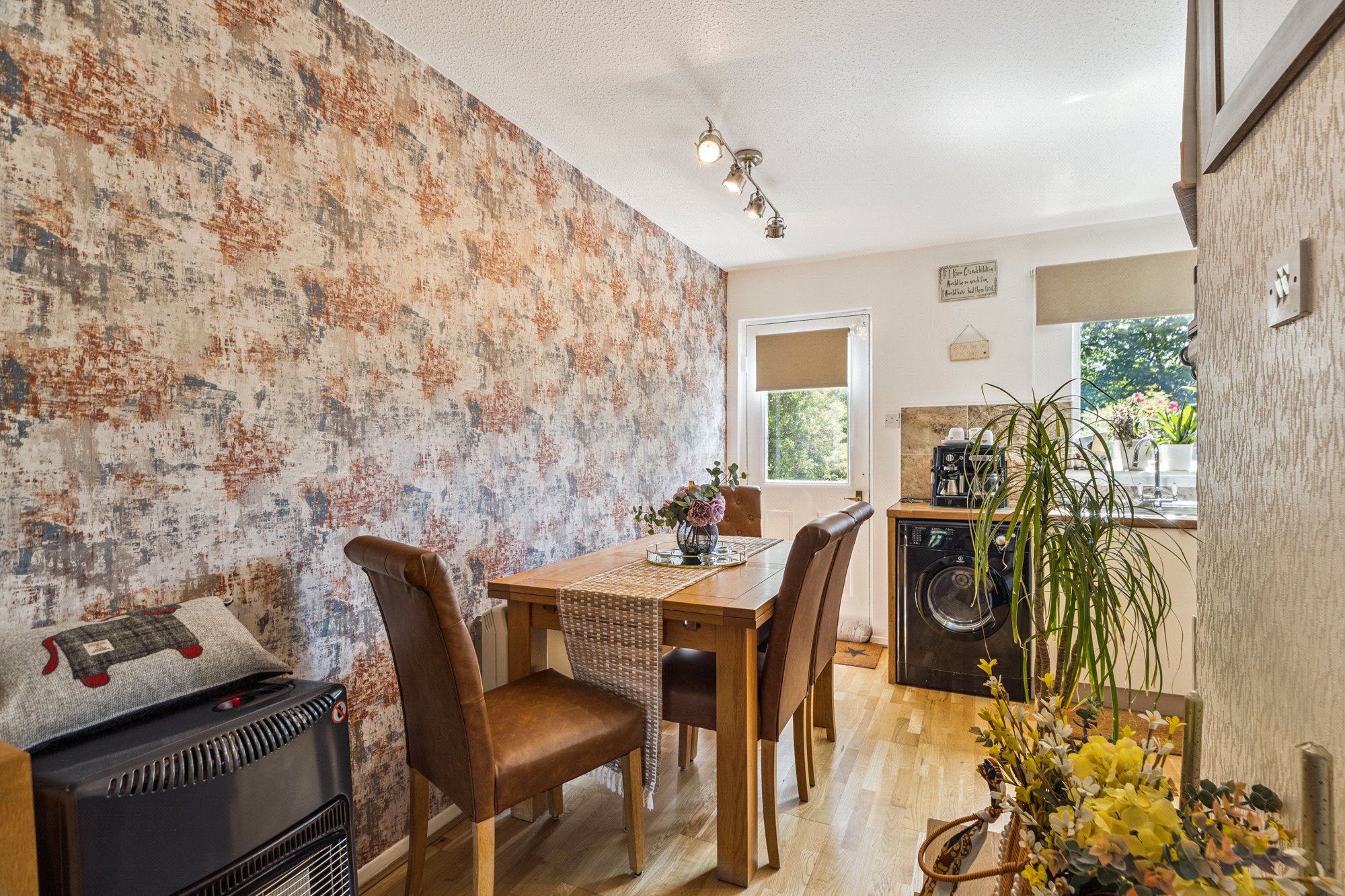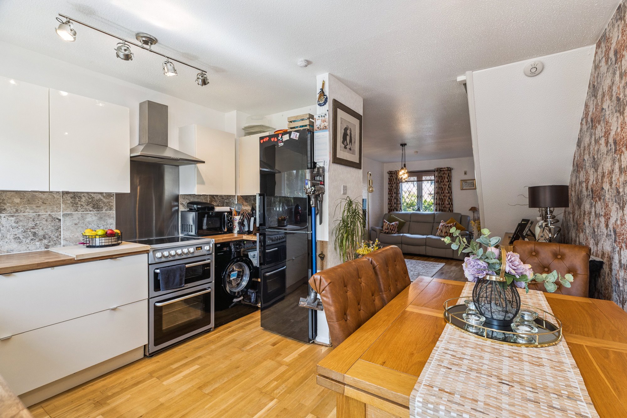 - Dining kitchen complete with a range of base and wall units, appliances, two section window to the rear and direct access to the rear garden
