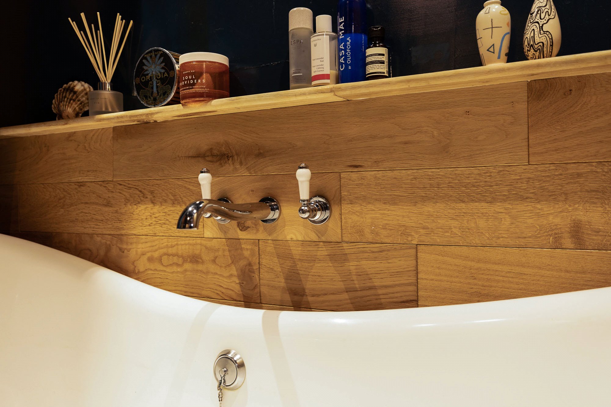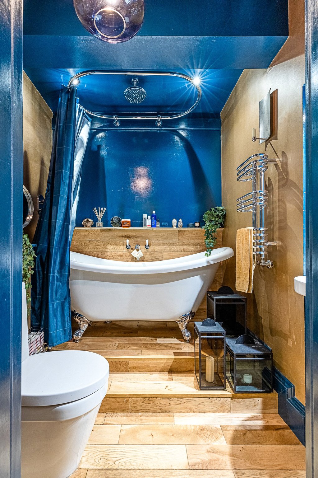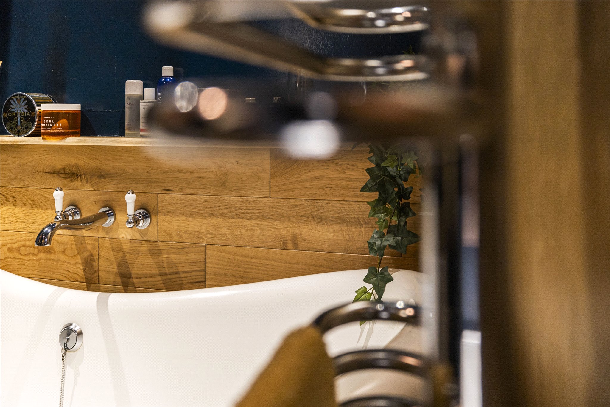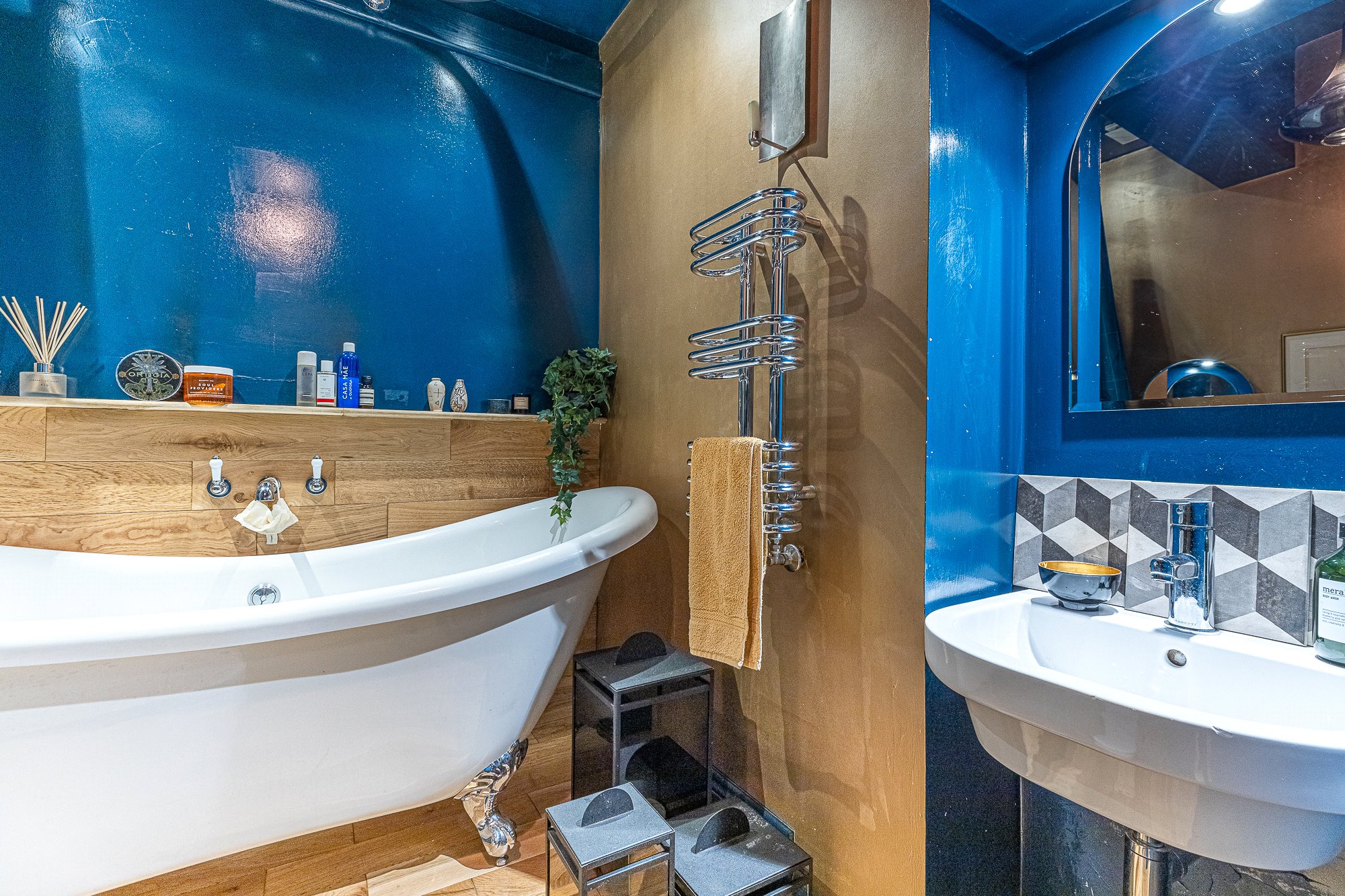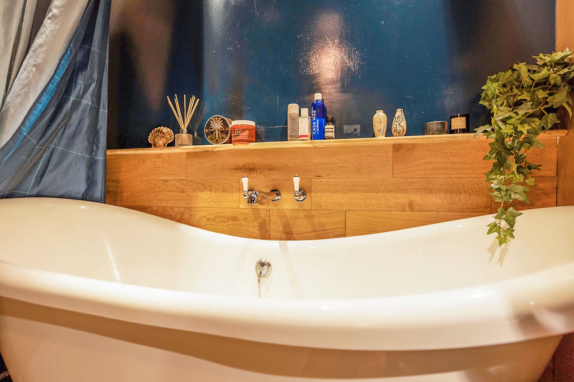 - Charming bathroom which includes a free-standing bath with shower over the bath. Wooden floor.