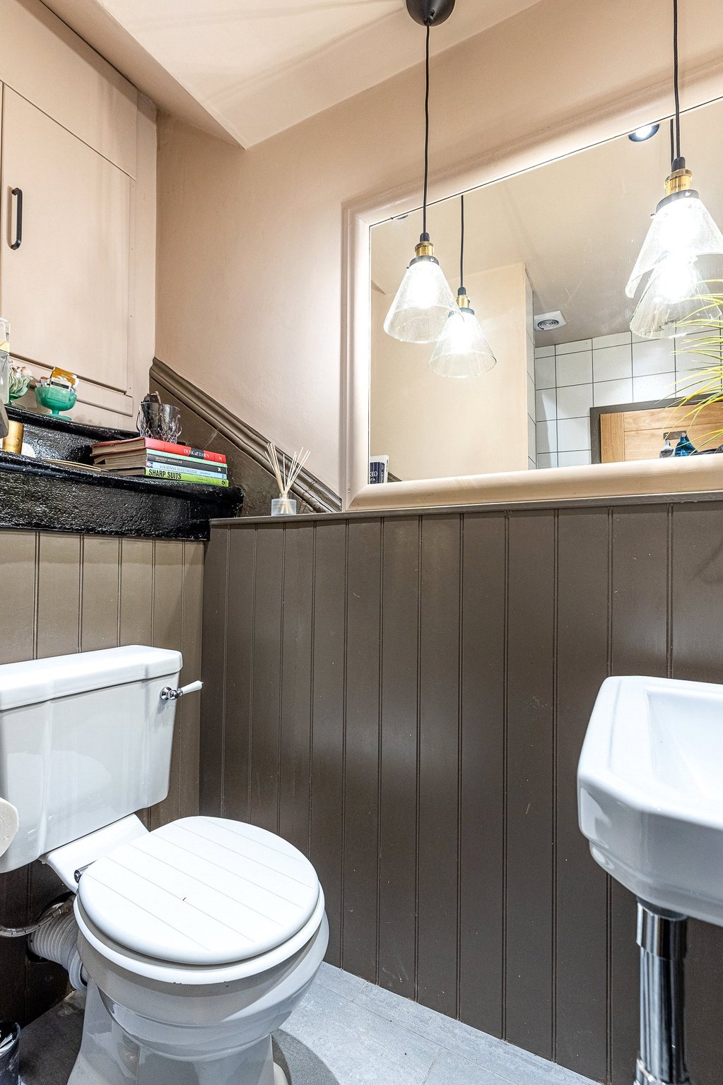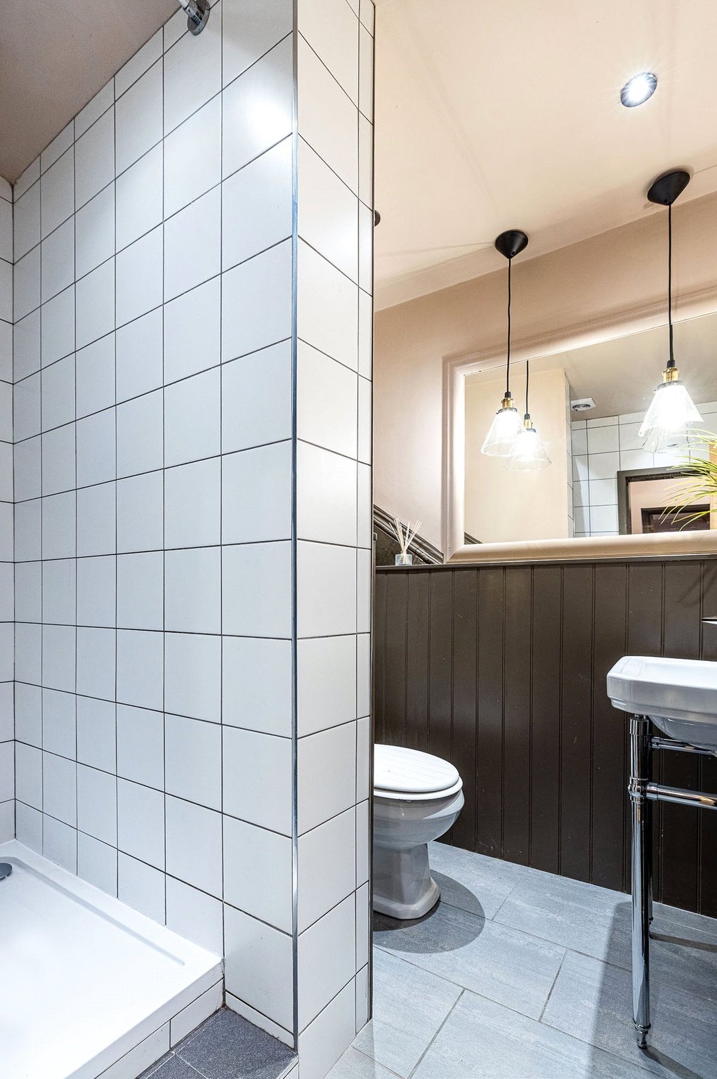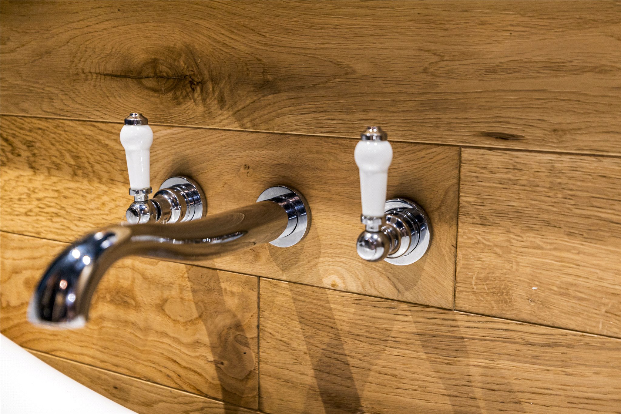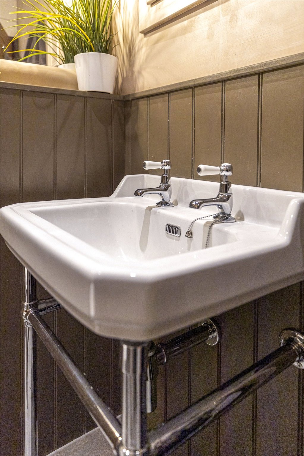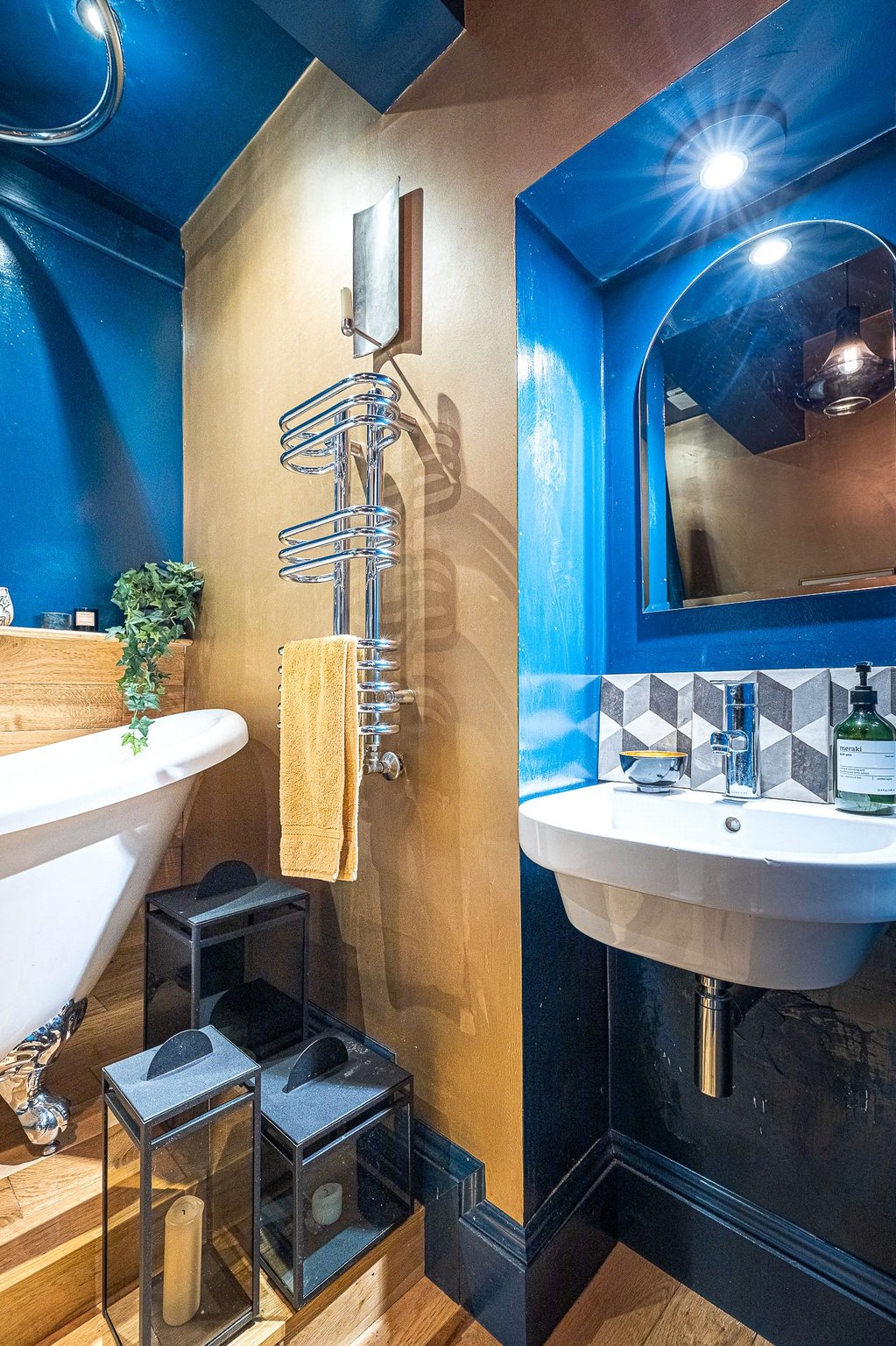 - Charming bathroom which includes a free-standing bath with shower over the bath. Wooden floor.