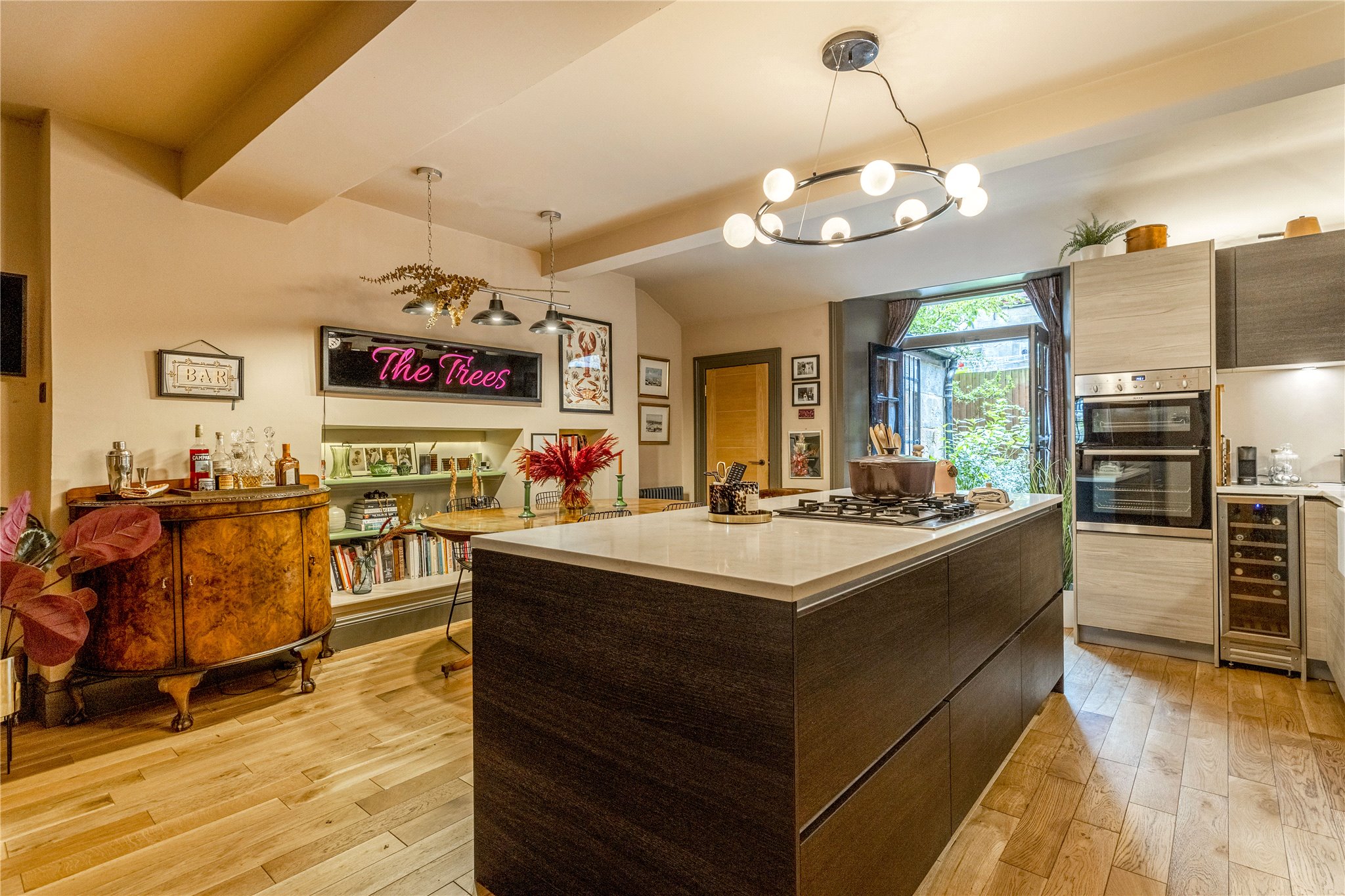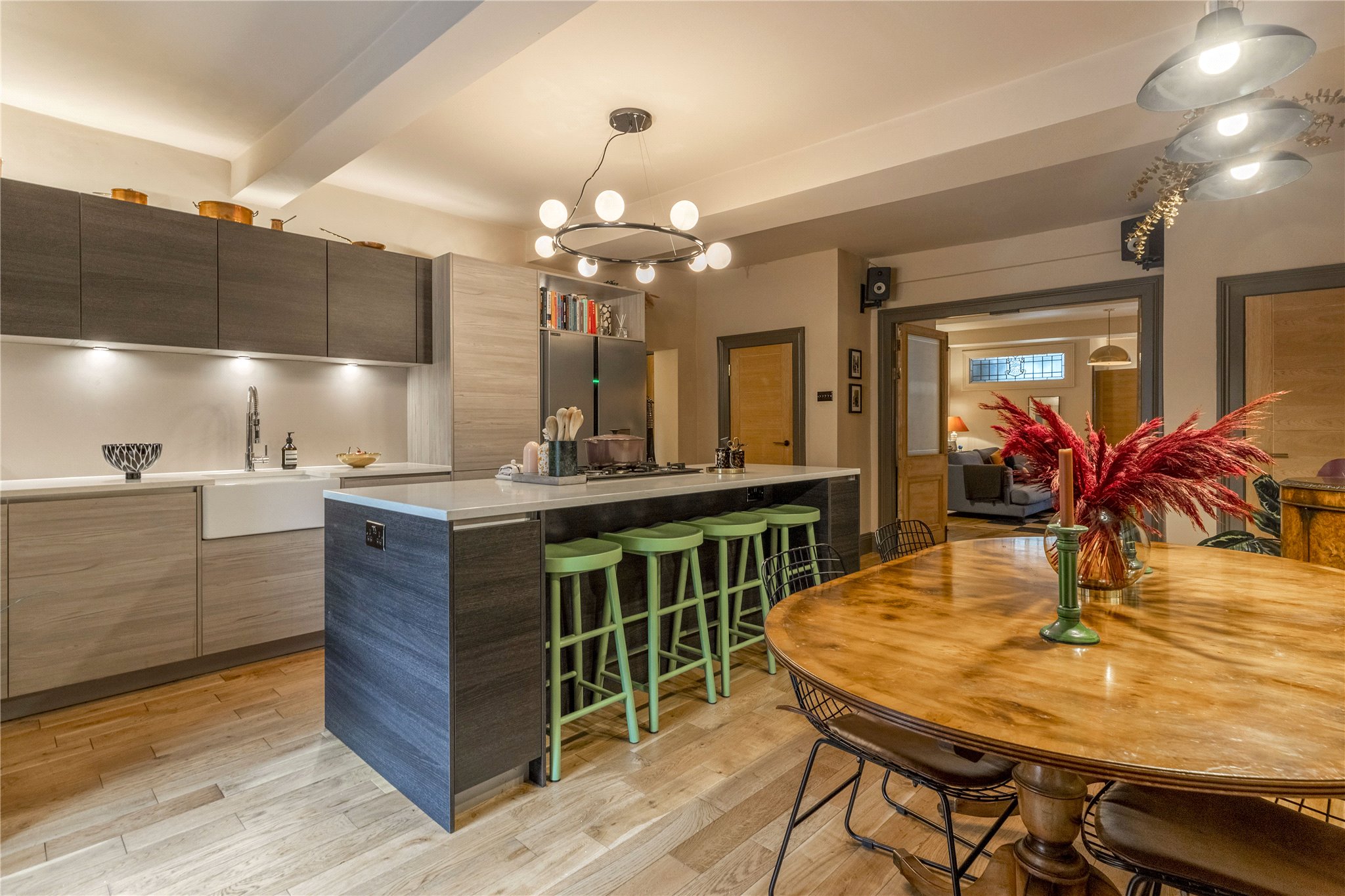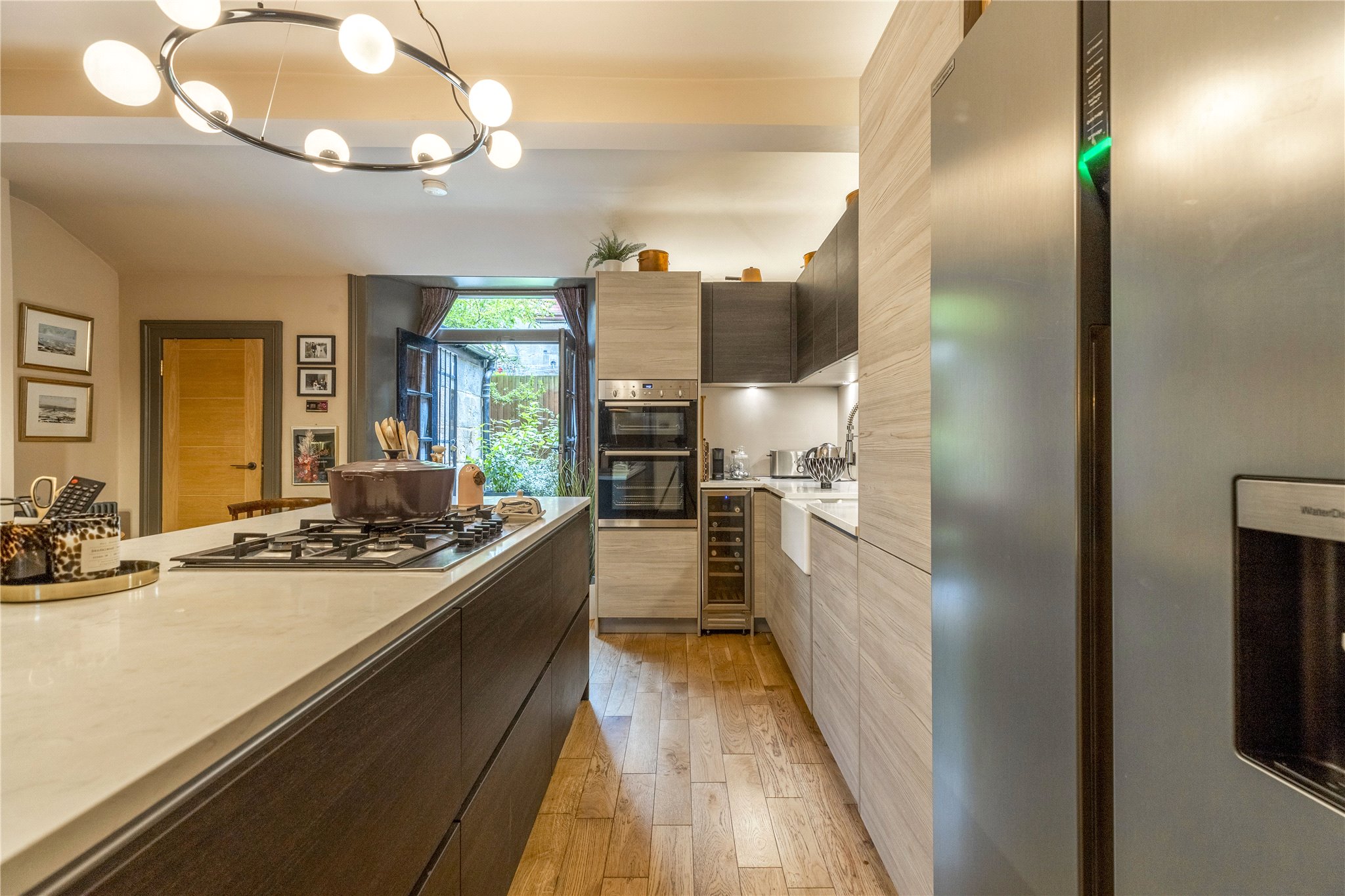- Absolutely fabulous, re-fitted dining kitchen with double doors to the back courtyard. Access to pantry, second storage cupboard off, access to utility area, wooden floor, double oven (Neff), integral dishwasher, American style fridge freezer, five ring gas hob, wine fridge, superb central island and feature Belfast style sink.