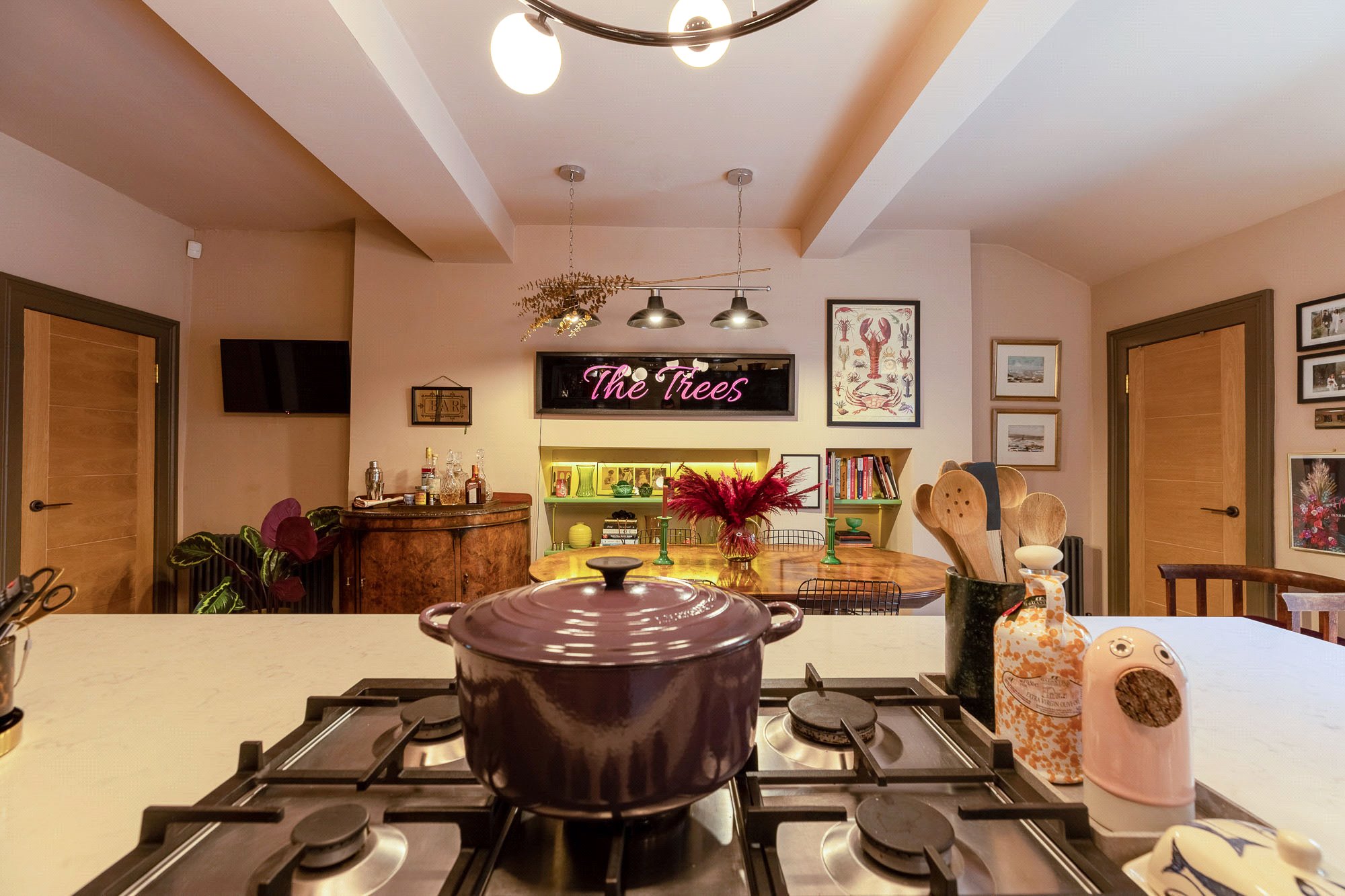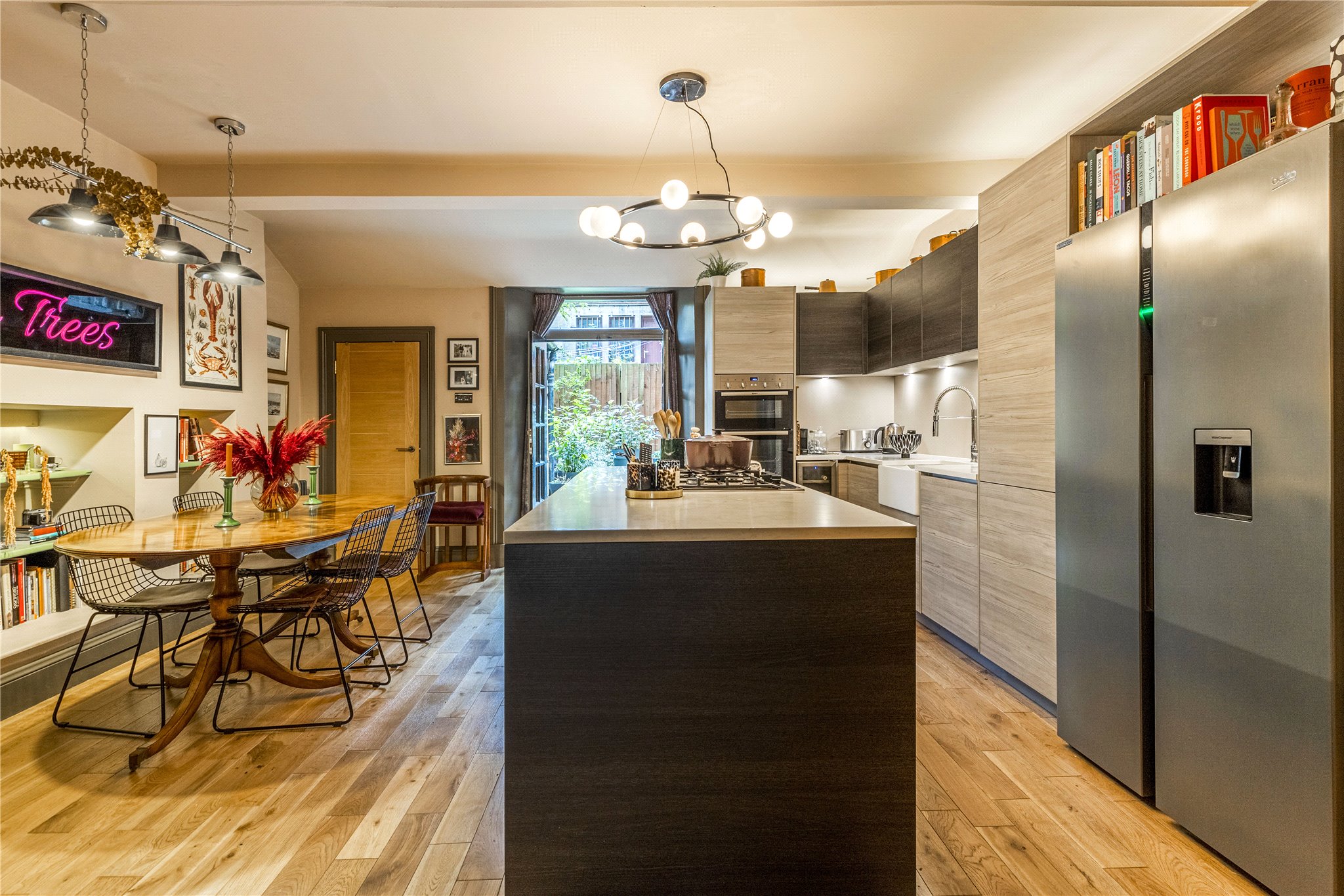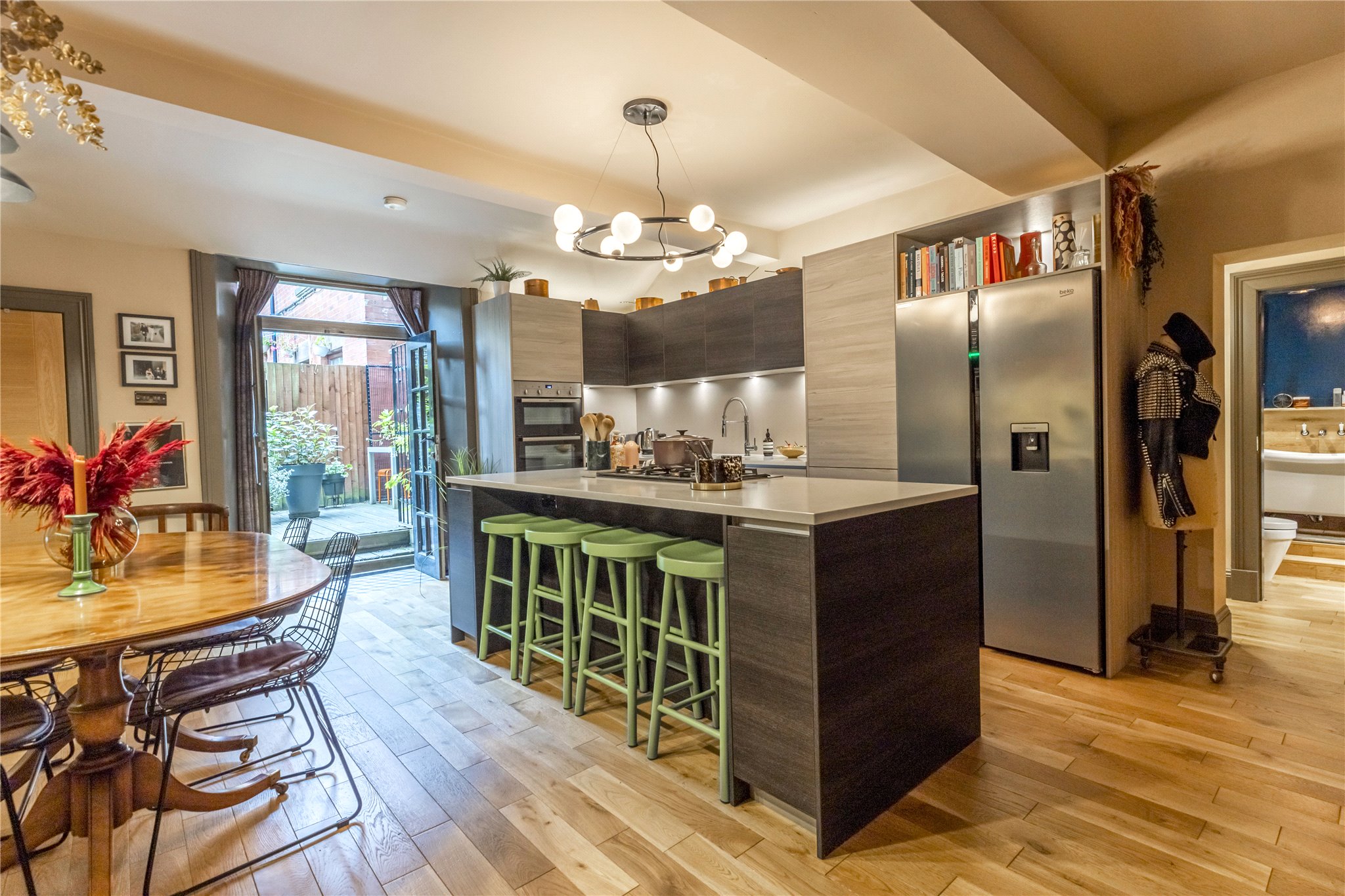 - Absolutely fabulous, re-fitted dining kitchen with double doors to the back courtyard. Access to pantry, second storage cupboard off, access to utility area, wooden floor, double oven (Neff), integral dishwasher, American style fridge freezer, five ring gas hob, wine fridge, superb central island and feature Belfast style sink.