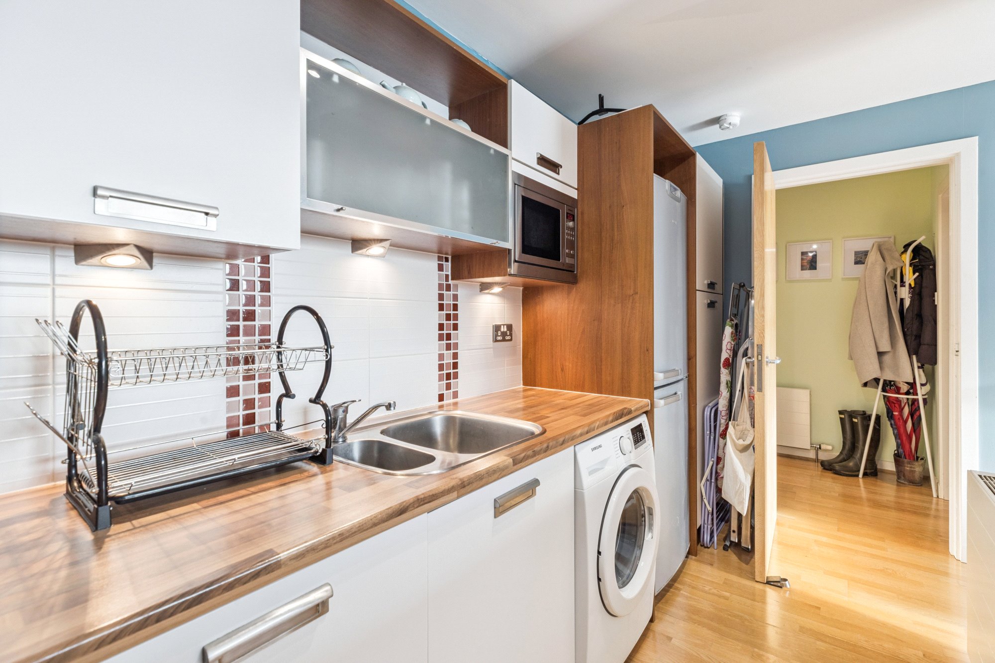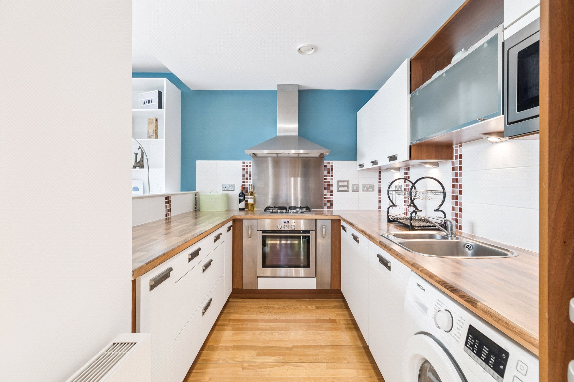 - Open-plan kitchen with a range of wall/base units and integrated appliances.