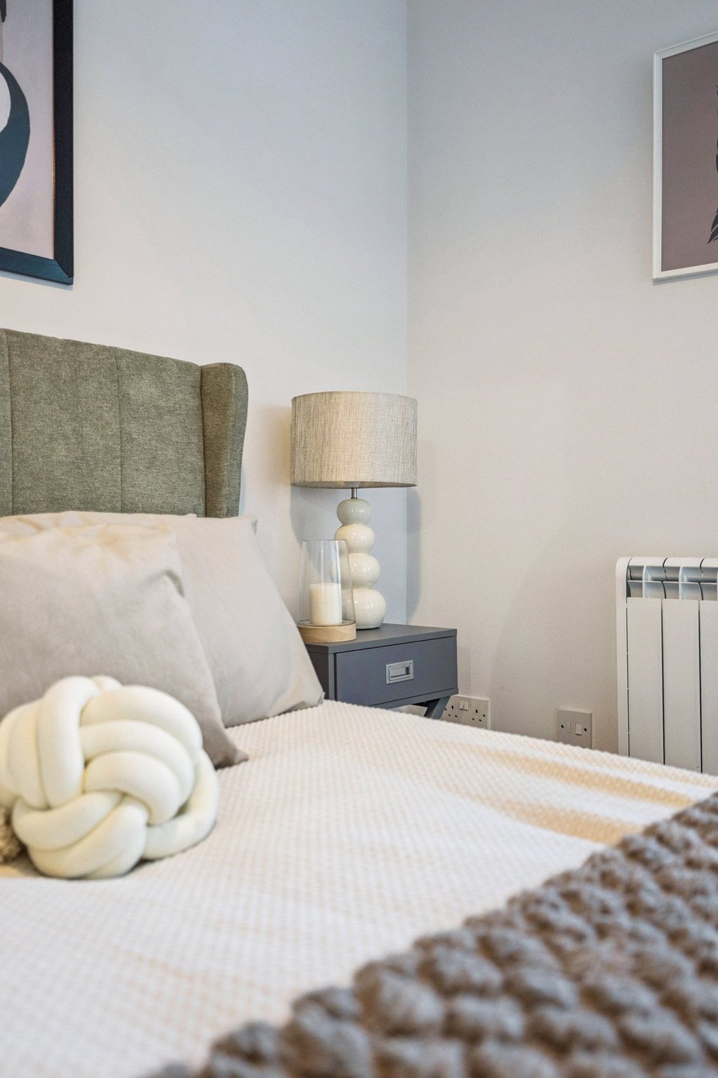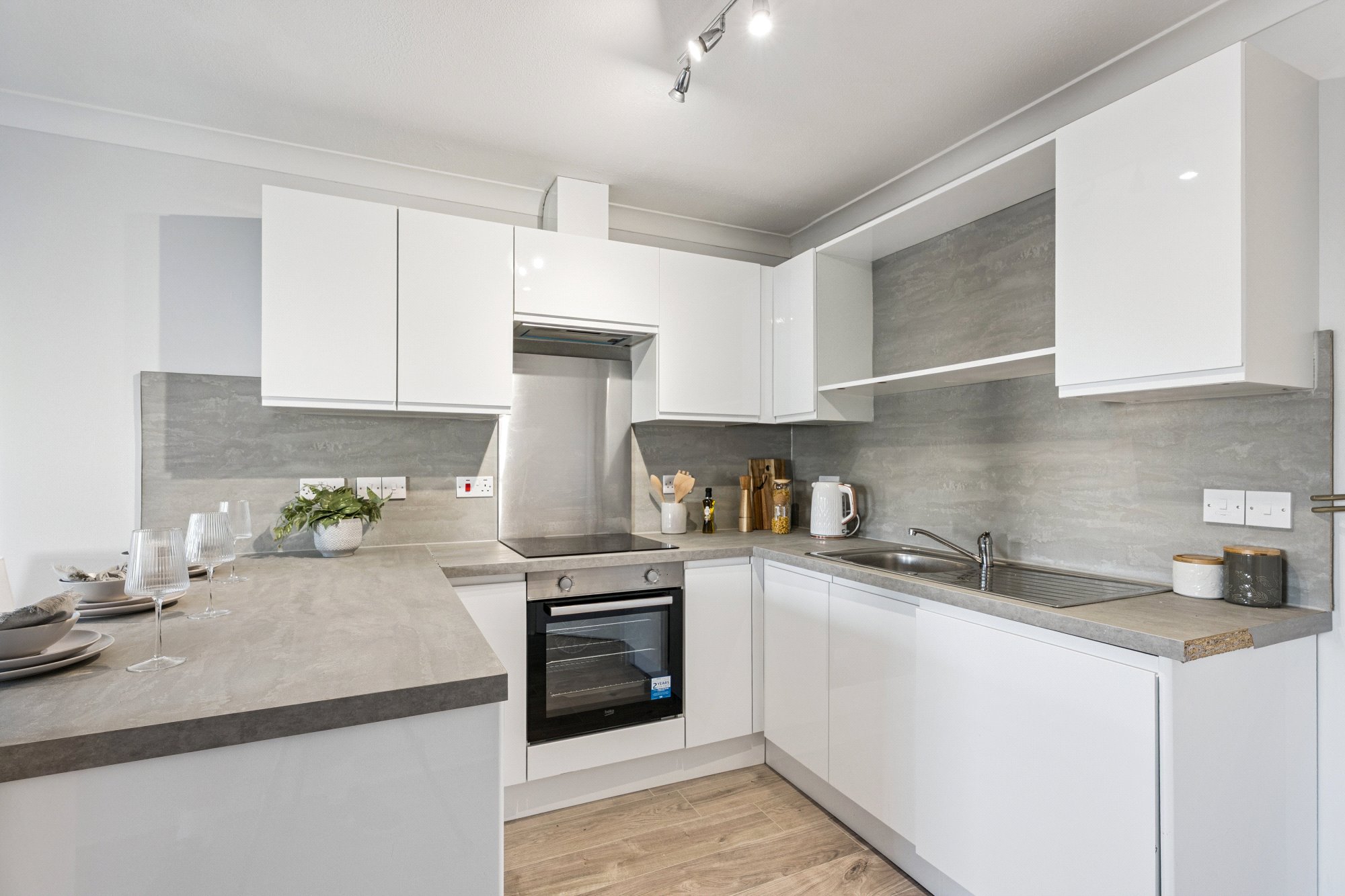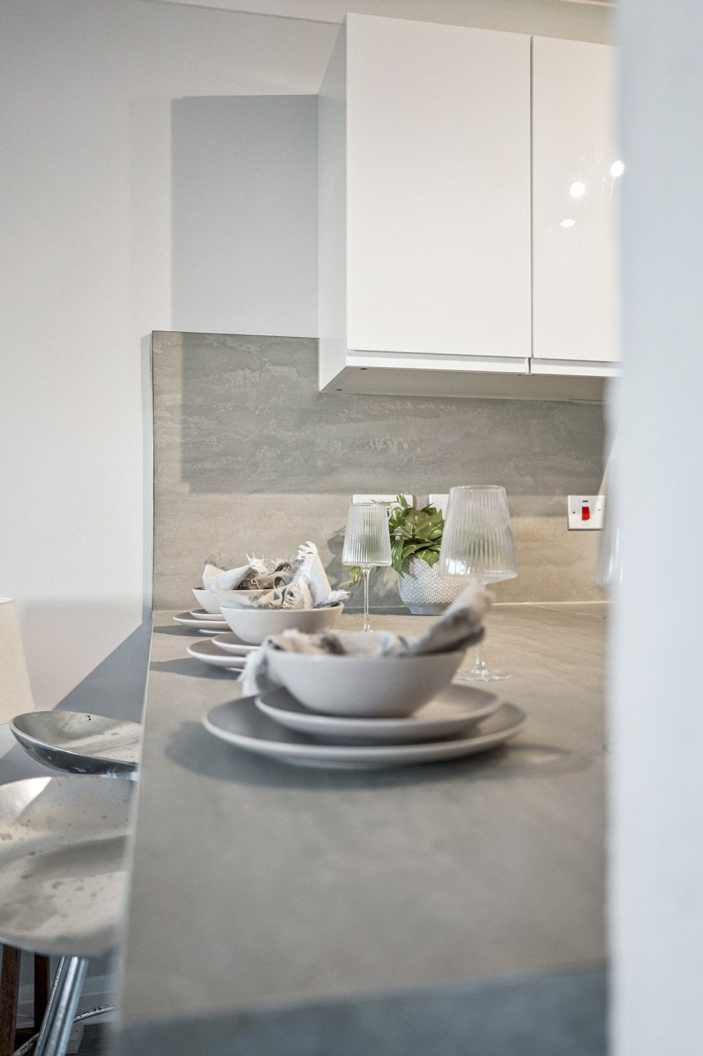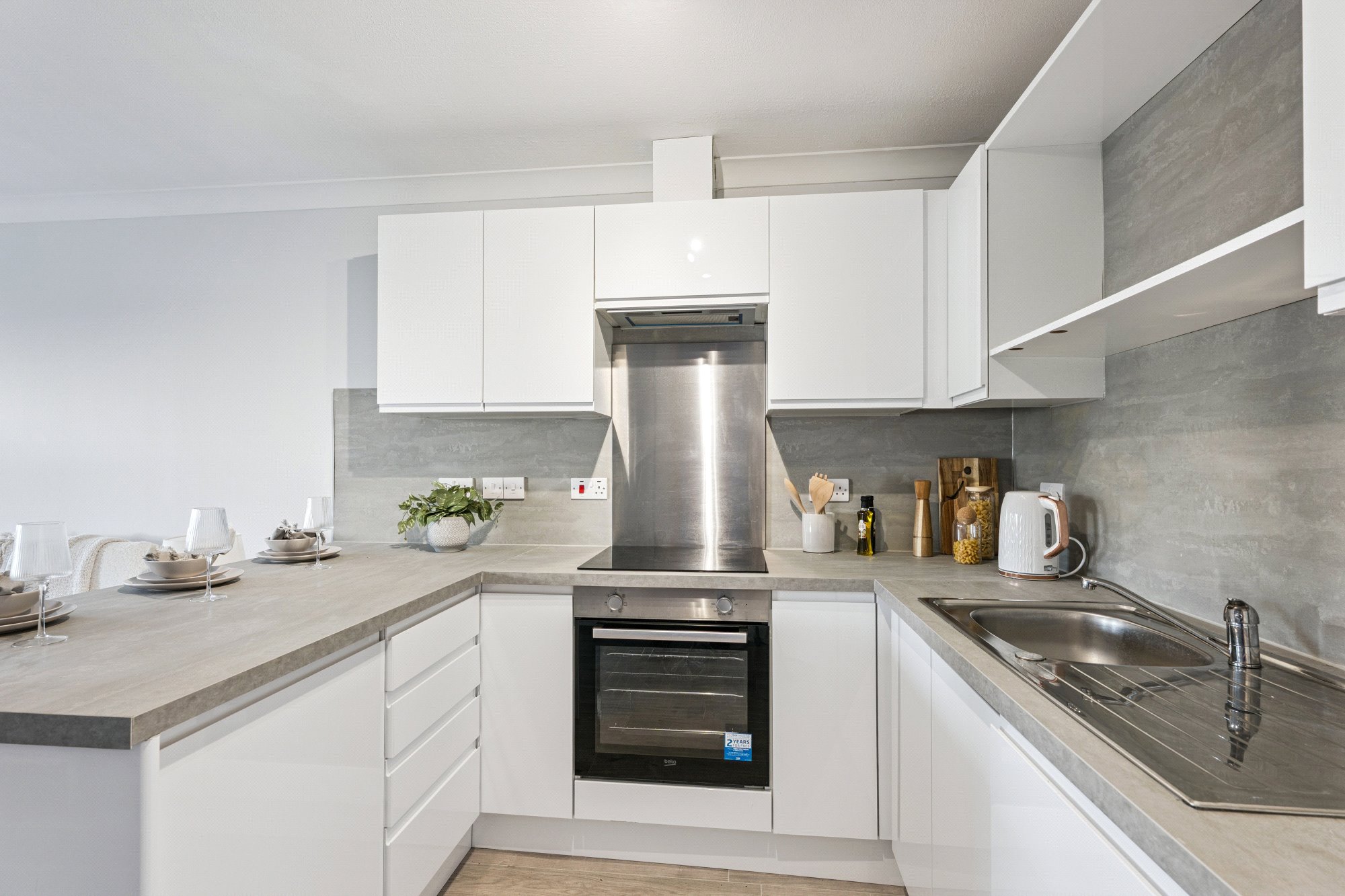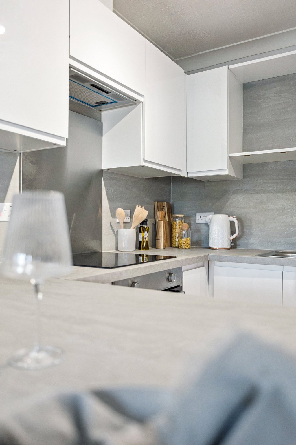 The property has been thoughtfully upgraded throughout, offering contemporary interiors, a smart open-plan layout, and excellent natural light thanks to its generous double window in the lounge. The living space is bright and inviting, open to a fitted kitchen which features sleek white gloss units, contrasting grey worktops, metallic splashback, and a breakfast bar ideal for relaxed dining or entertaining.