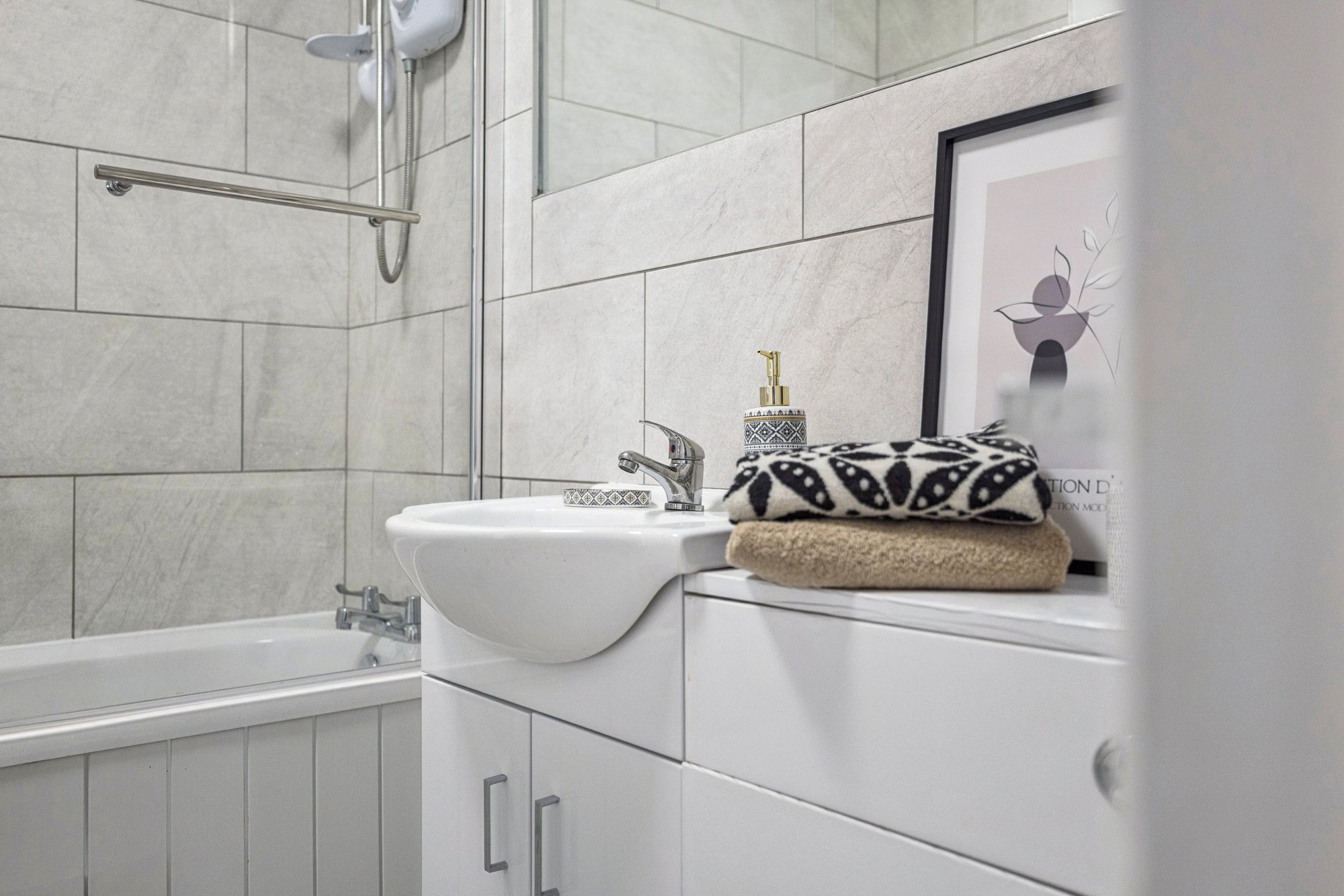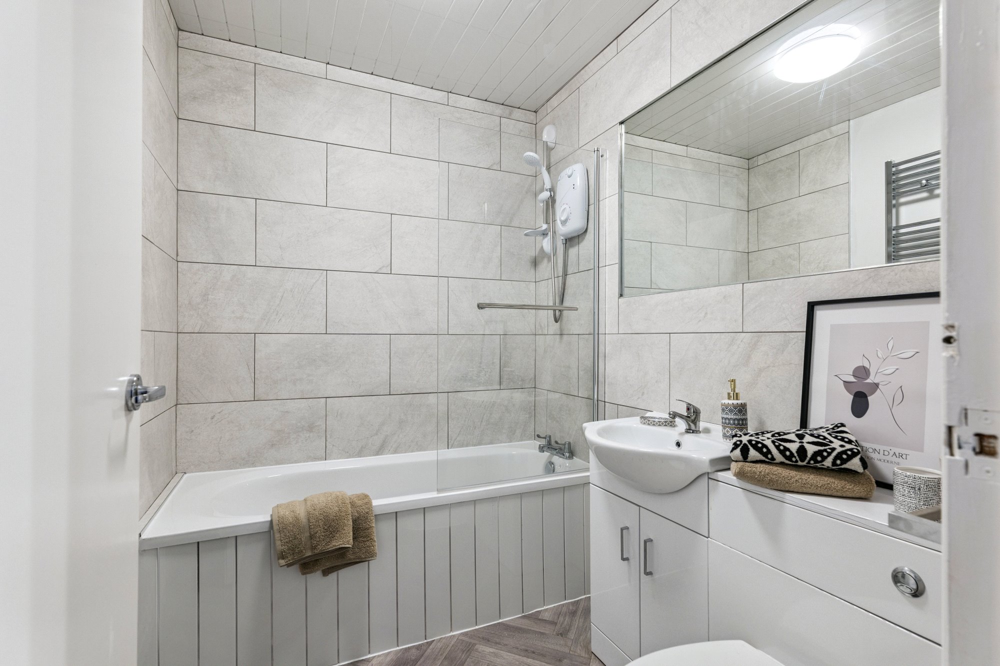 The spacious double bedroom enjoys a bright aspect and comes complete with new carpeting and a built-in mirrored wardrobe. The modern bathroom has been recently refitted with a clean, tiled finish and includes a white three-piece suite with electric shower over the bath.