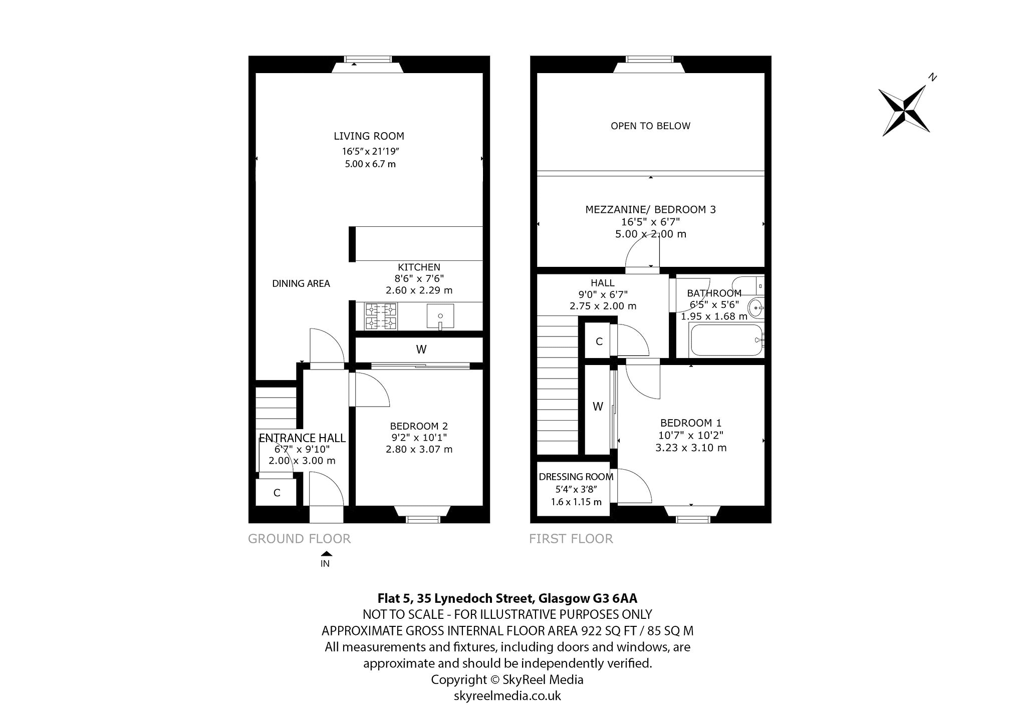 The home for sale is held within the gable elevation of the building and is formed over elevated ground and first floor levels. As you will see from the attached photographs, HD video, floorplan and Matterport Tour – the property is presented in exceptionally good condition and it is instantly plain to see that the current owner has made huge efforts to ensure that the property is maintained to an immaculate standard throughout. In brief the accommodation extends to; entrance hall with storage cupboard and staircase leading off to the upper level, beautiful open plan living, dining and kitchen space with oak flooring, double height vaulted ceiling and a stunning arched window that floods the interior with natural light, ground floor double bedroom with broad bank of mirror fronted, fitted wardrobes. The carpeted staircase then leads to the upper level. Immediately ahead of you at the top of the staircase is the main bathroom with white suite, shower over jacuzzi bath, attractive tiling and amtico flooring. The principal bedroom also has mirror fronted, fitted wardrobes, a separate dressing room area and enjoys a peaceful setting within the rear elevation – overlooking the central courtyard area. Completing the accommodation is a lovely third bedroom which is formed on a mezzanine above the living space – taking light and enjoying views from the forementioned arched window.