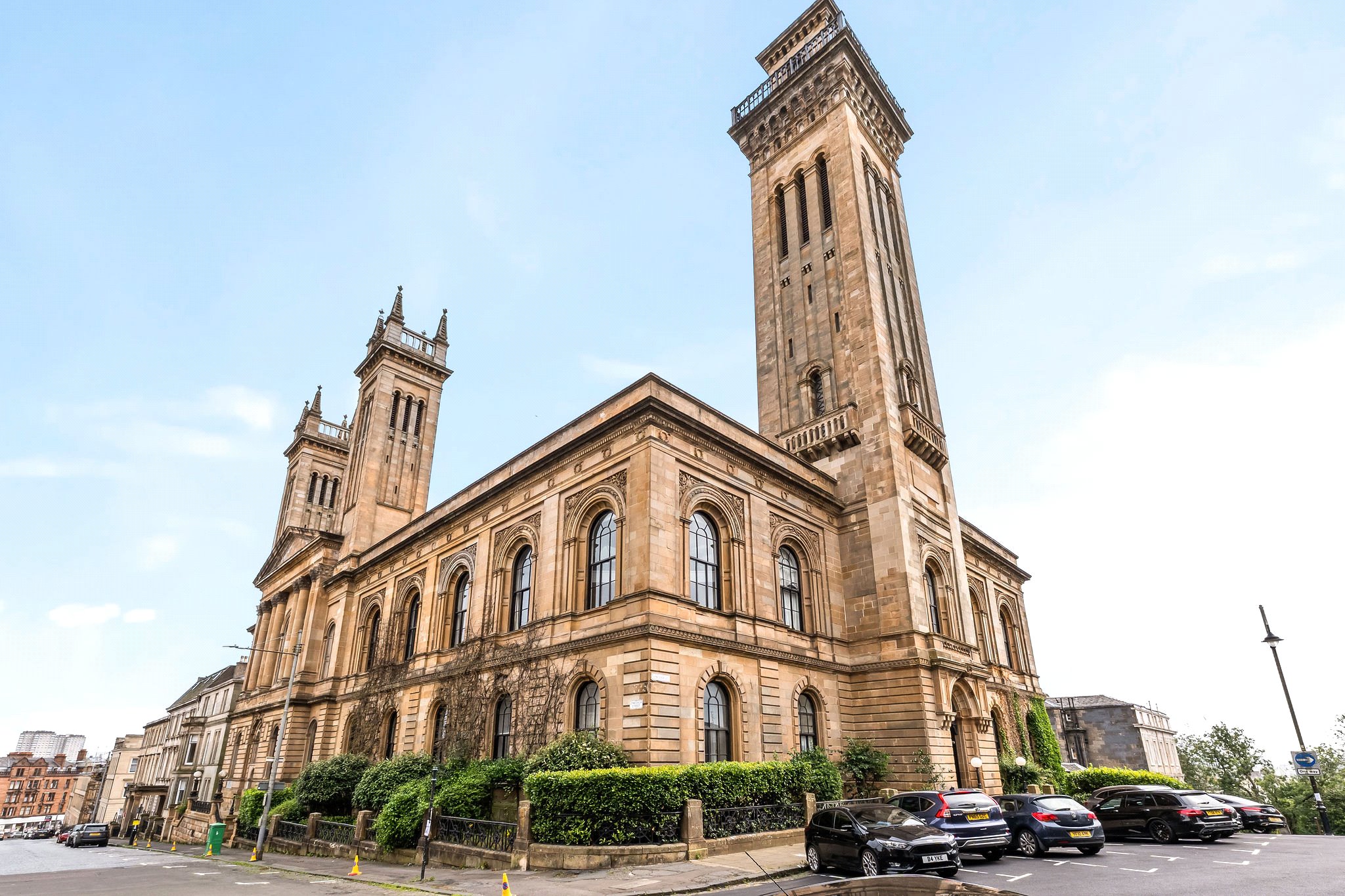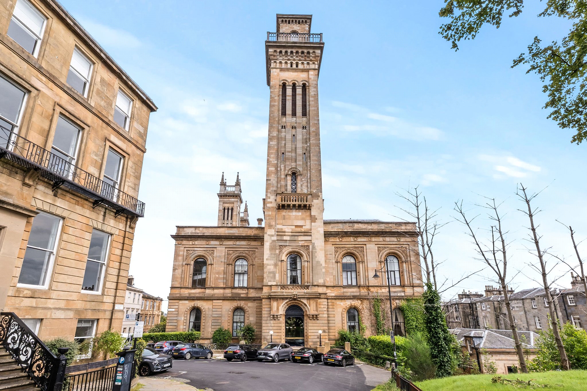 The building at 35 Lynedoch Street is known as Trinity House and was once described as 'an example of the finest piece of architecture of the mid-19th century'. Designed by the renowned architect Charles Wilson who also planned the layout of the neighbouring terraces in the area, the building was originally opened in 1857 as a Free Church College. Later in the 1980s the building was transformed into 21 private dwellings. Residents parking permits can be obtained from the local authority on an annual basis.
