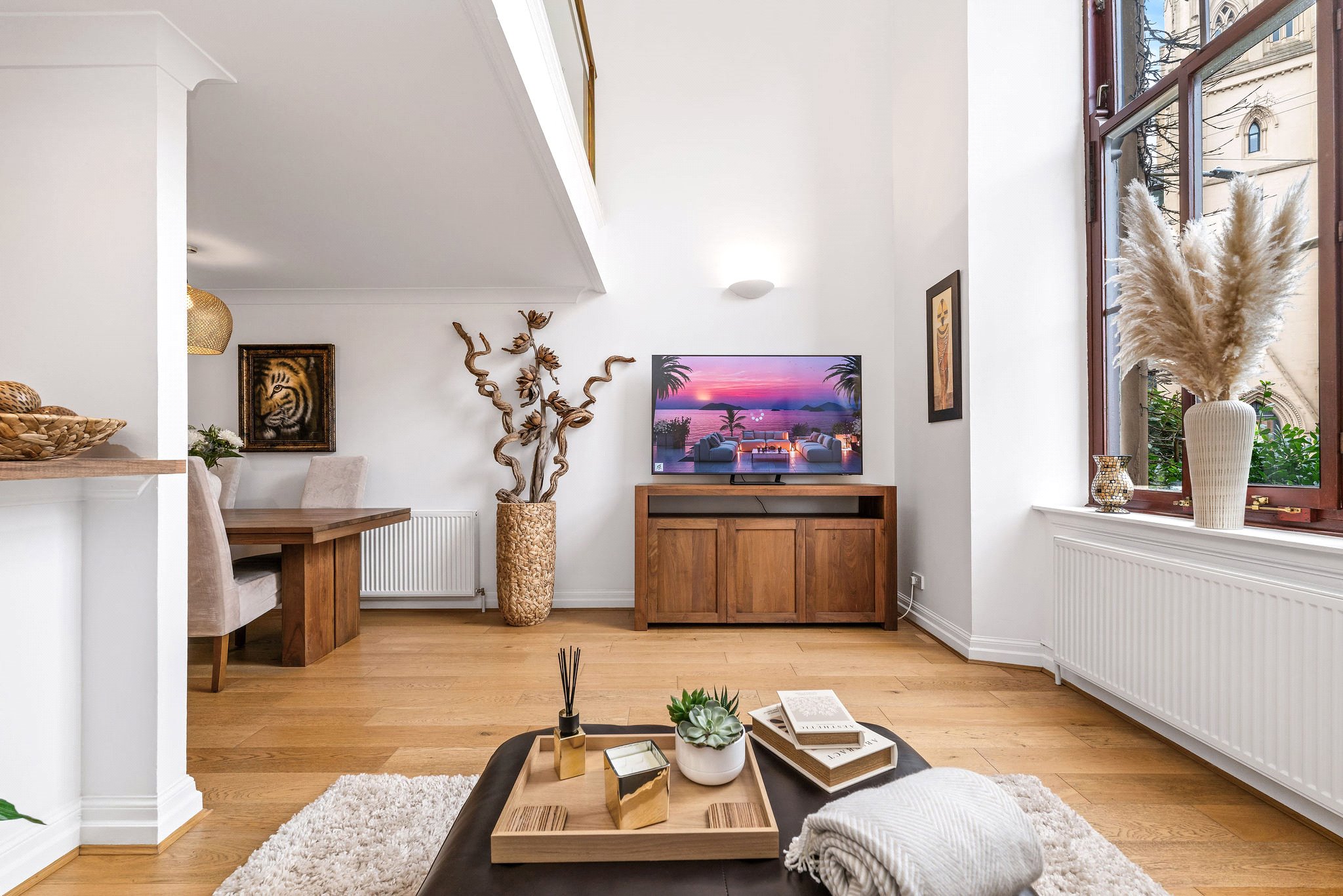 - Impressive arched window flooding the space with natural light