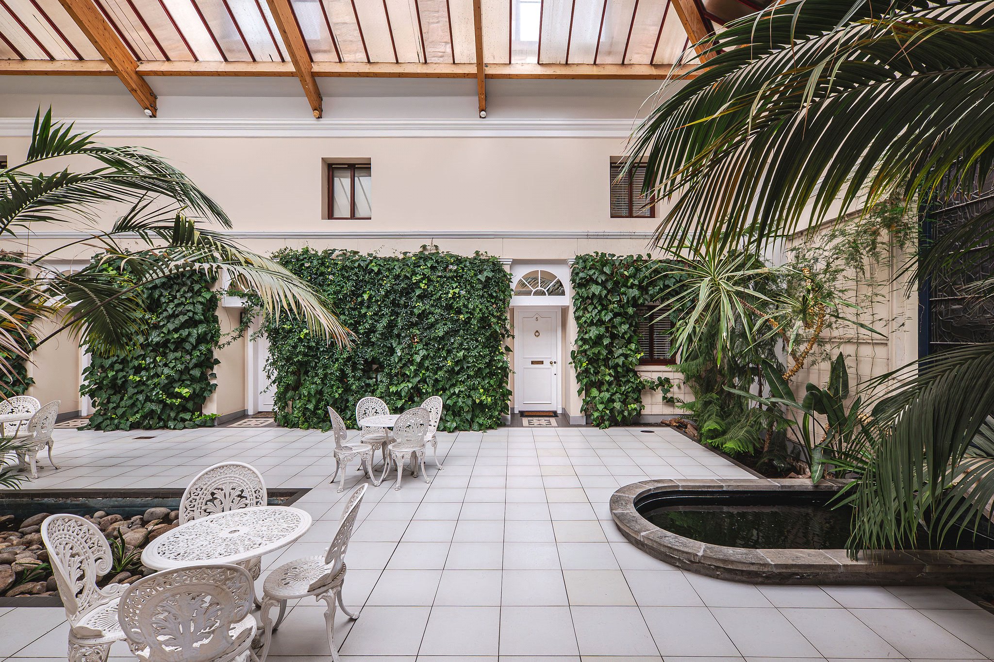 - Striking communal atrium with water feature and botanical-style hallway