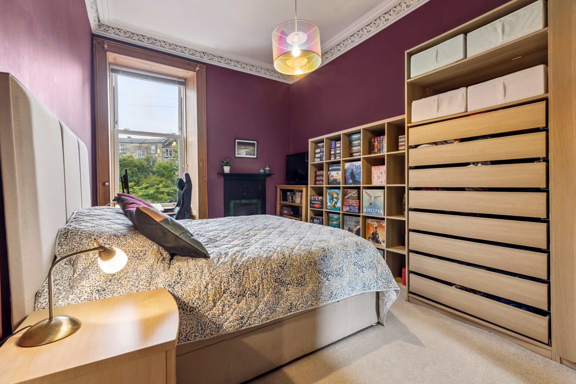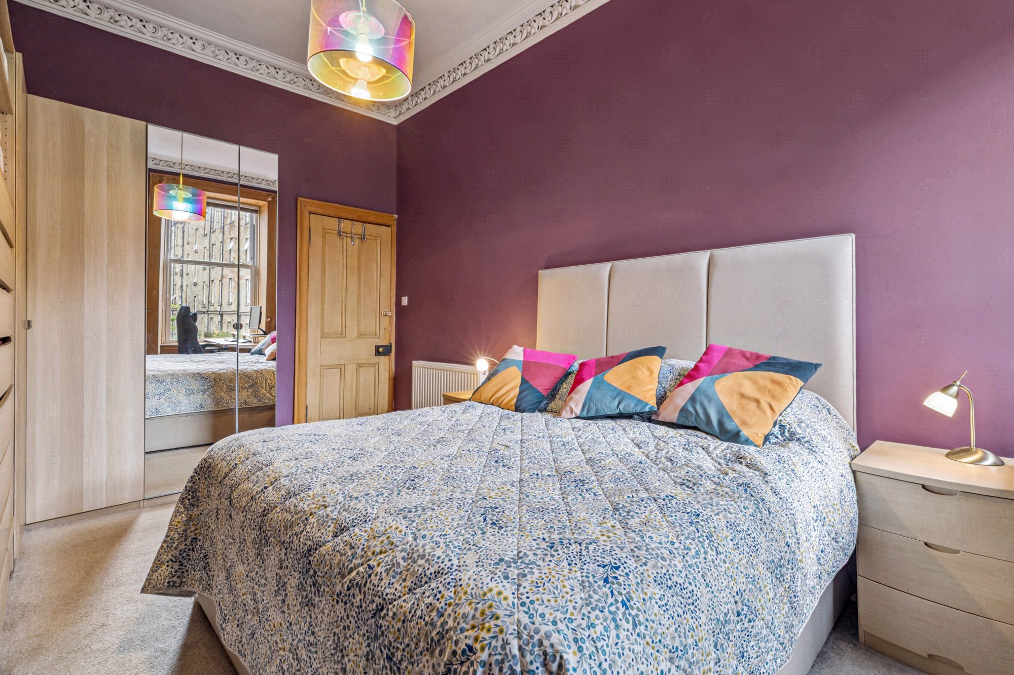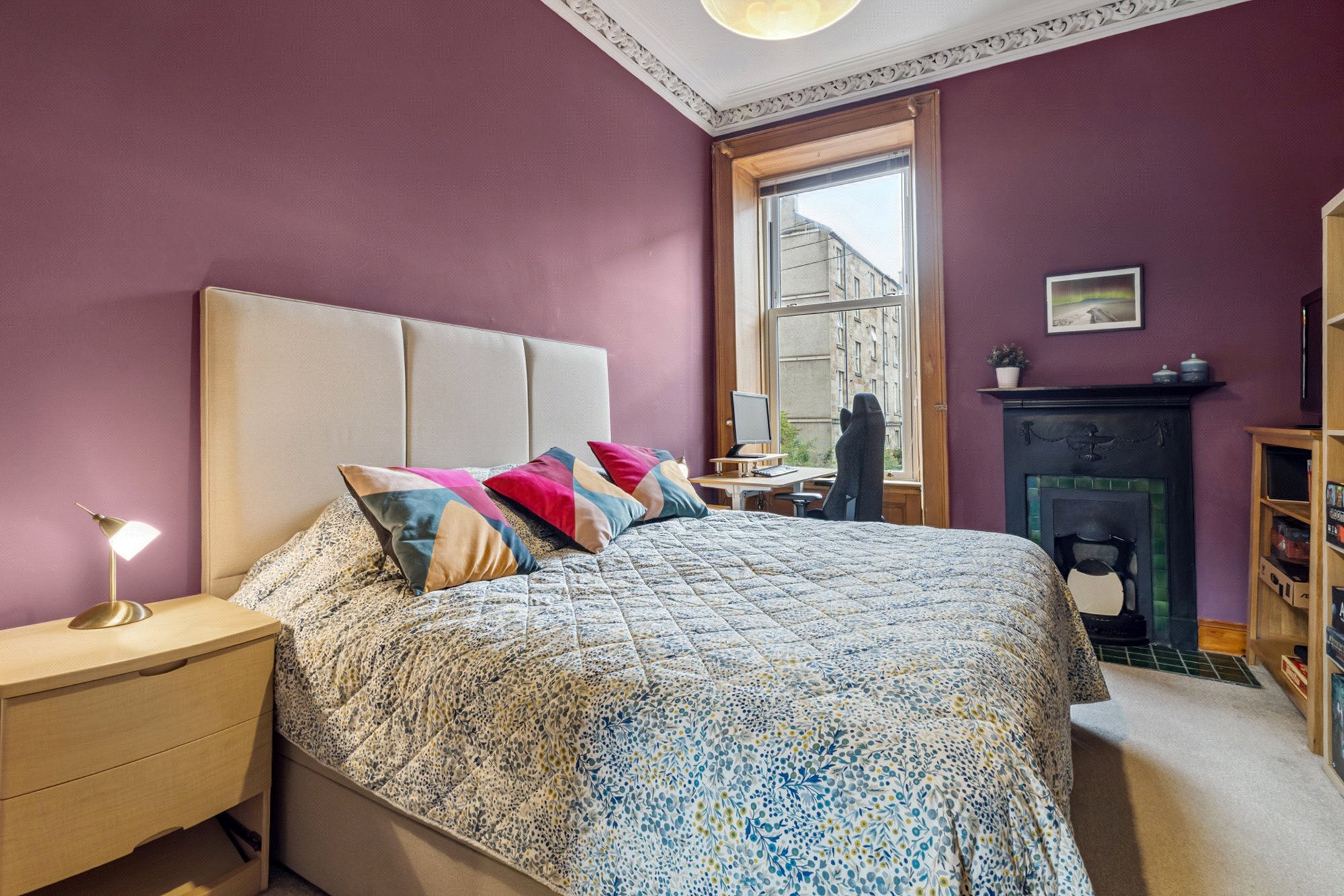 - Bedroom one with window to the front, ceiling cornice and focal point fireplace