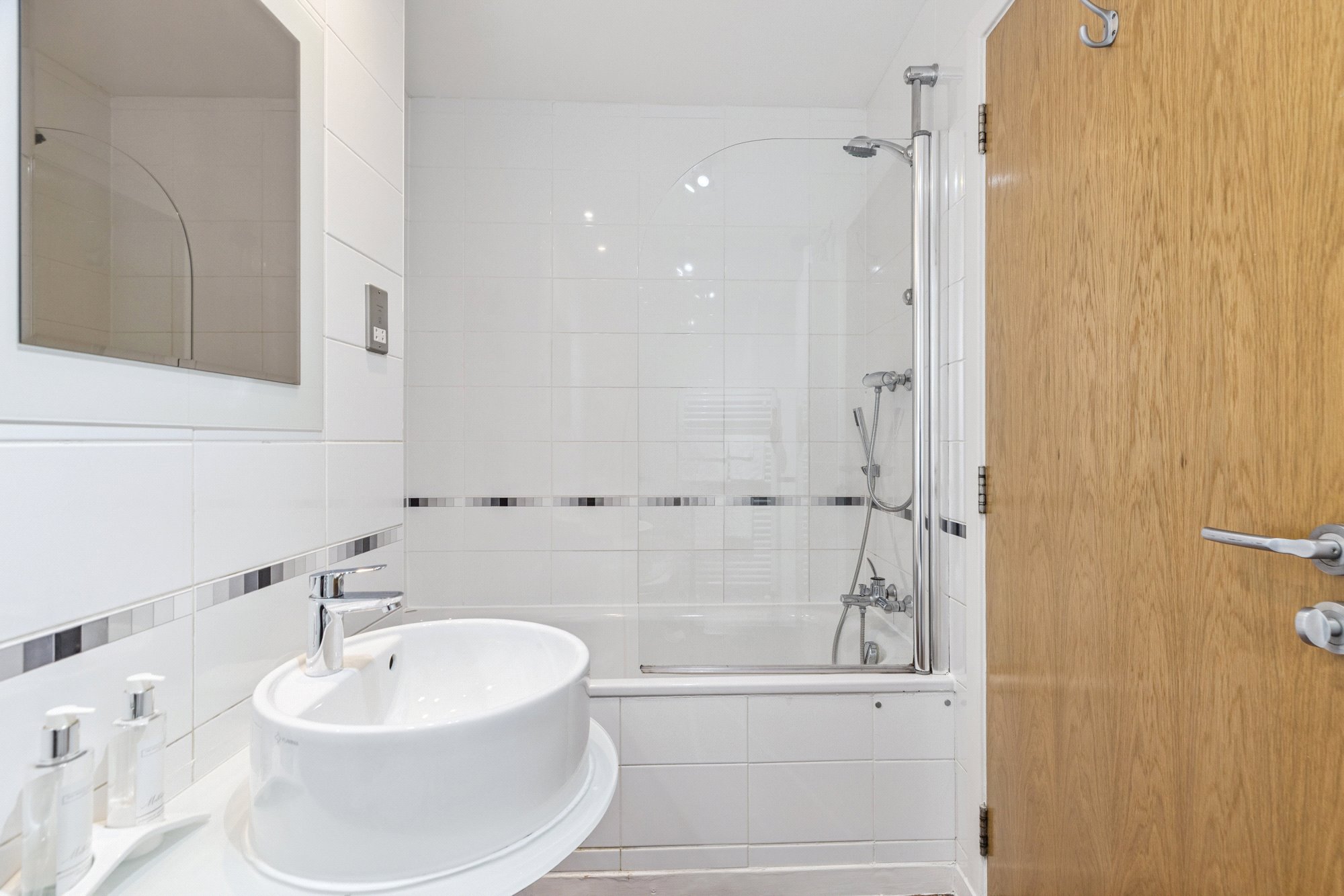 - Stylish three-piece bathroom comprising bath, over bath shower, toilet and wash hand basin