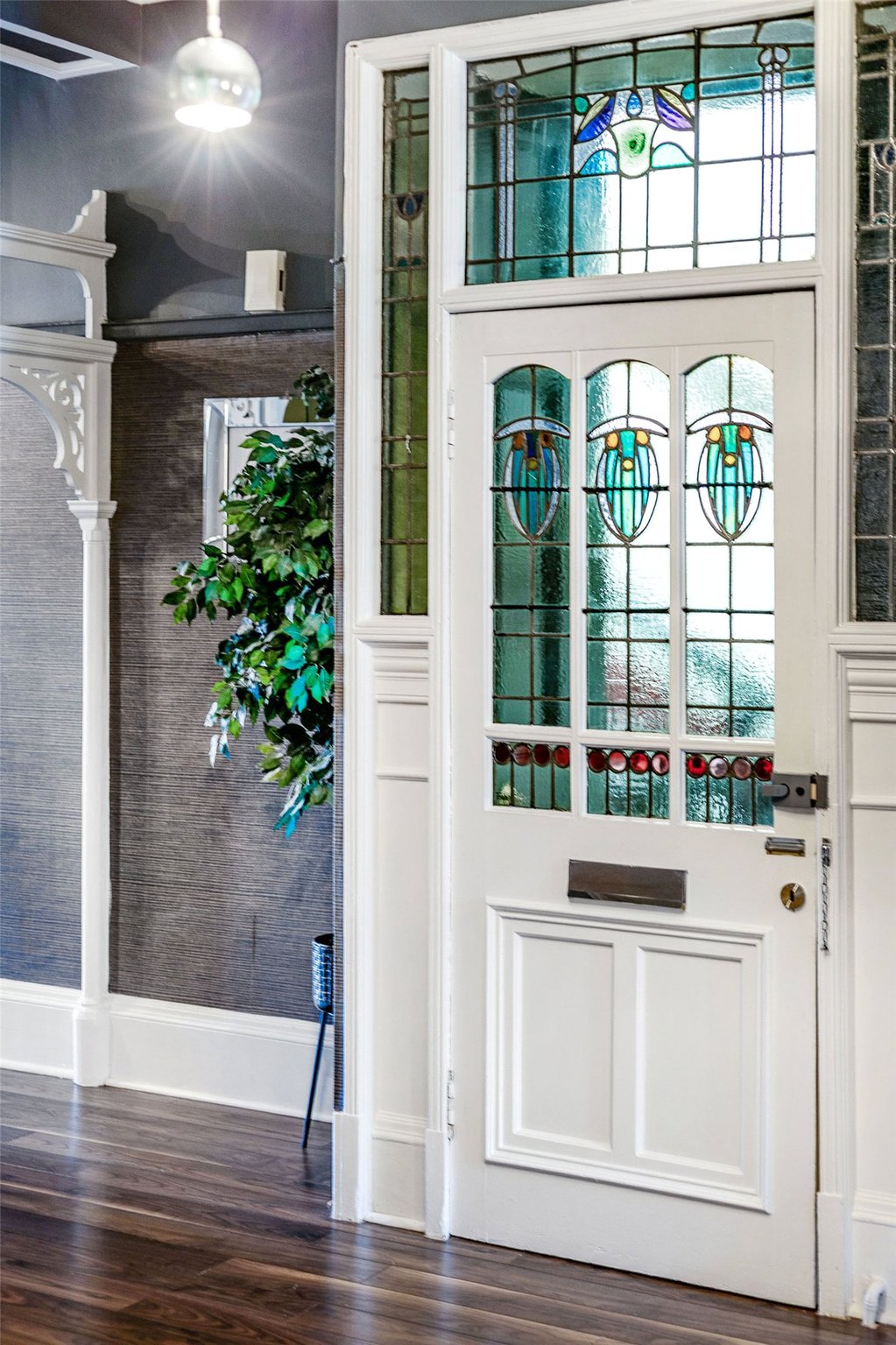 An imperative dedicated utility room sits just off the kitchen, providing valuable separation for laundry and additional storage. There is also a separate cloakroom, ensuring adequate convenience to cater for daily life. A well considered work from home space offers flexibility, whether as a study, reading nook or home office, in addition to a number of additional cupboards and storage options positioned throughout the property. The welcoming hallway is particularly noteworthy, enhanced by attractive stained glass features which adds colour, character and make a strong impression upon arrival.