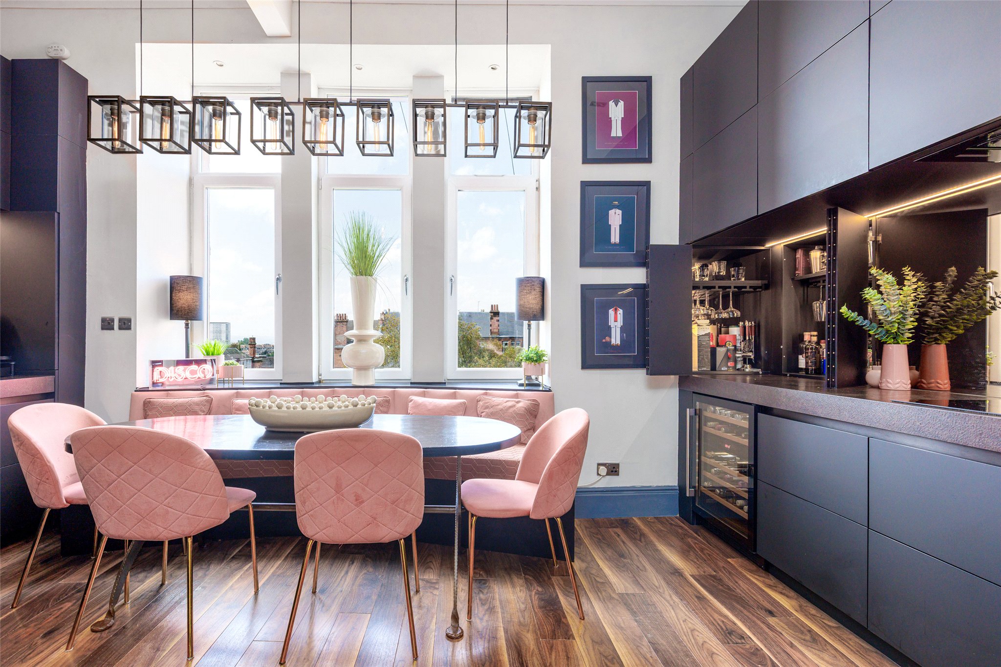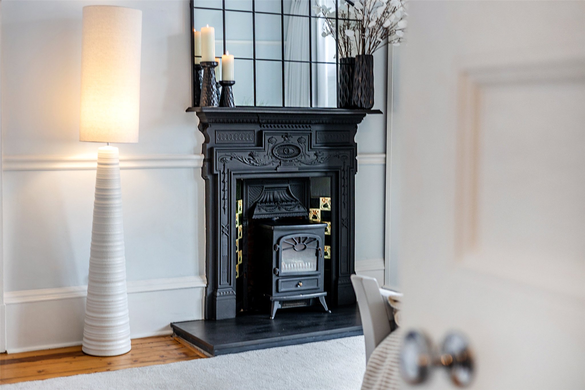 The showpiece of this home is the gorgeous front lounge; a broad three section bay window equipped with plantation shutters affords charming views up and down Falkland Street. The windows are framed by a curved archway and flanked by two prominent twin columns, perfectly complimenting the beautiful d?cor and exuding a tremendous sense of grandeur and traditional charm. The property has been very sensibly arranged, with a stylish contemporary dark monochrome dining kitchen illuminated by three rear windows and accented by cubic pendant lighting and fetching modern finishes. The kitchen offers ample space for dining and has been carefully designed to combine strong visual appeal with everyday practicality, complete with integrated appliances and excellent worktop space.