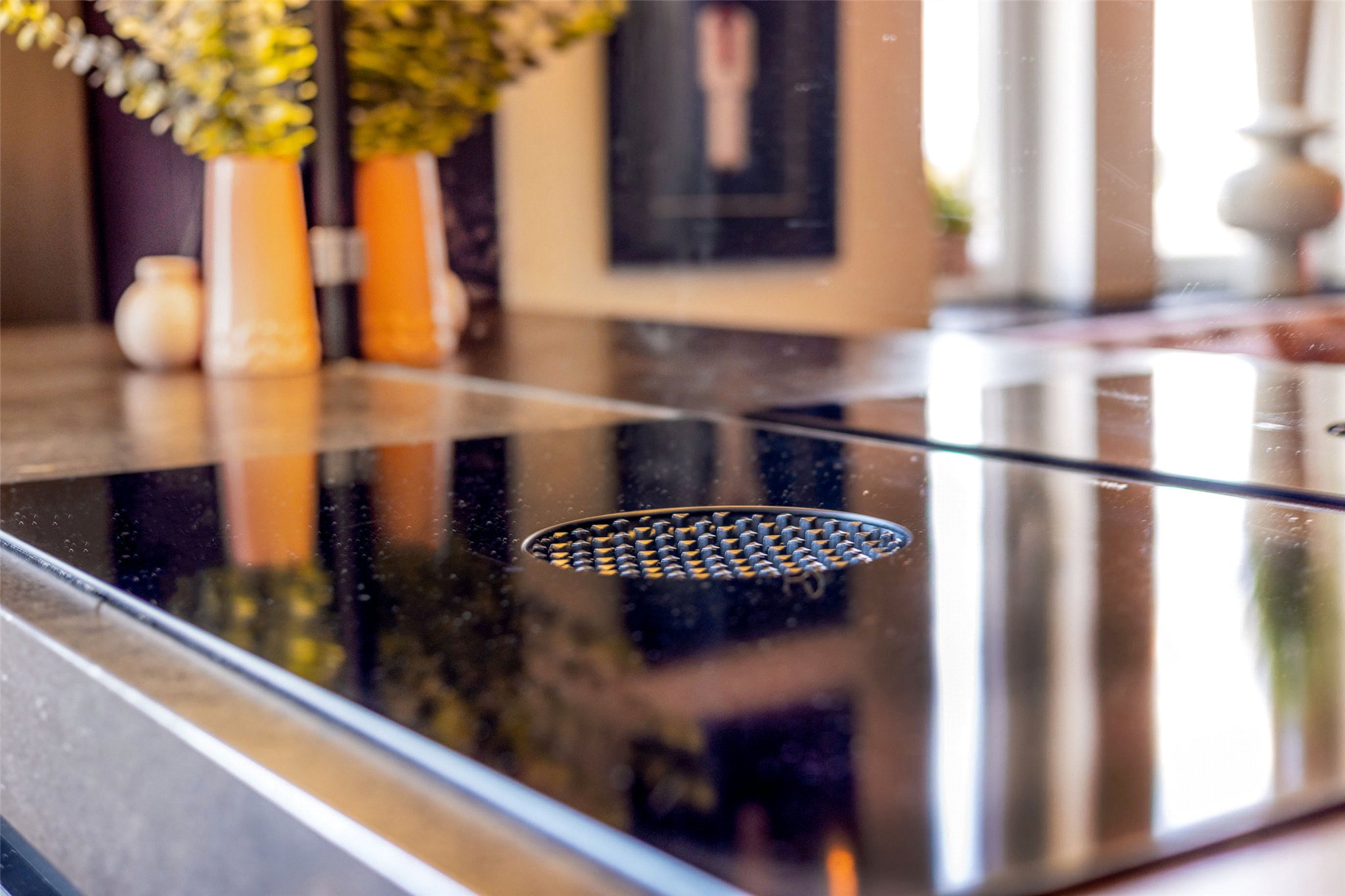 - Striking dining kitchen with “nocturne” toned sleek cabinetry, integrated appliances and dark counter tops matching similarly themed wall tiling, with three section window to the rear beside ample dining space.