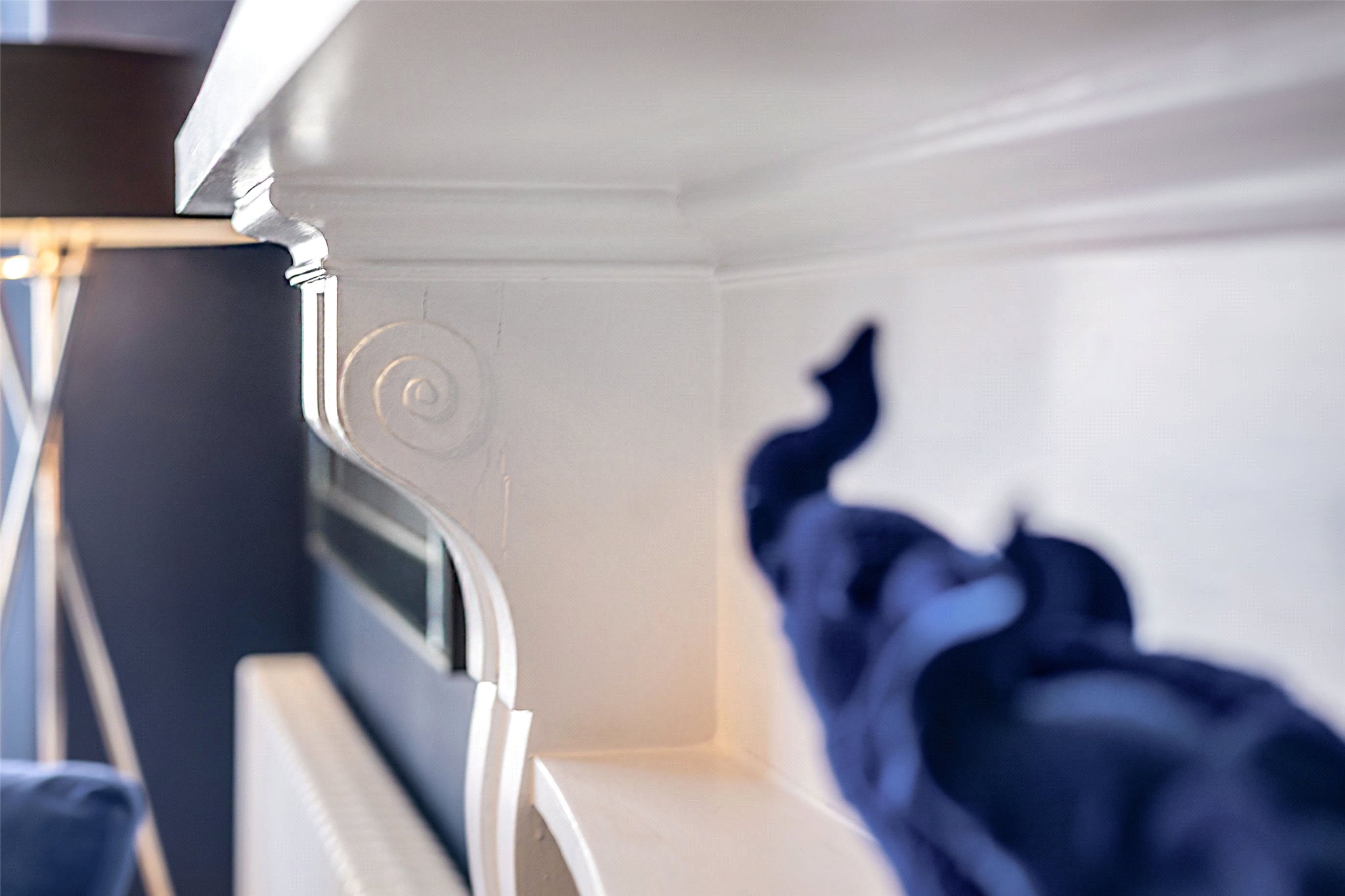 - Spacious principal bedroom with lovely ceiling cornice, three section window to the front with plantation shutters, focal fireplace and hardwood flooring.
