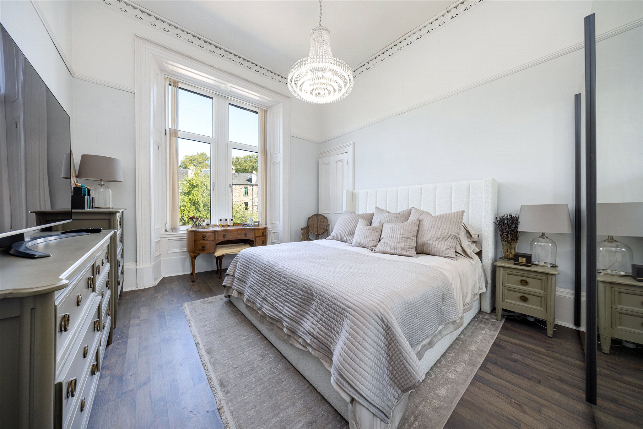 - Principal (main) bedroom with double section window to the front, detailed cornice and centre ceiling rose.