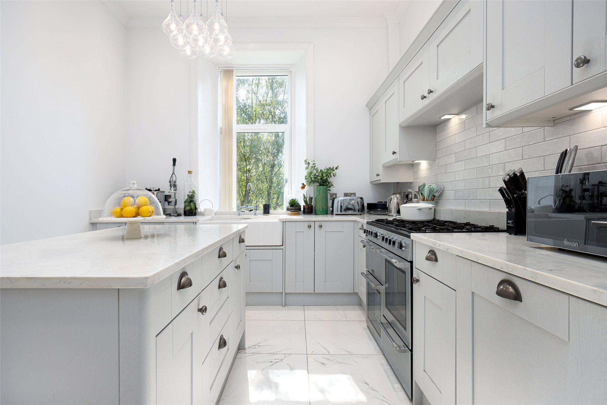 - Gorgeous fitted kitchen with marble counter tops, range cooker, superb breakfasting/dining island, integrated appliances, Belfast sink and tall window to the rear.