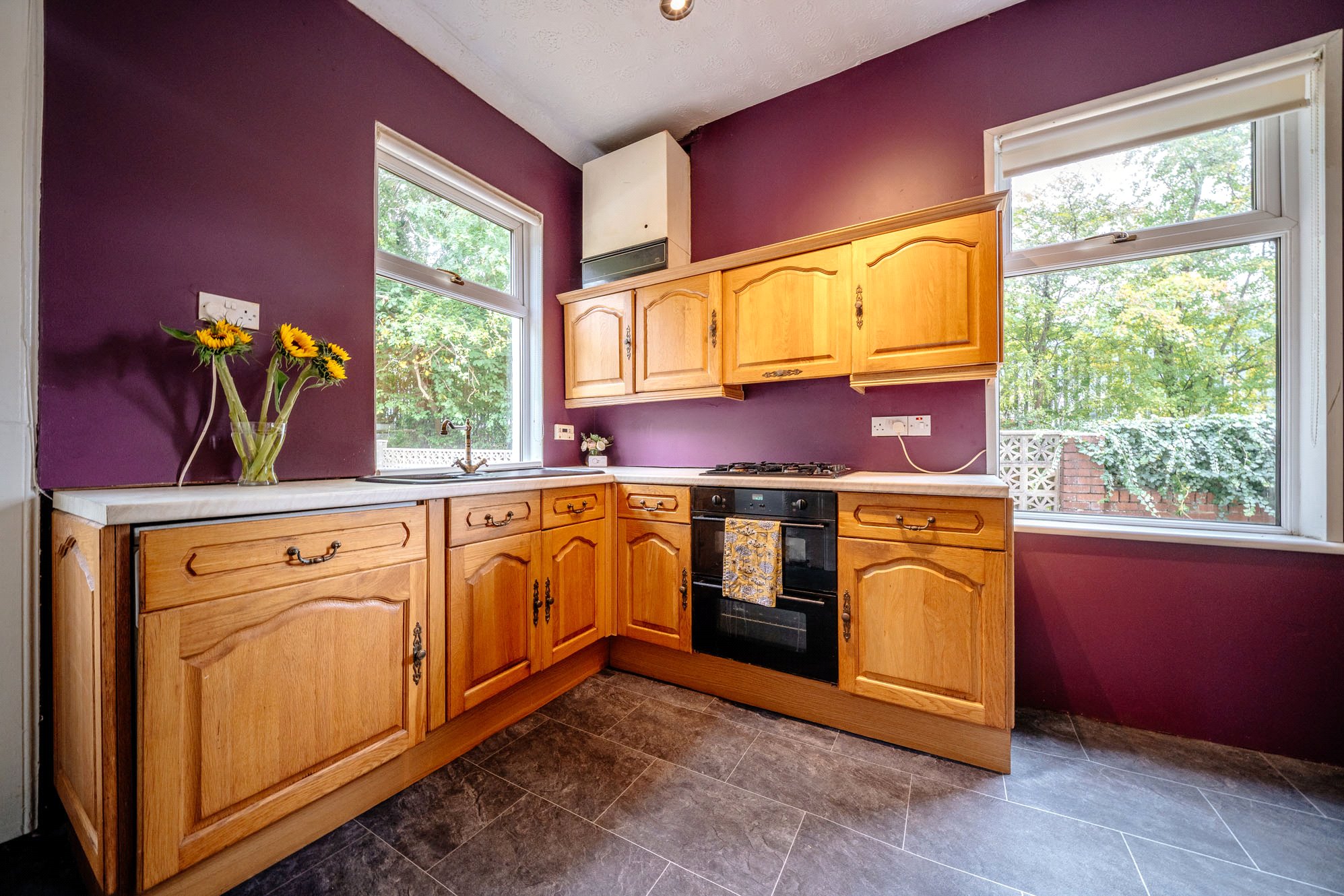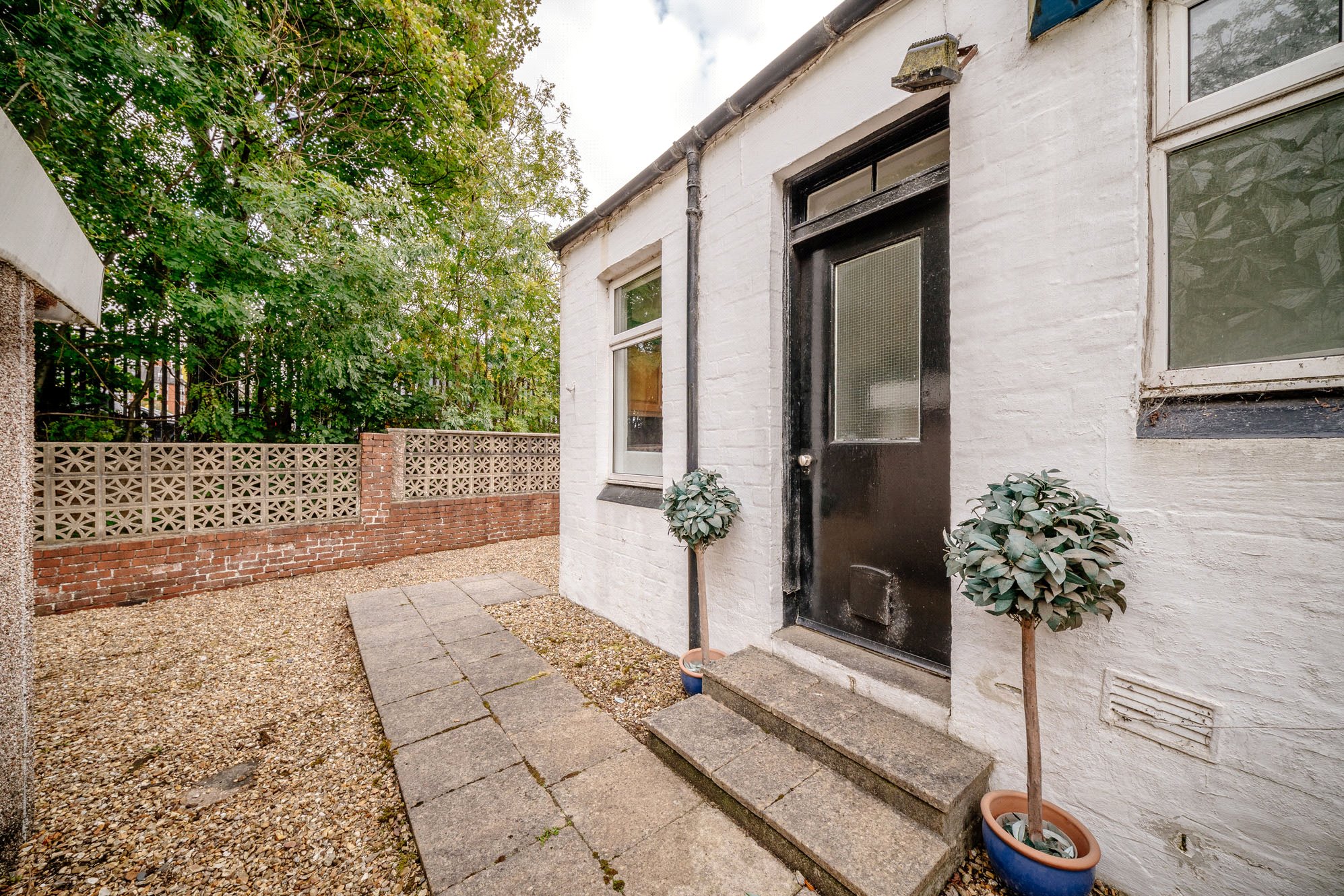 The property for sale is an attractive blonde sandstone, two-storey end-terrace villa set within a generous plot against a backdrop of mature woodland that leads to the local nature trail, which eventually connects with Victoria Park. The surrounding chipped garden grounds are designed for ease of maintenance and are enclosed by neat red and traditional brick perimeter walls with black-painted steel ladder style inlays. At the rear, there is a detached garage.