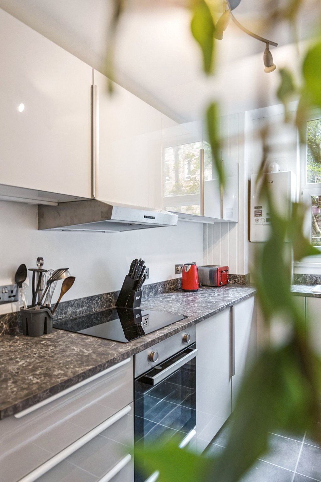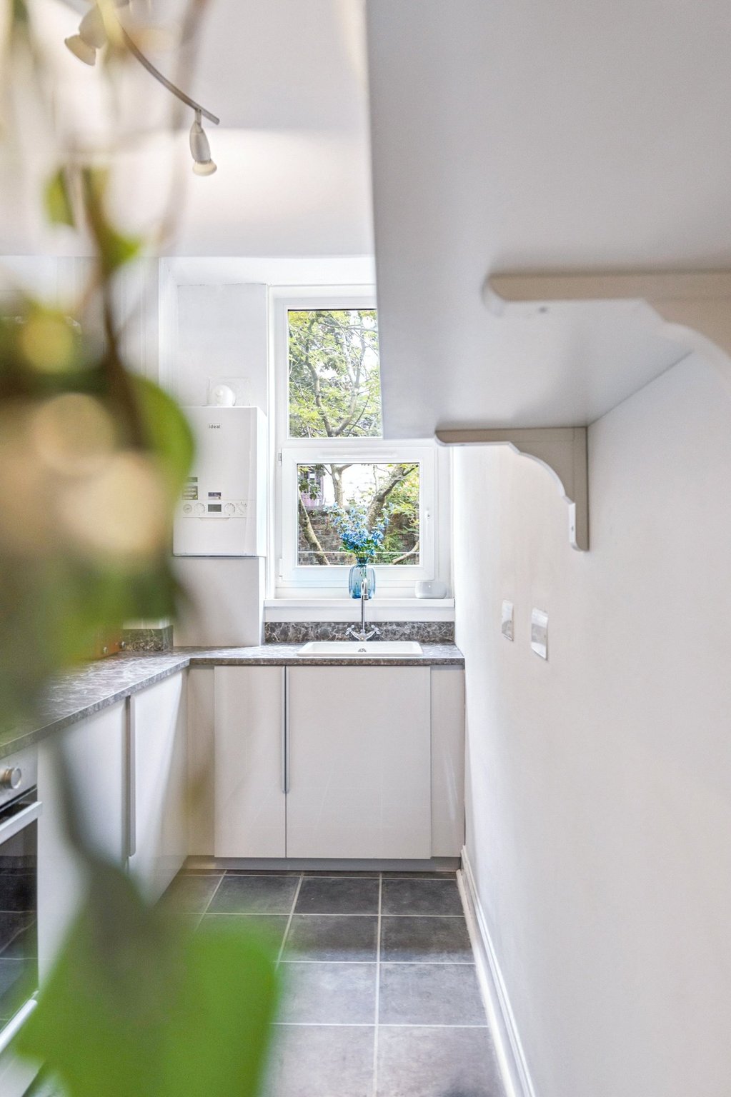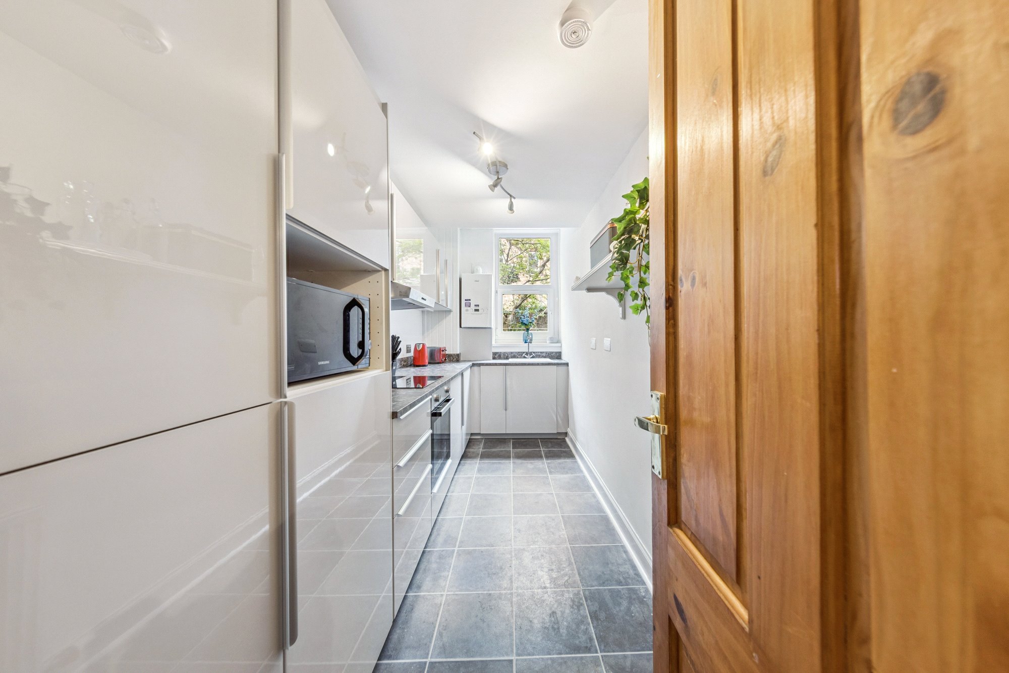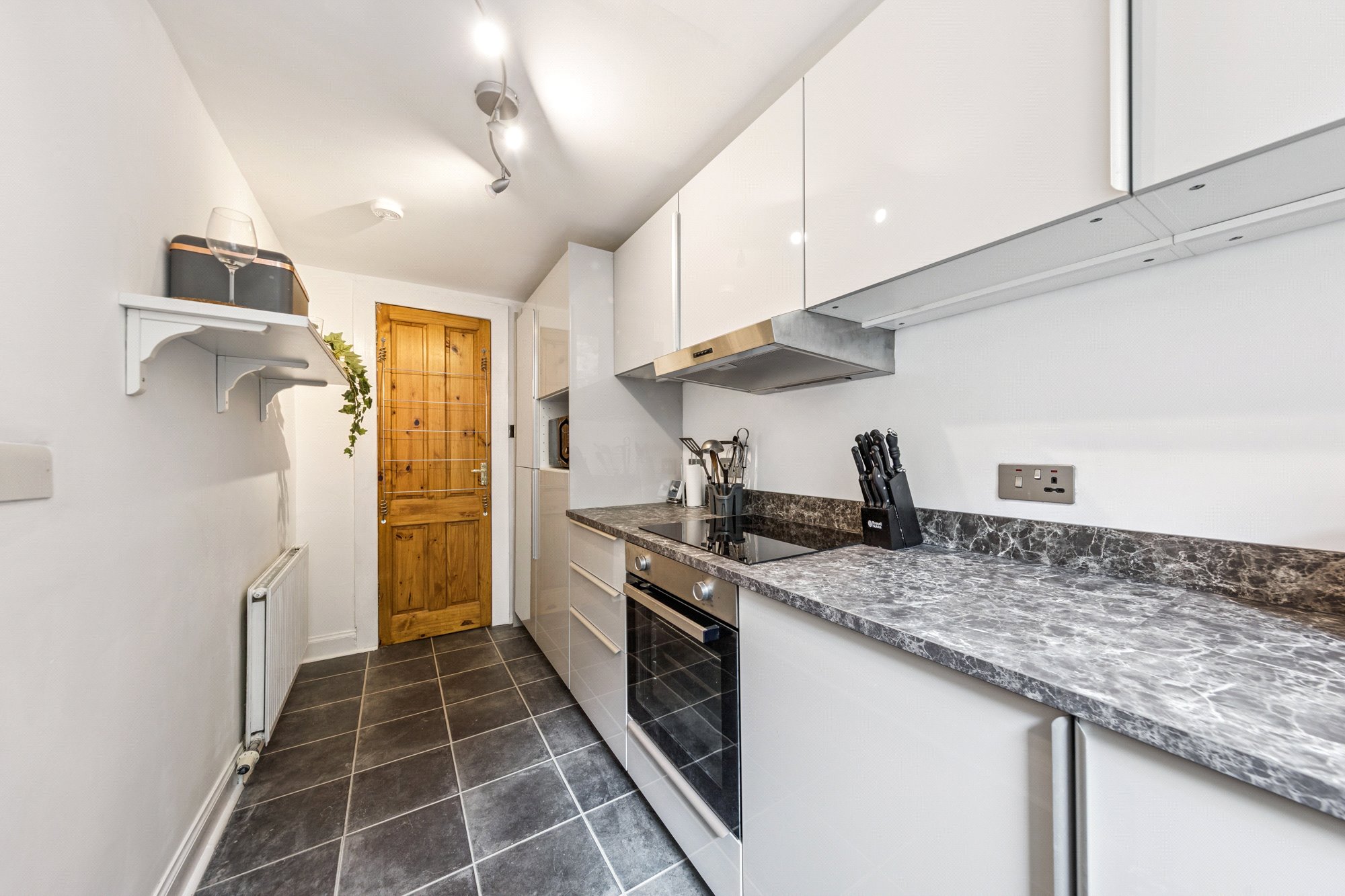 - Stylish galley kitchen with newly fitted units and integrated appliances