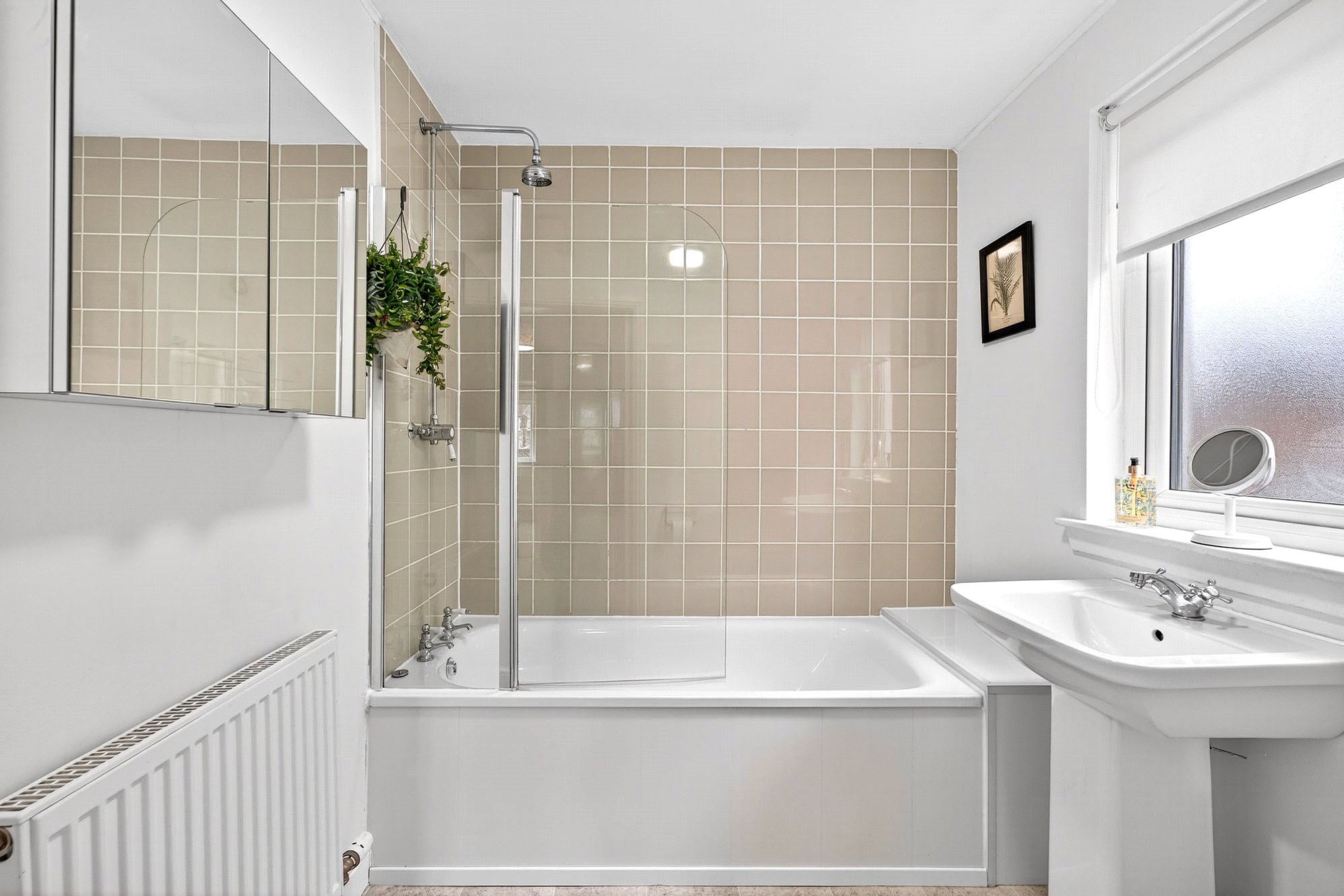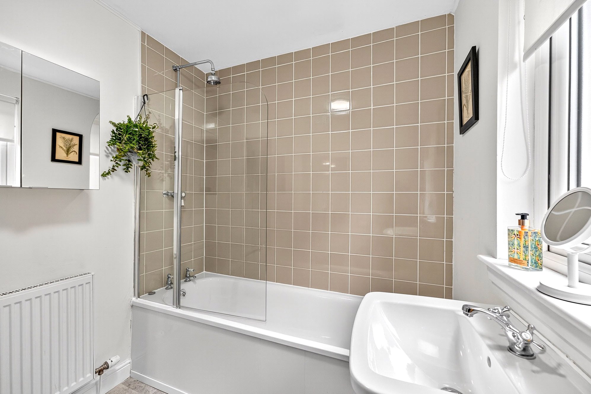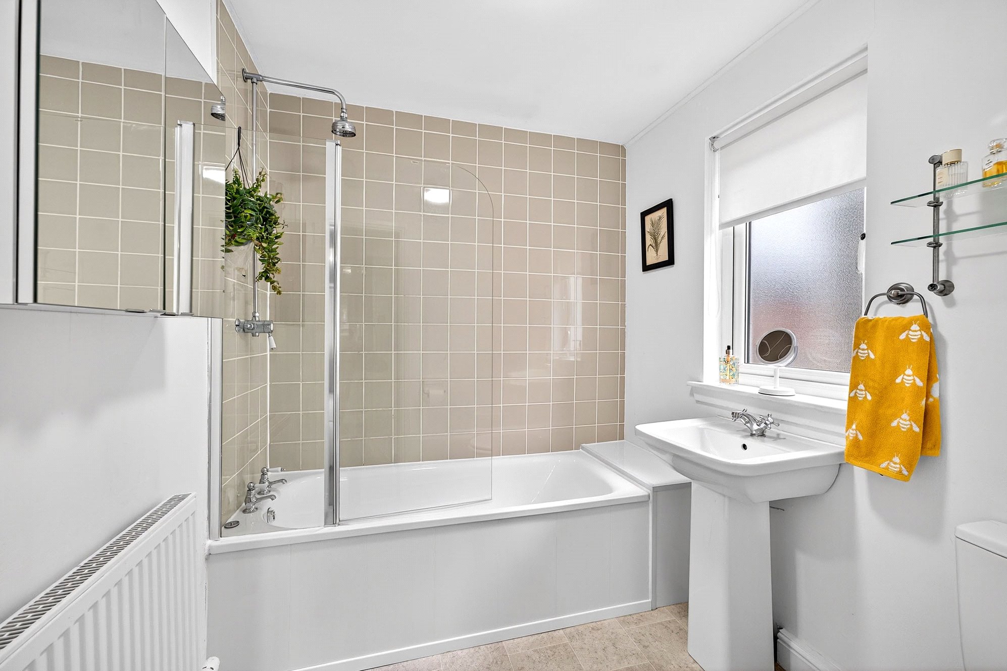 - Bright family bathroom with shower over bath