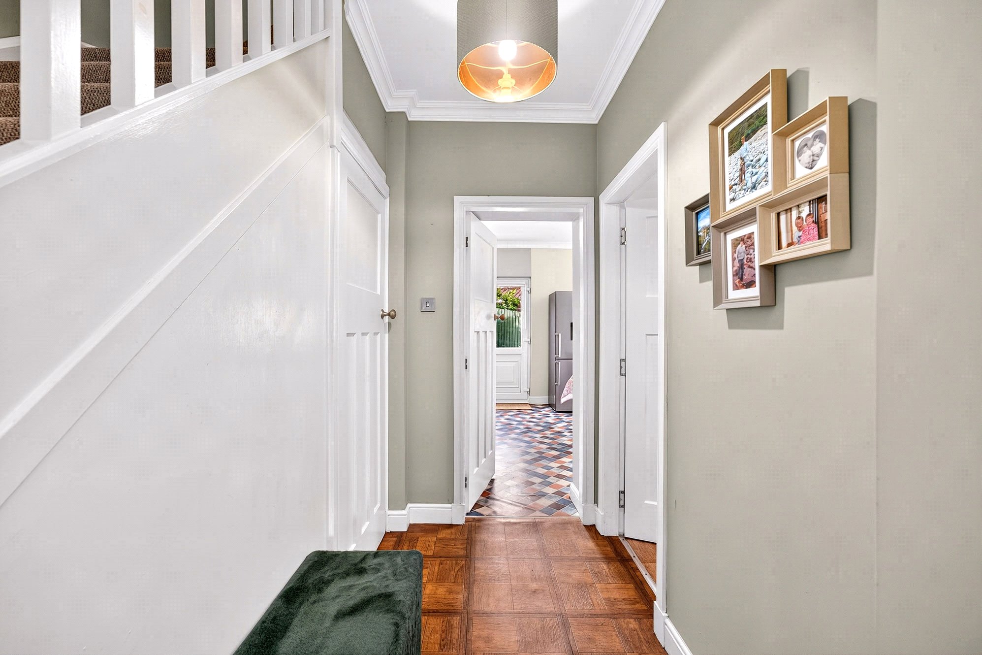 On the upper level, the property continues to reveal its impressive proportions, offering three comfortable double bedrooms and a broad family bathroom with white suite, neutrally coloured tiling, and a shower over bath. The upper landing itself is roomy, providing space for a home study or office area.