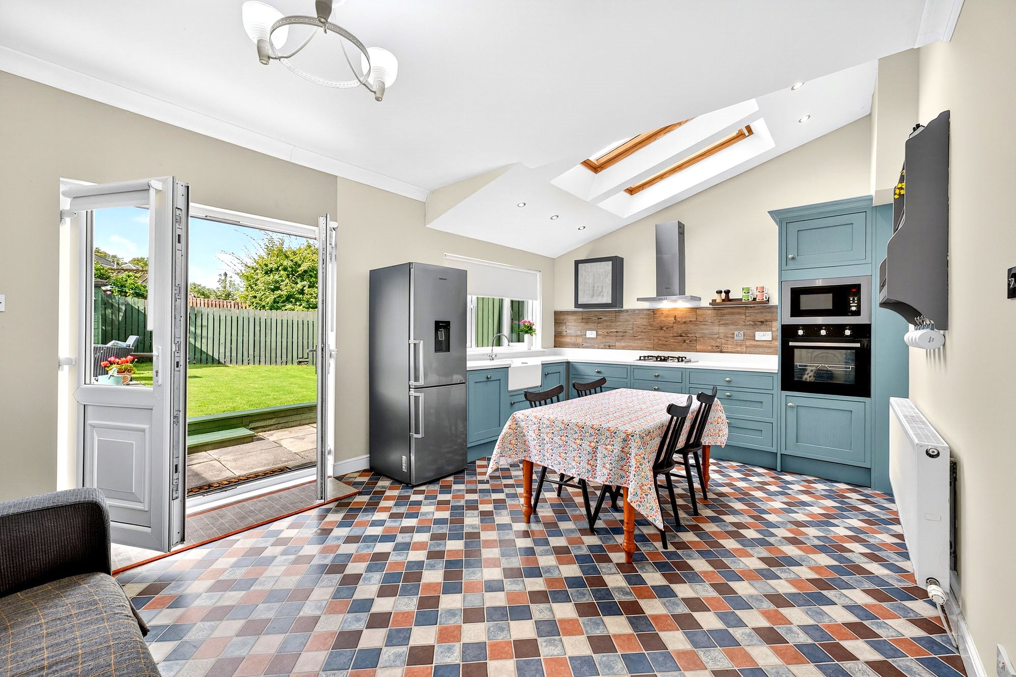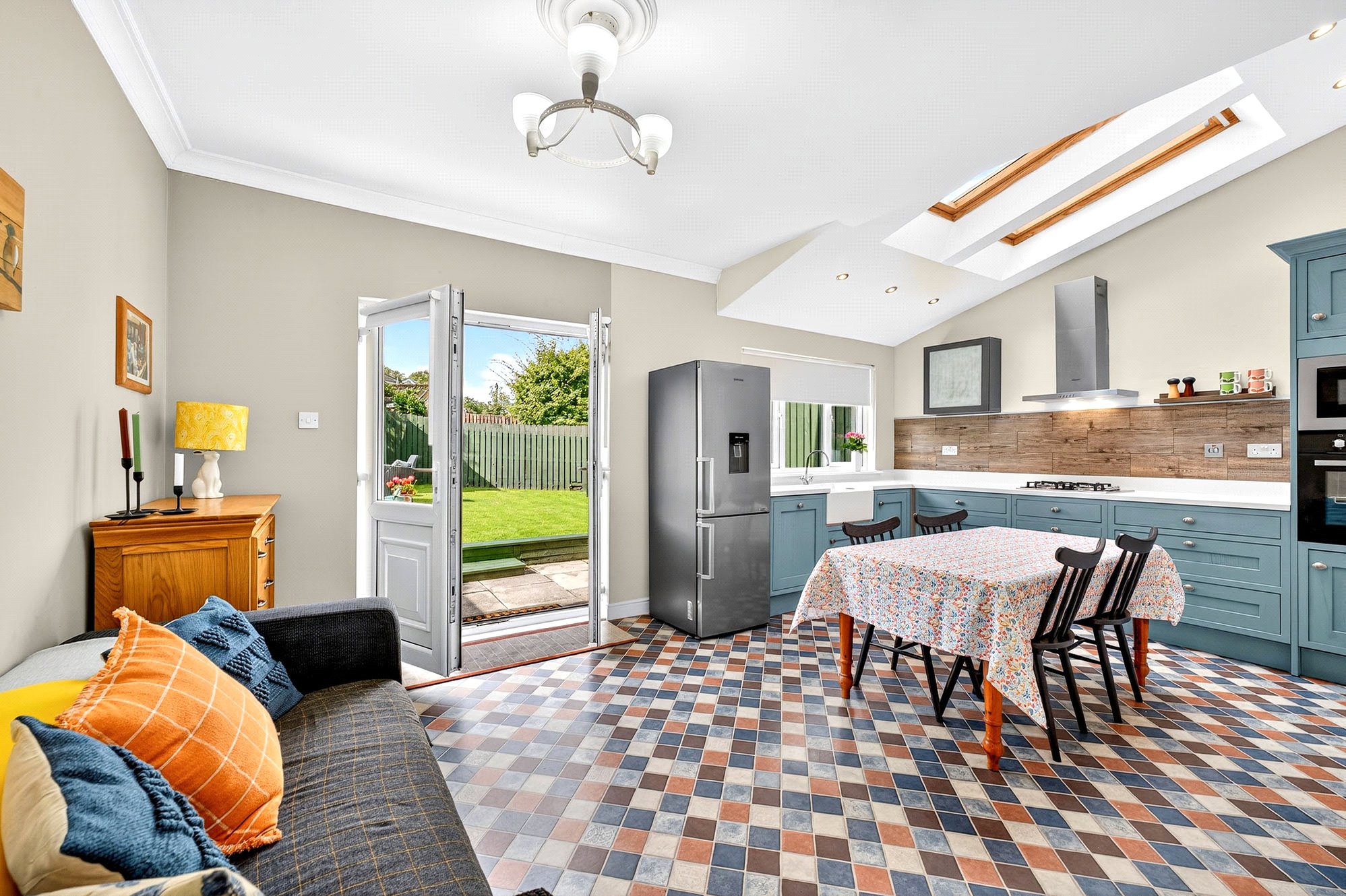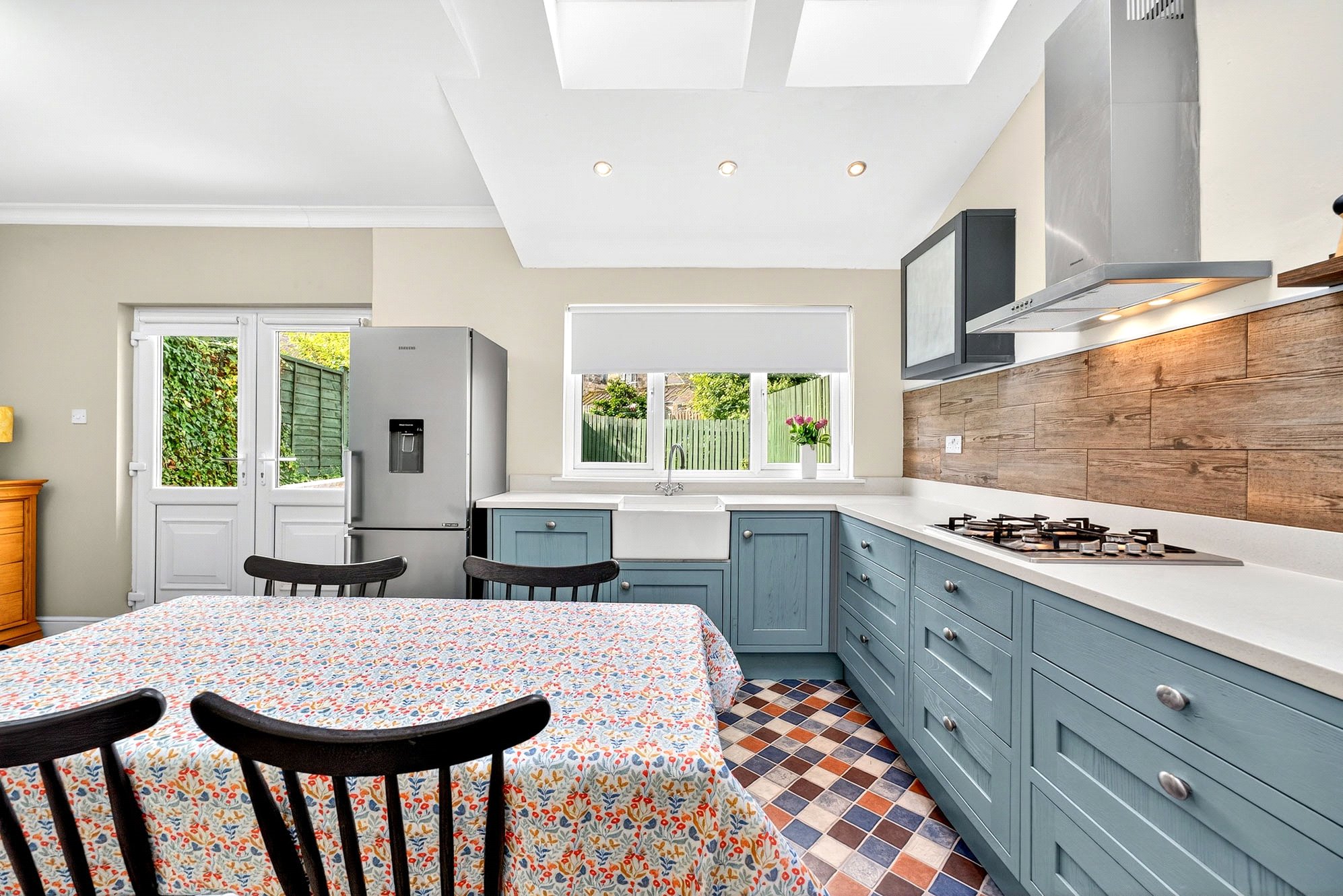- Spacious, full-width dining kitchen with French doors and Velux windows