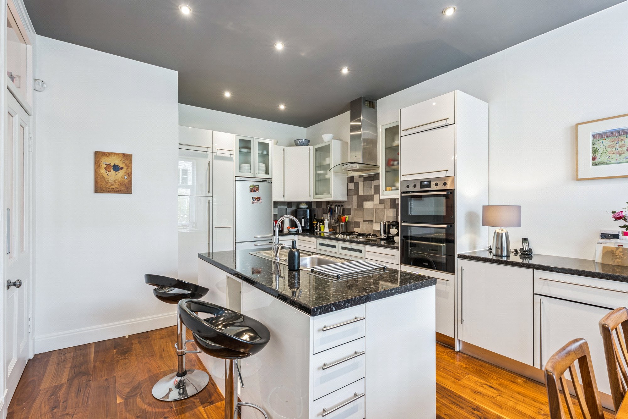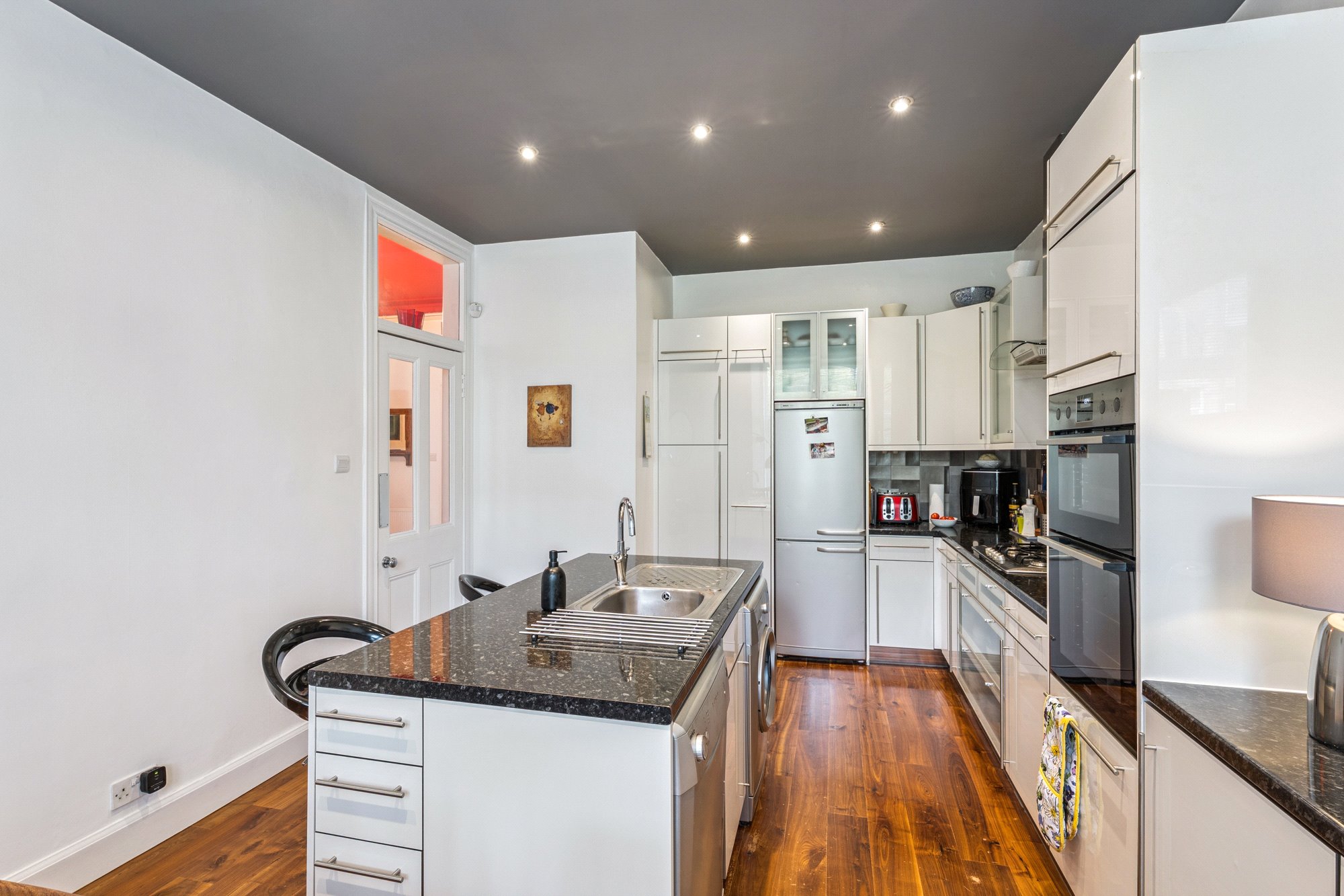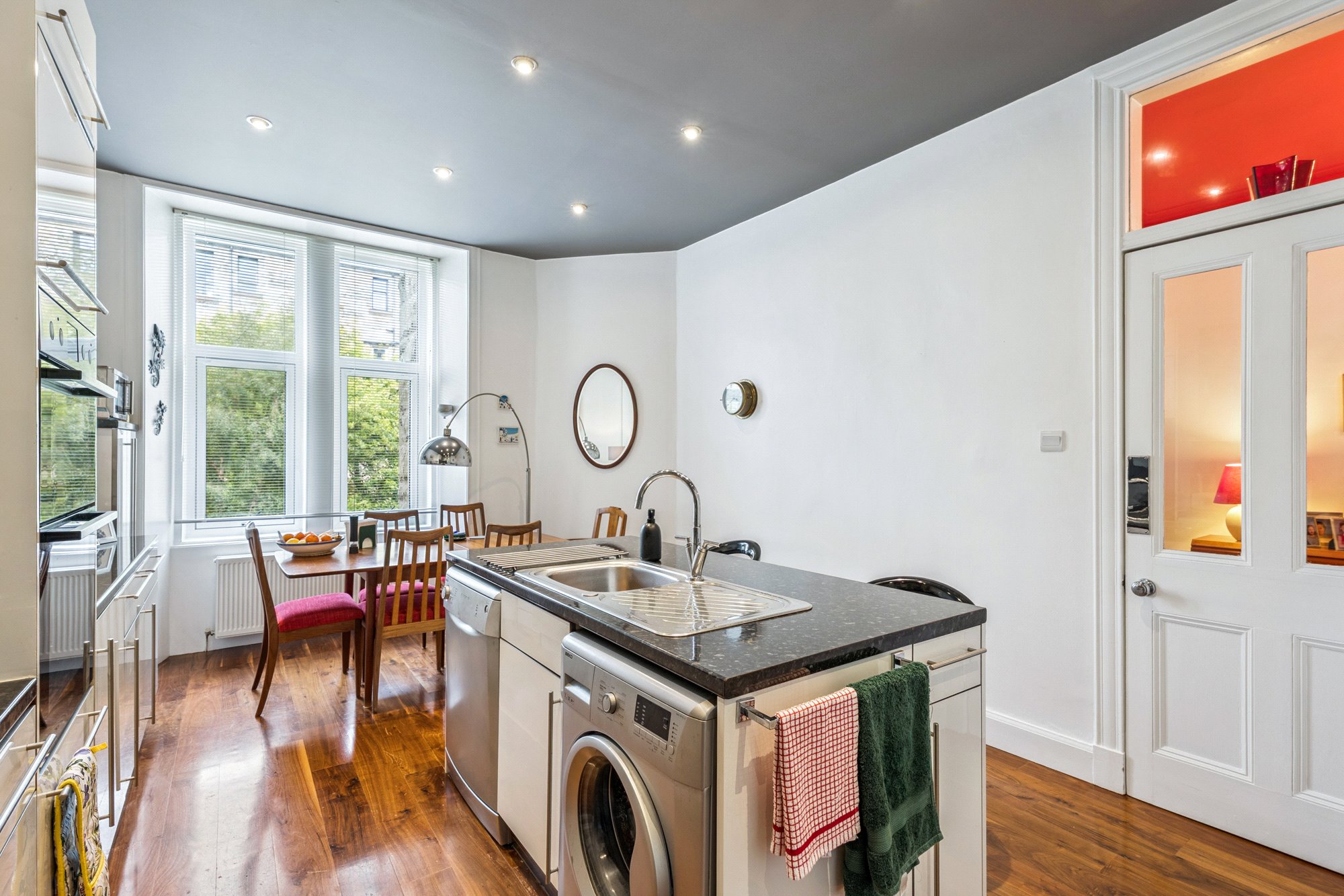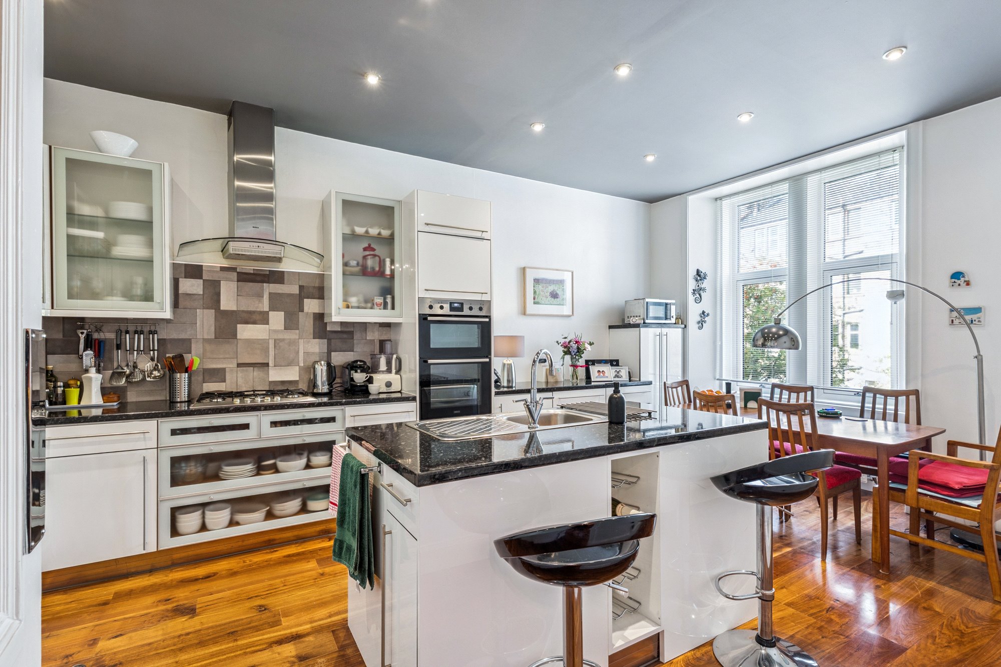 The apartment itself is a fine example of its type, combining period character with thoughtful modern upgrades. The accommodation is bright, spacious, and well-balanced, with impressive ceiling heights and large windows that flood the interior with natural light throughout the day. In brief, the layout extends to: welcoming entrance hall with storage cupboard, a beautiful South-facing lounge with bay window and open outlook across the park, two substantial king-sized bedrooms (one to the front, one to the rear), and a much-improved dining kitchen. The kitchen has been redesigned and refitted to include a central island and a generous dining area that easily accommodates an eight-seater table – perfect for entertaining. Of particular note, the property benefits from an enhanced bathroom, where the former scullery space has been incorporated to create a luxurious four-piece suite with bath and large double shower. The result is a home that retains all the grace of a traditional West End tenement while offering upgraded spaces for modern living.
