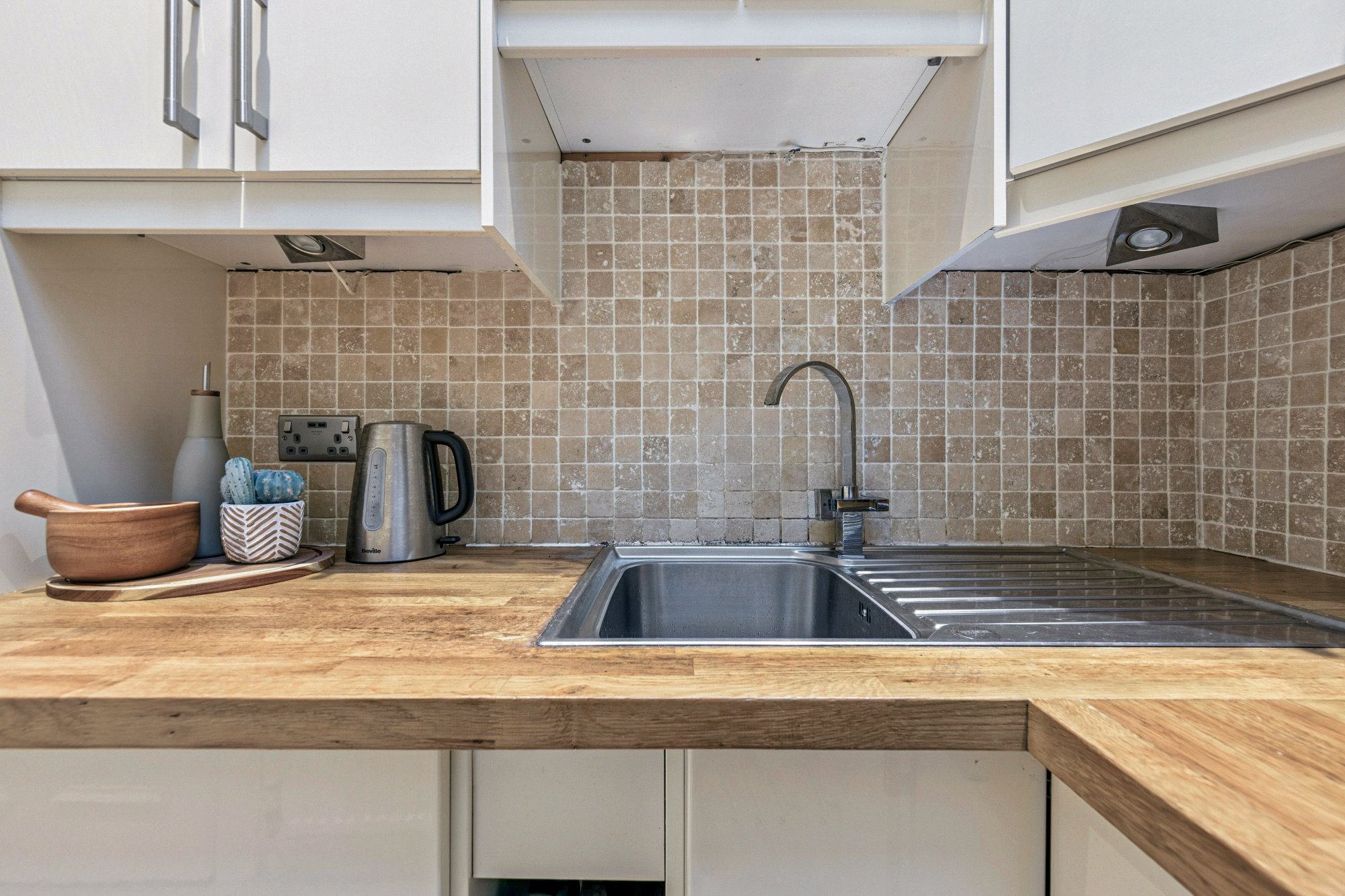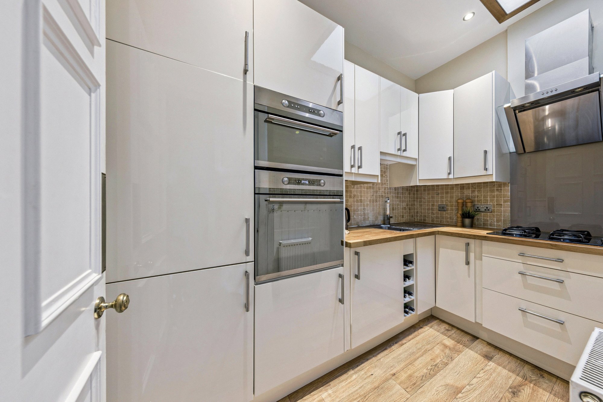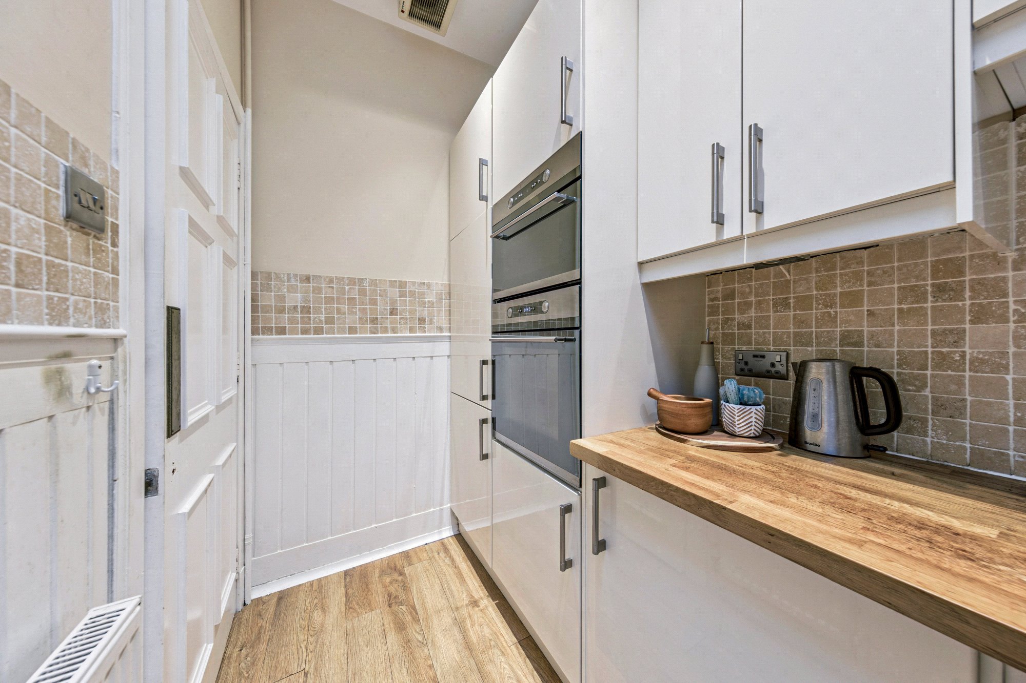 - Galley-style fitted kitchen with integrated appliances