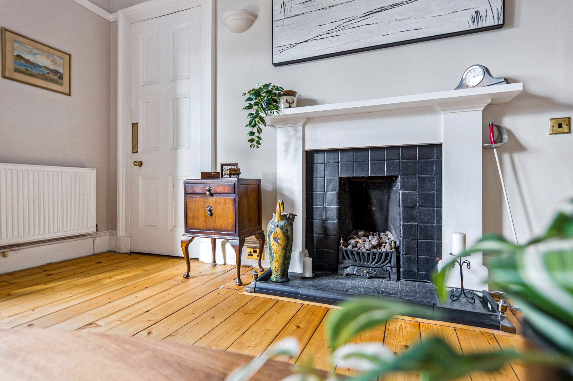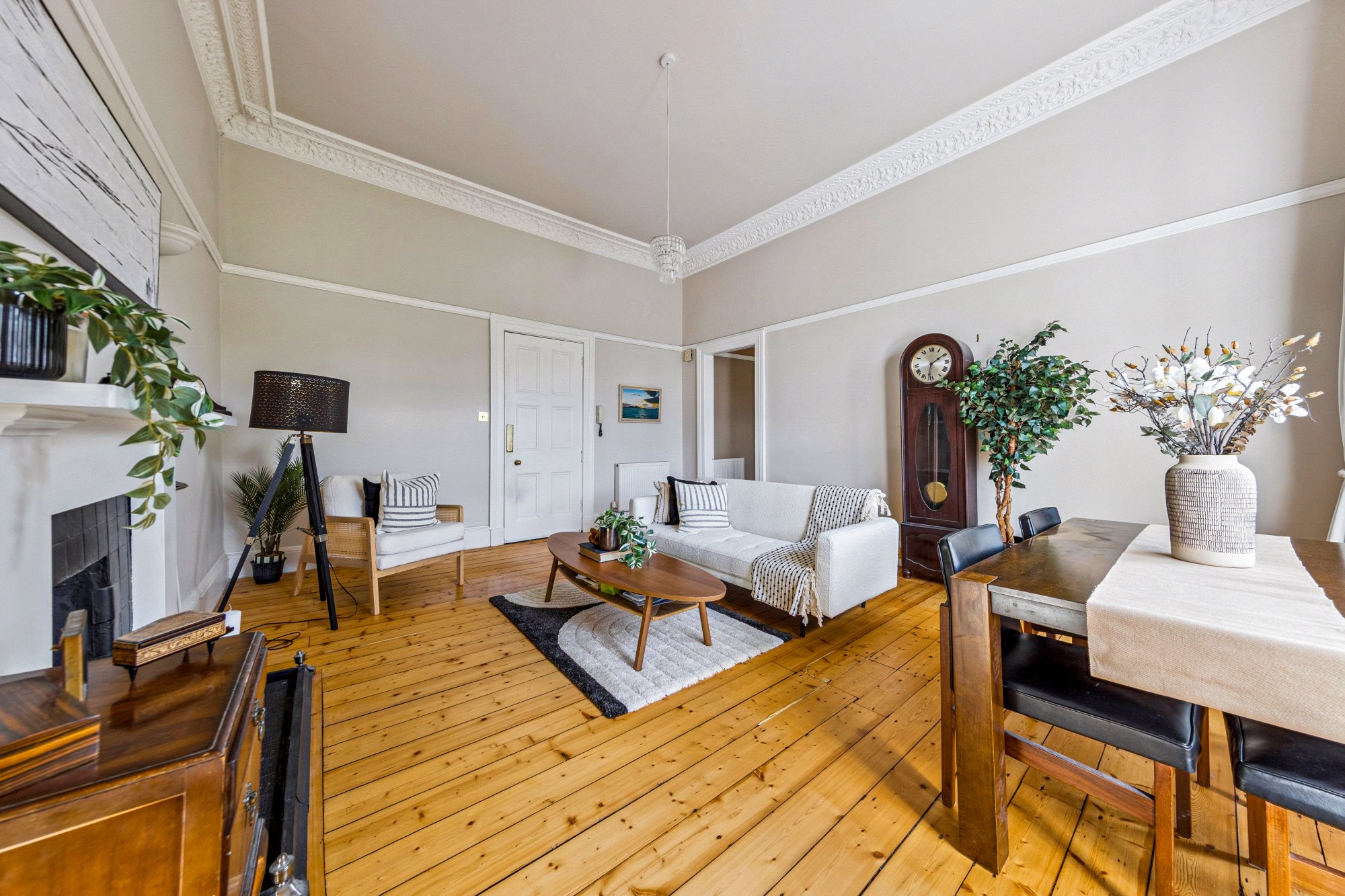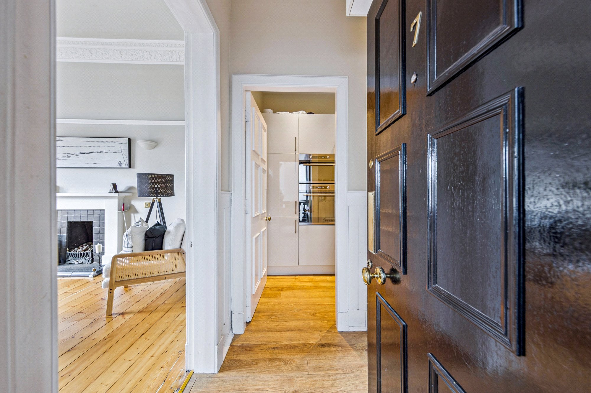 The property for sale forms part of a handsome townhouse that has been thoughtfully subdivided into eight individual dwellings. Entry is via a secure door with intercom system, and the shared hall and stairway are in excellent order, showcasing original period features enhanced by bright contemporary décor. The home itself is positioned on the second floor, accessed via the left-hand door from the upper landing.