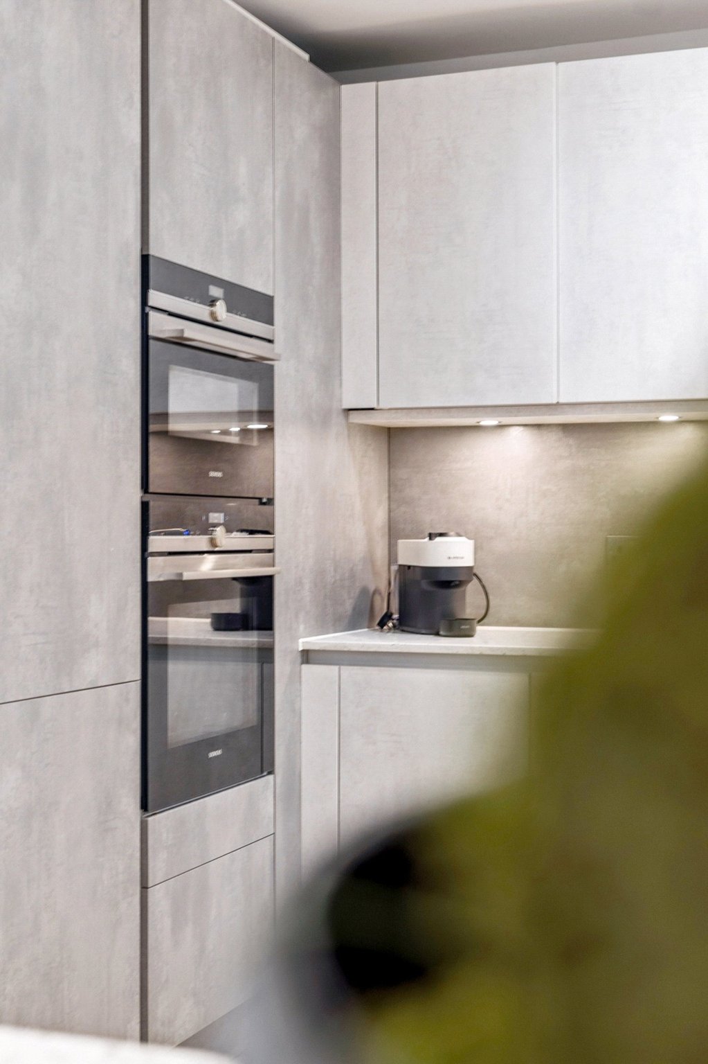 - Contemporary fitted kitchen with sleek handleless cabinetry, quartz-style worktops, quality integrated appliances and generous peninsula breakfast bar.