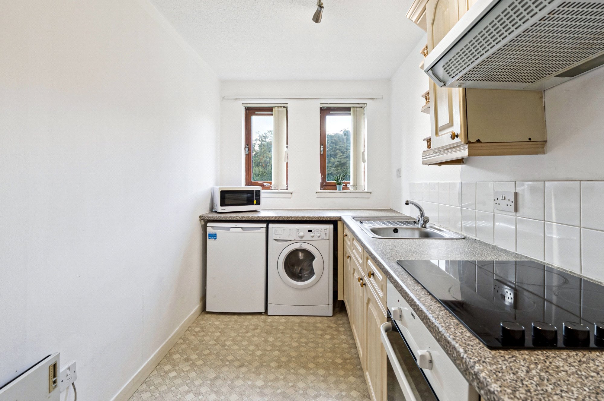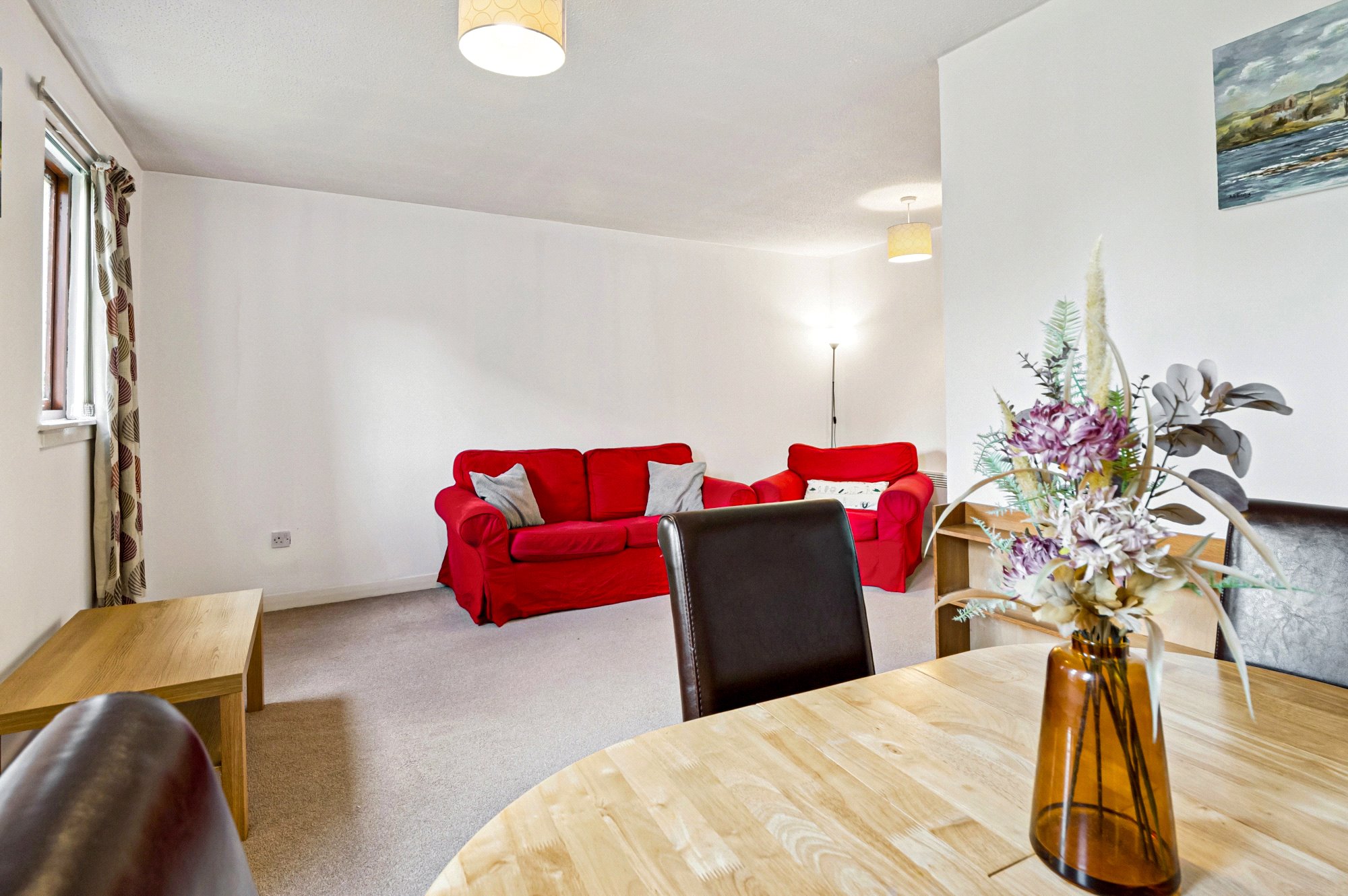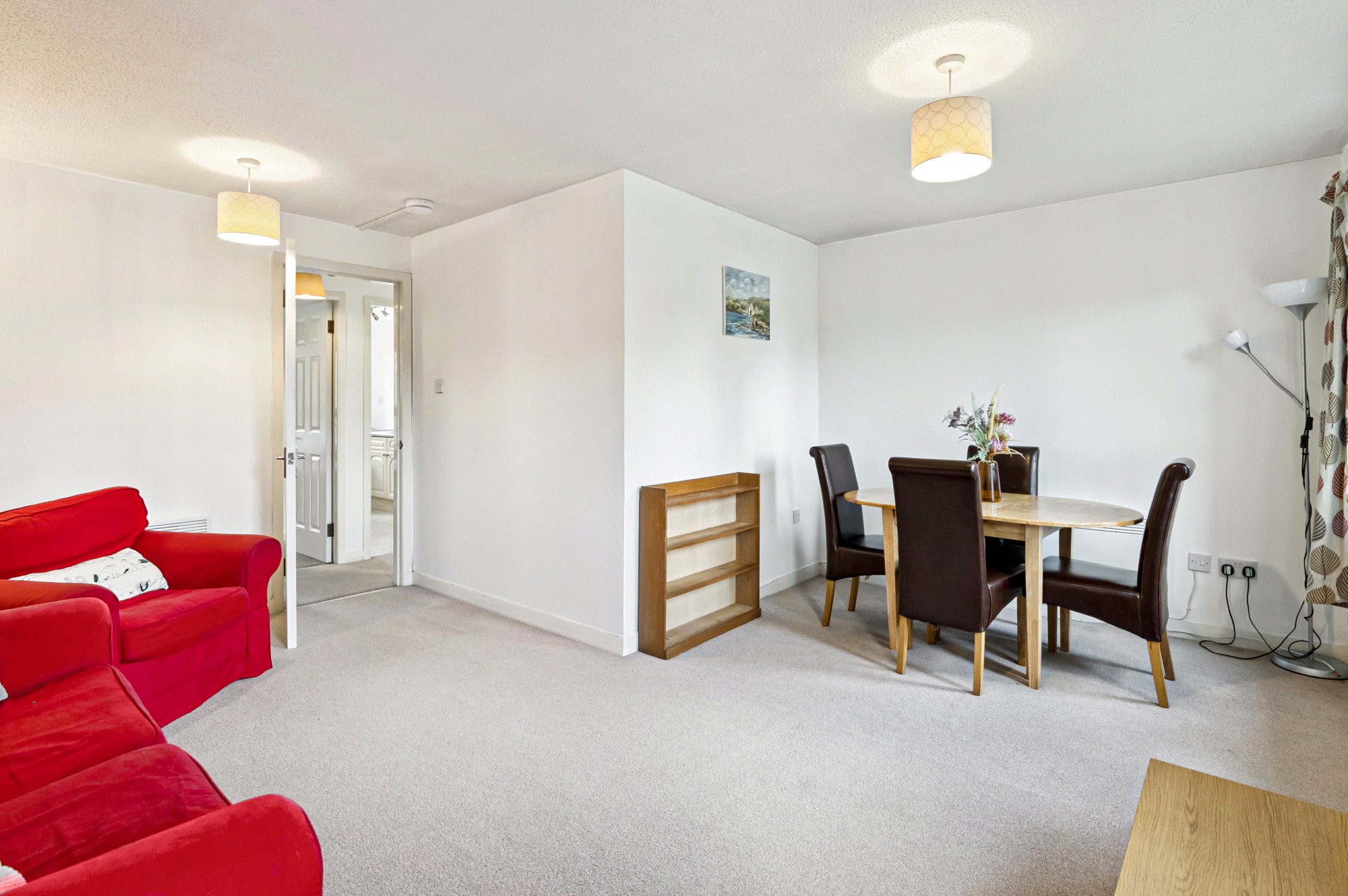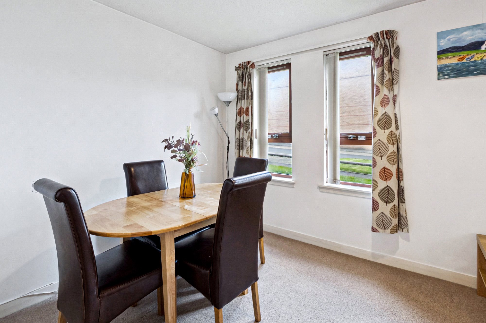 The layout flows naturally from an inviting hallway into a generous living room with three windows and a dining recess, also ideal for a dedicated work-from-home solution. The separate kitchen, with potential for dining, keeps cooking neatly out of sight yet sociable, while the double bedroom benefits from fitted wardrobes. A three-piece bathroom with electric shower completes the accommodation, and a further hall cupboard provides imperative storage provision.