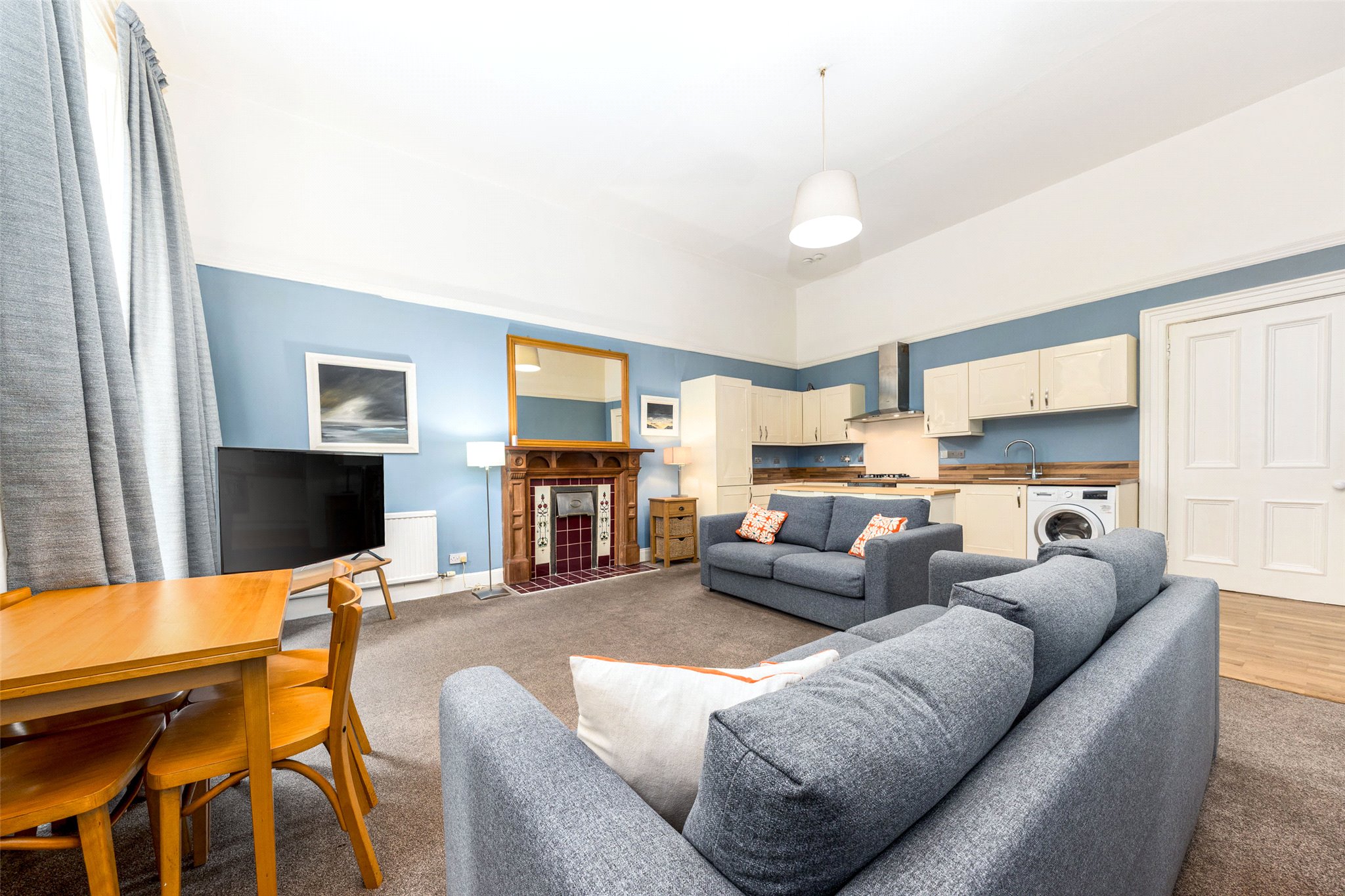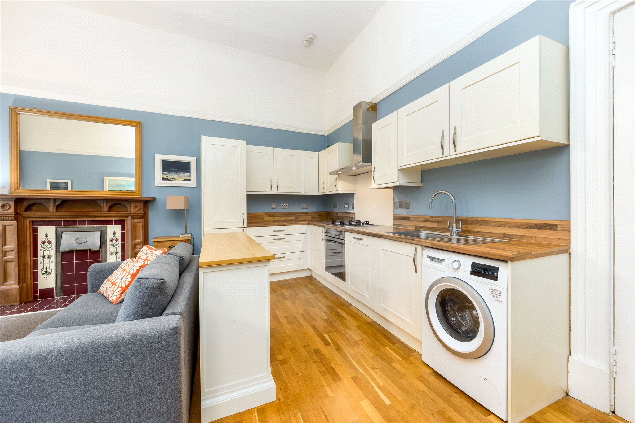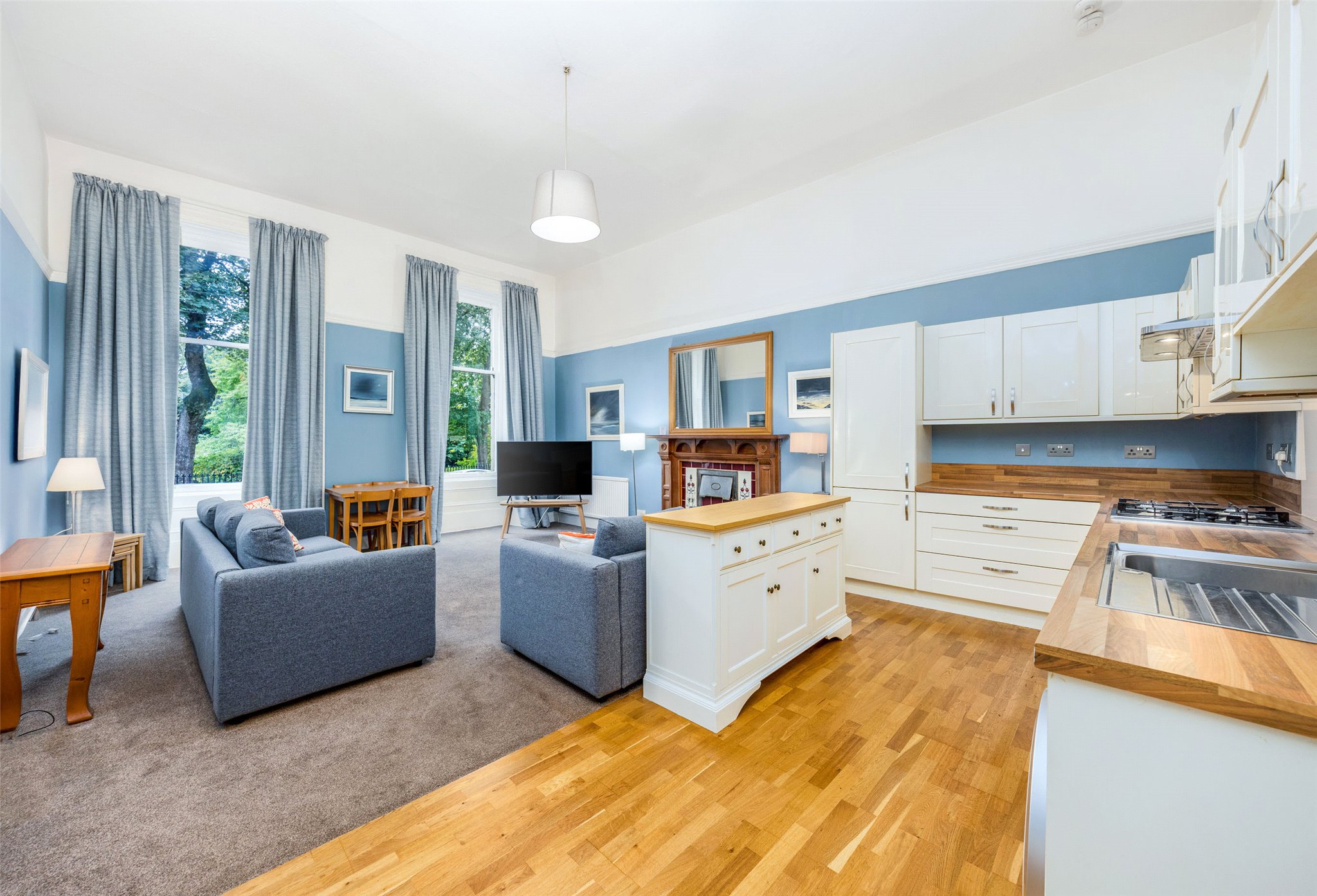 The heart of the home is a bright, front-facing open-plan living, dining, and kitchen area. Twin picture windows overlook the central pleasure gardens of Belmont Crescent, flooding the space with natural light and creating a perfect setting for both everyday living and entertaining.