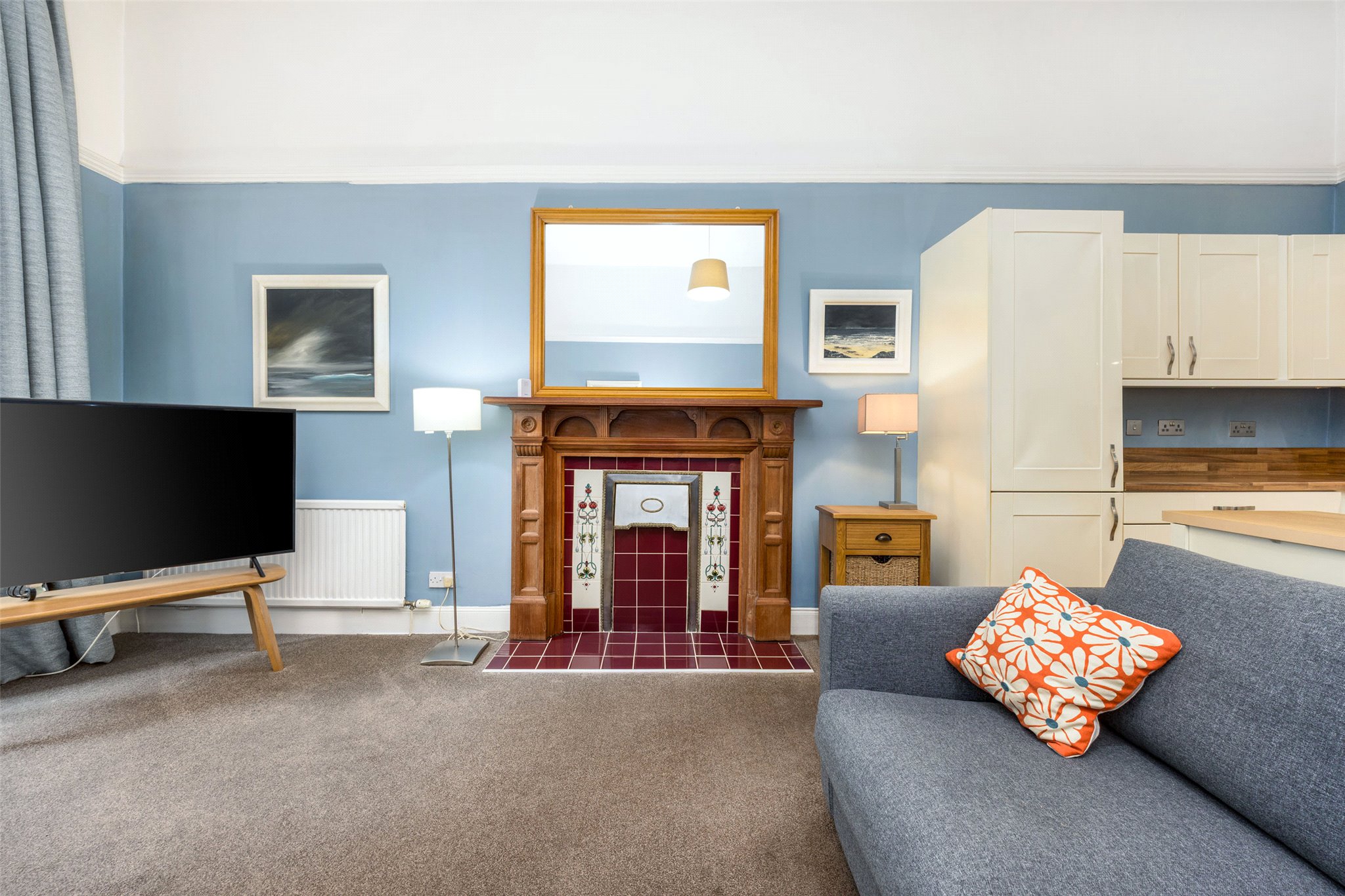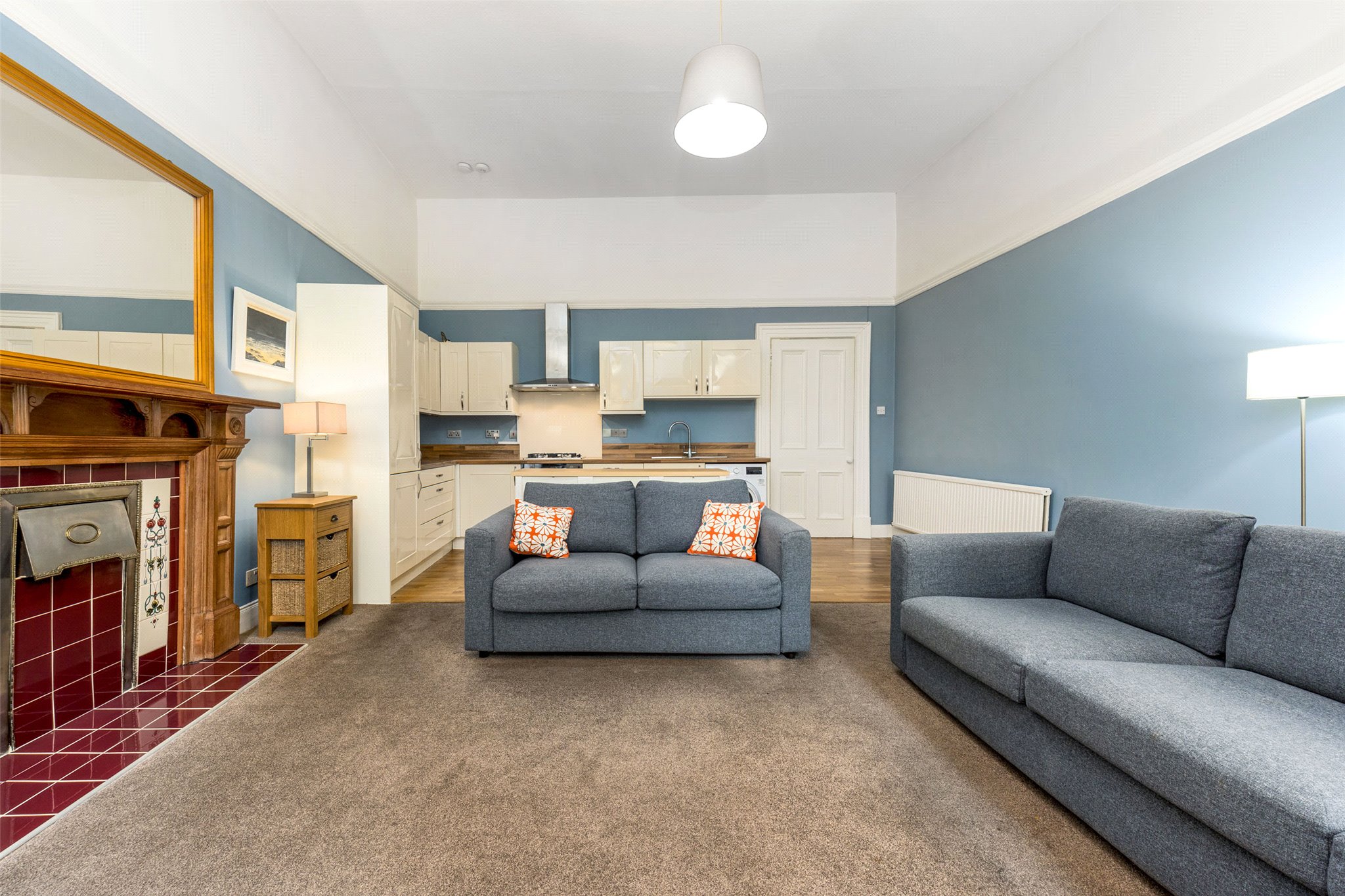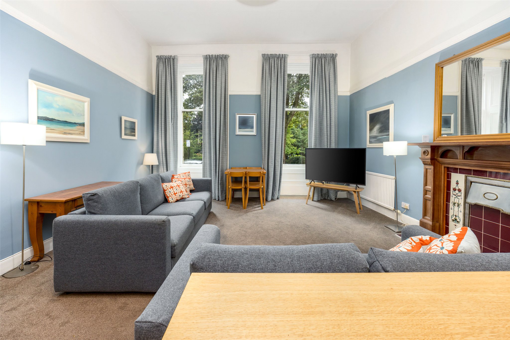 The heart of the home is a bright, front-facing open-plan living, dining, and kitchen area. Twin picture windows overlook the central pleasure gardens of Belmont Crescent, flooding the space with natural light and creating a perfect setting for both everyday living and entertaining.