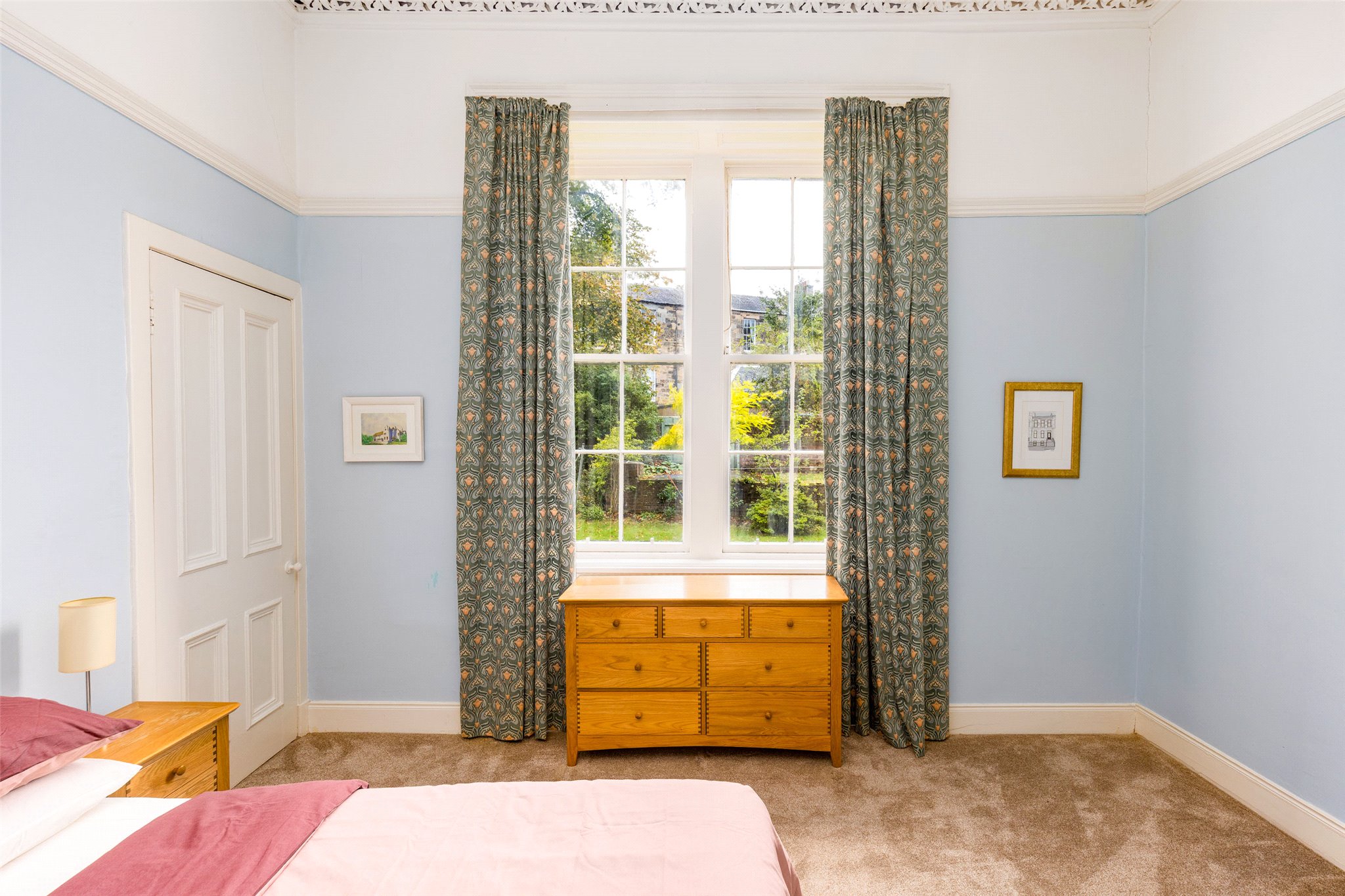 Belmont Crescent is a highly desirable address, situated near the Botanic Gardens and just off Great Western Road in the West End of Glasgow. Renowned as one of the city’s finest examples of Victorian crescent architecture, the terrace was designed by architect John Honeyman and completed between 1869 and 1870. The graceful Classical-style homes are arranged in a sweeping curve around beautifully maintained residents’ pleasure gardens, complete with lawns, mature trees, and vibrant planting. According to record, the townhouses were originally constructed to a speculative standard, with buyers given freedom to complete their internal layouts to suit. It is thought that the first owner of Number 13 elected to make their property entirely unique by adding the rear-facing bay windows—a feature not found in any other home on the crescent.