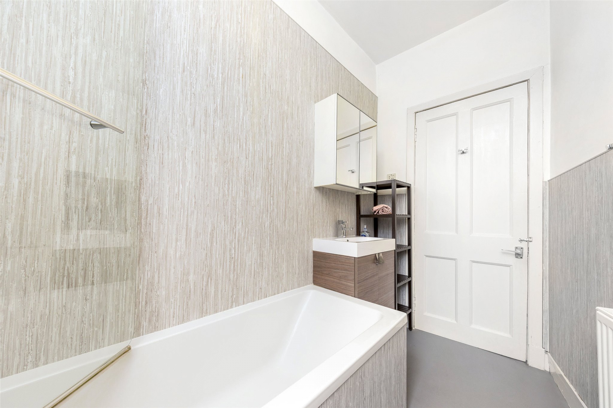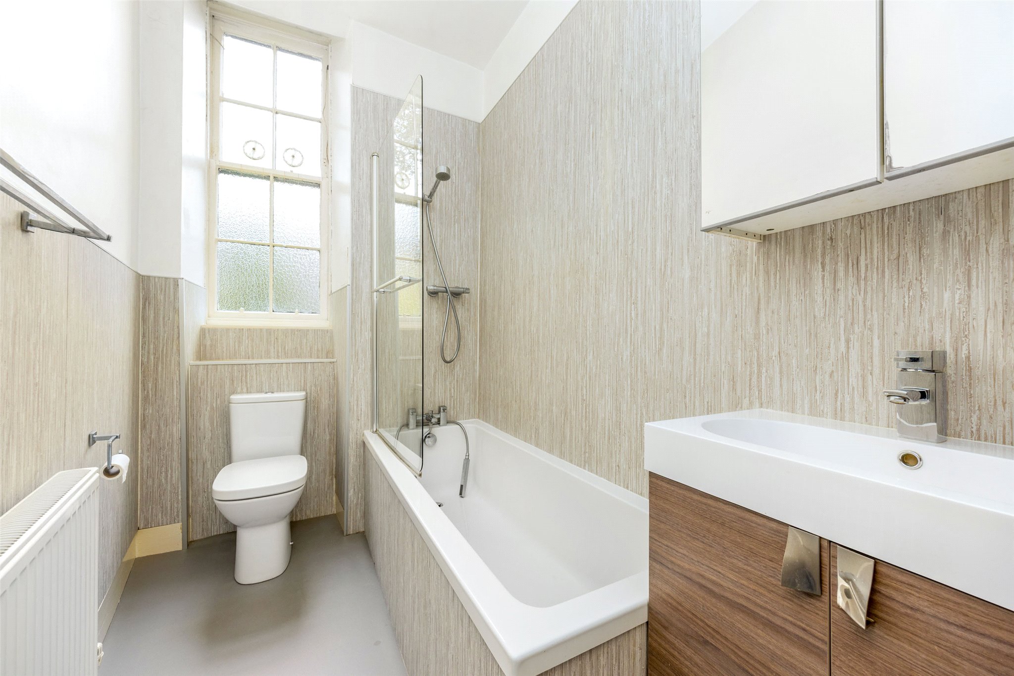 There are two particularly spacious king-sized bedrooms, both of which are located to the rear and overlook the rear garden. The principal is of superb proportions and has a roomy cupboard. The second bedroom is a distinctive feature of this property: set to the rear, it is enhanced by a unique bay window which provides a charming seating area and offers outlooks across the enclosed residents’ garden.