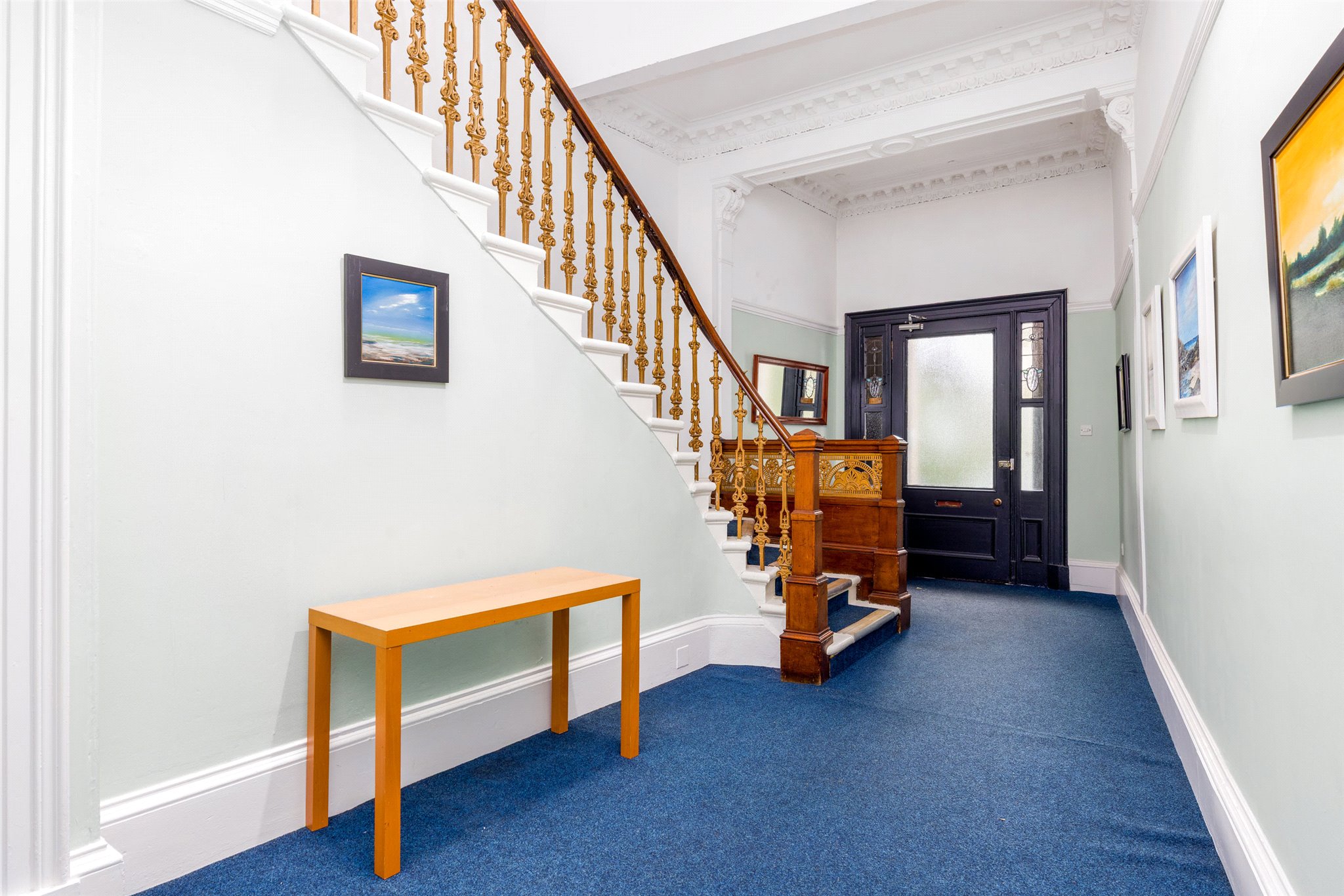The property is entered via a secure doorway with intercom system that leads into a well-maintained communal hallway, with lovely entact original features that set the tone for character found throughout the building.