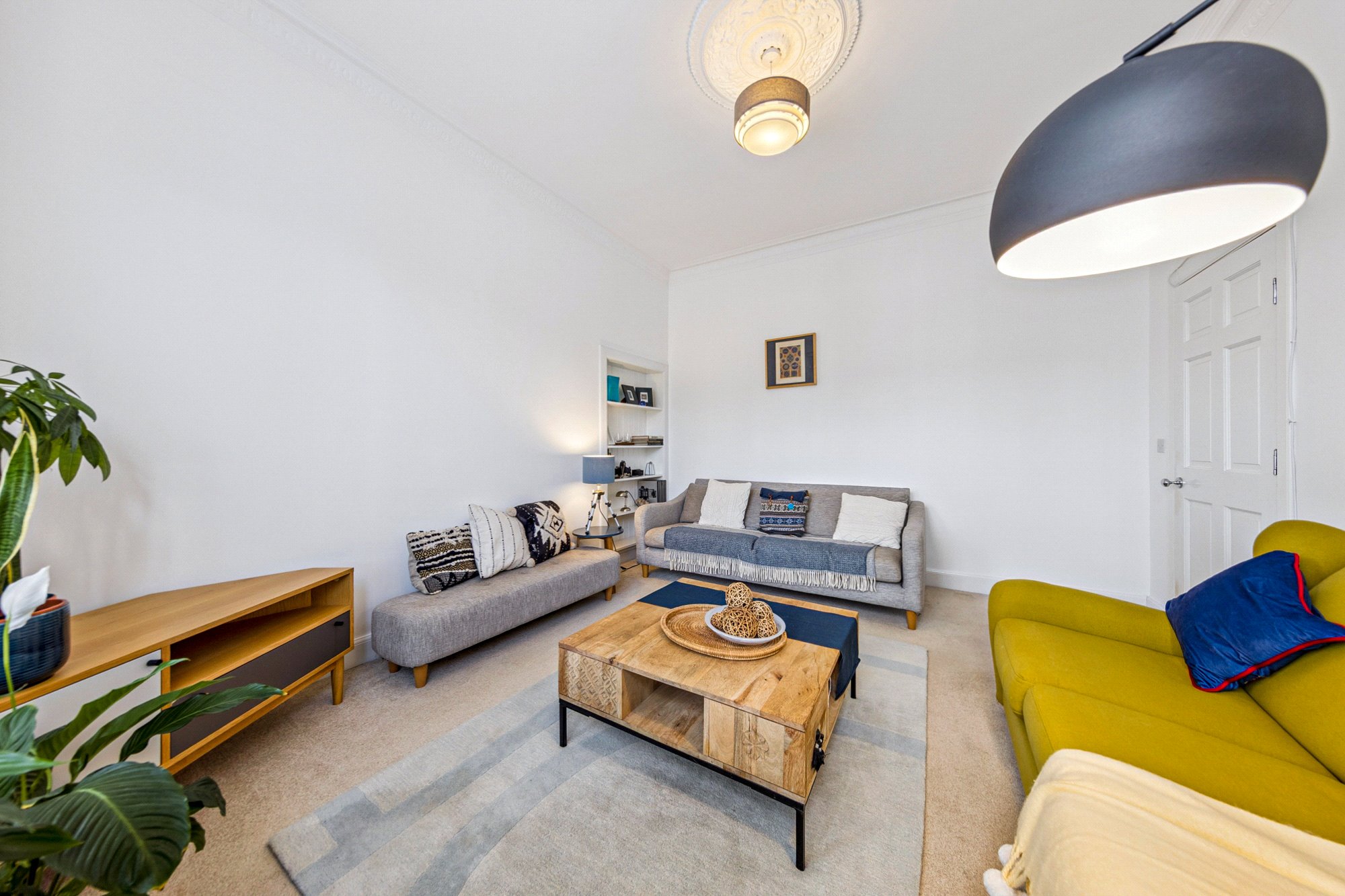 Spacious bay-windowed living room with feature press