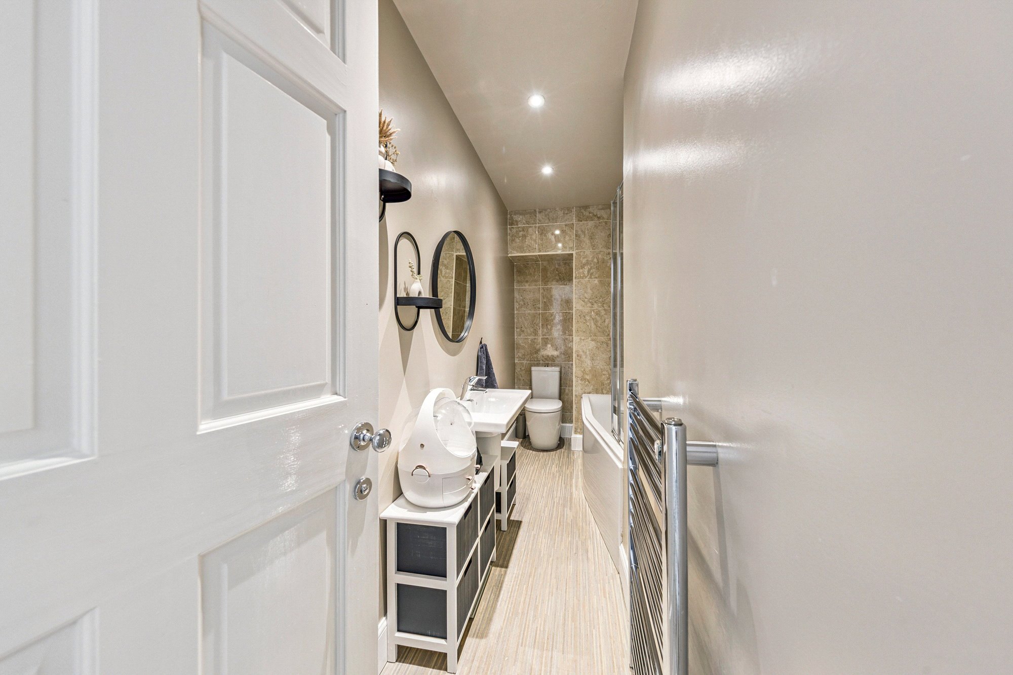 Modern ground-floor bathroom with white suite, stone-toned tiling and shower-over-bath
