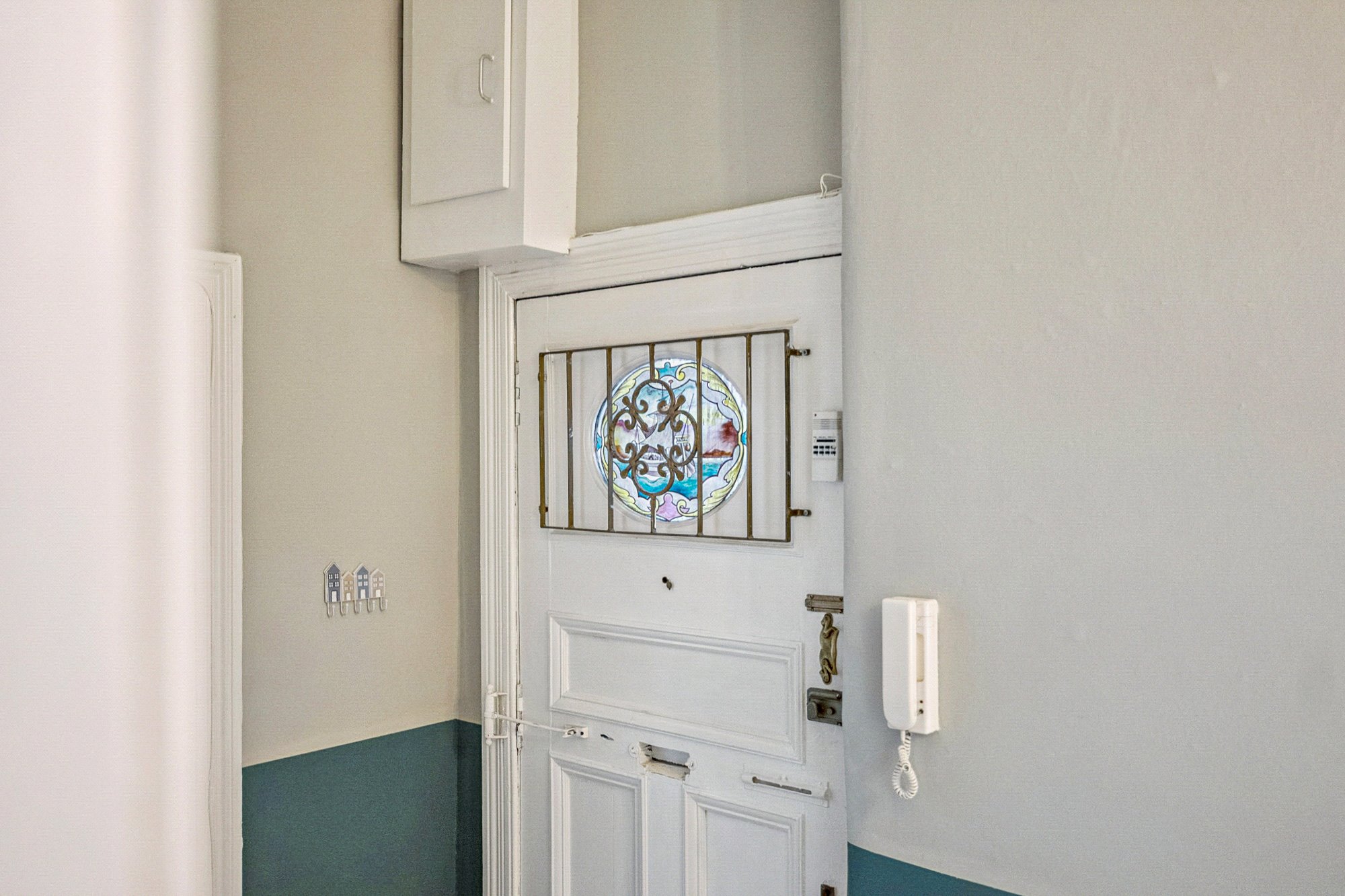 - Beautiful shared tenement stairway with original tiling and dark hardwood balustrades.