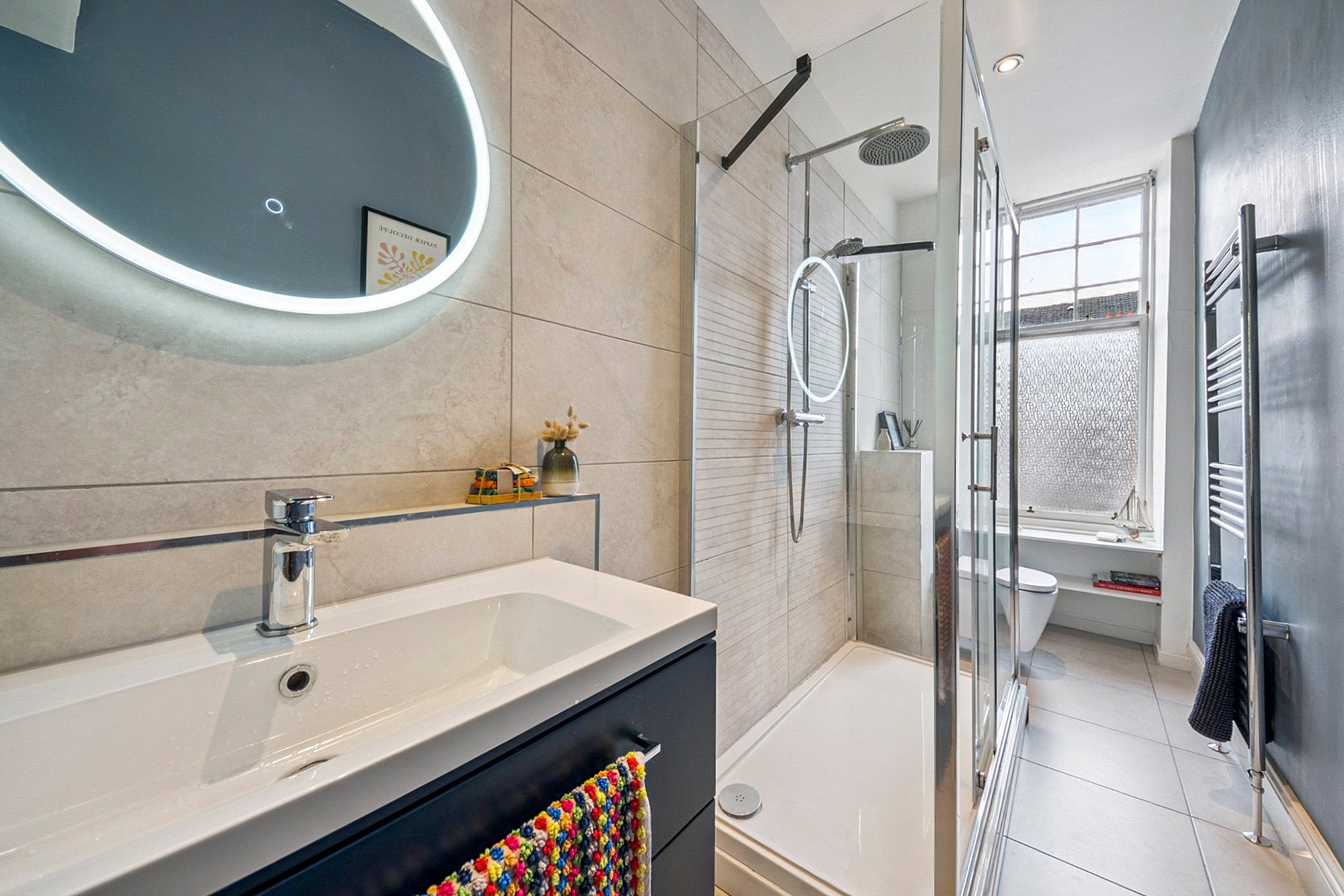 - Contemporary three-piece shower room with modern white suite, grey stone-effect tiling and LED feature mirror.