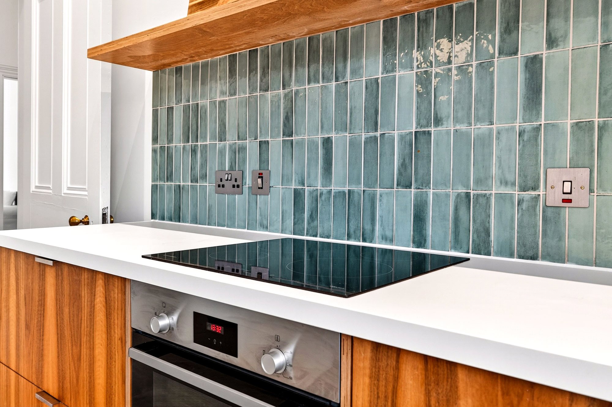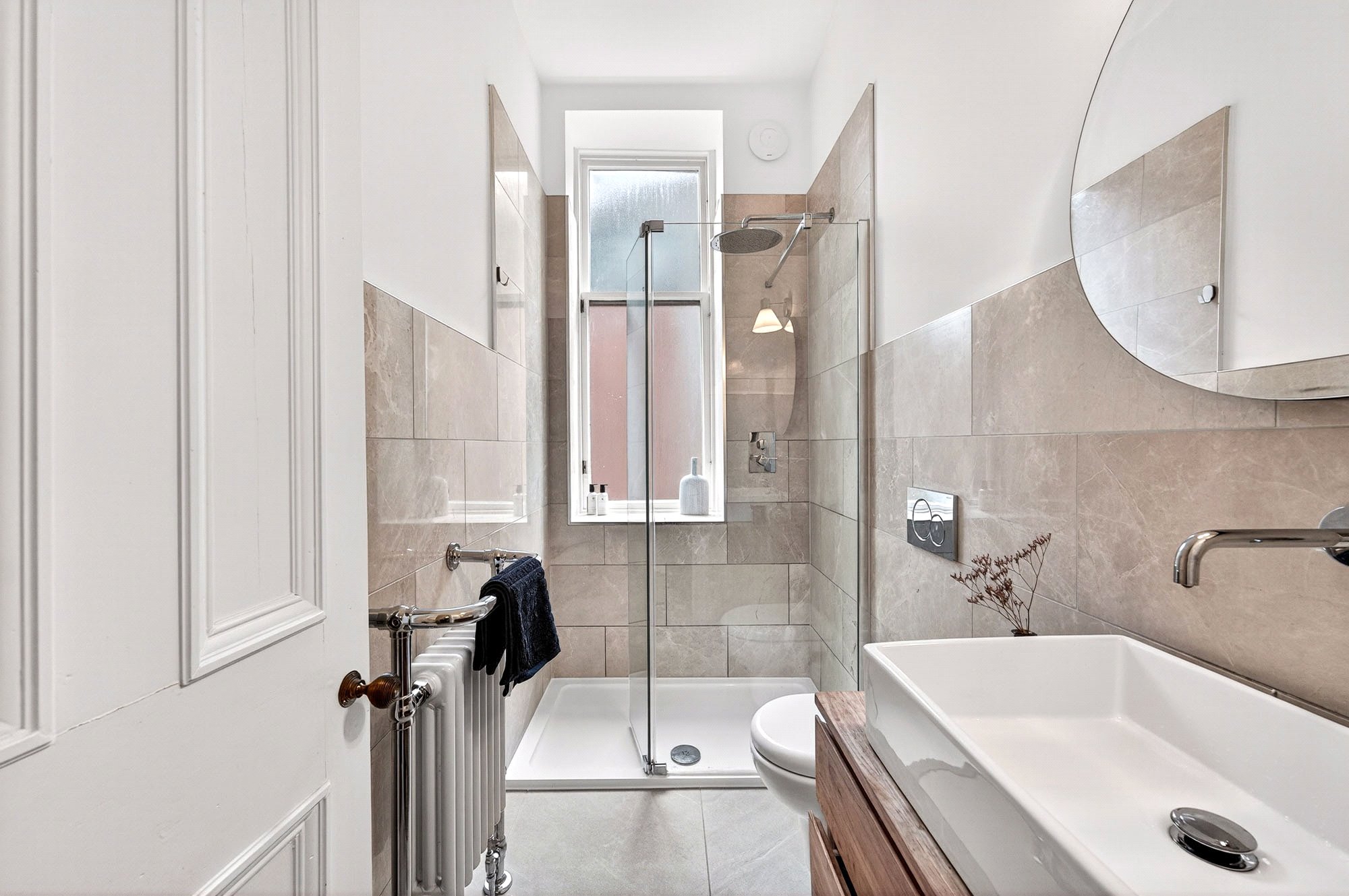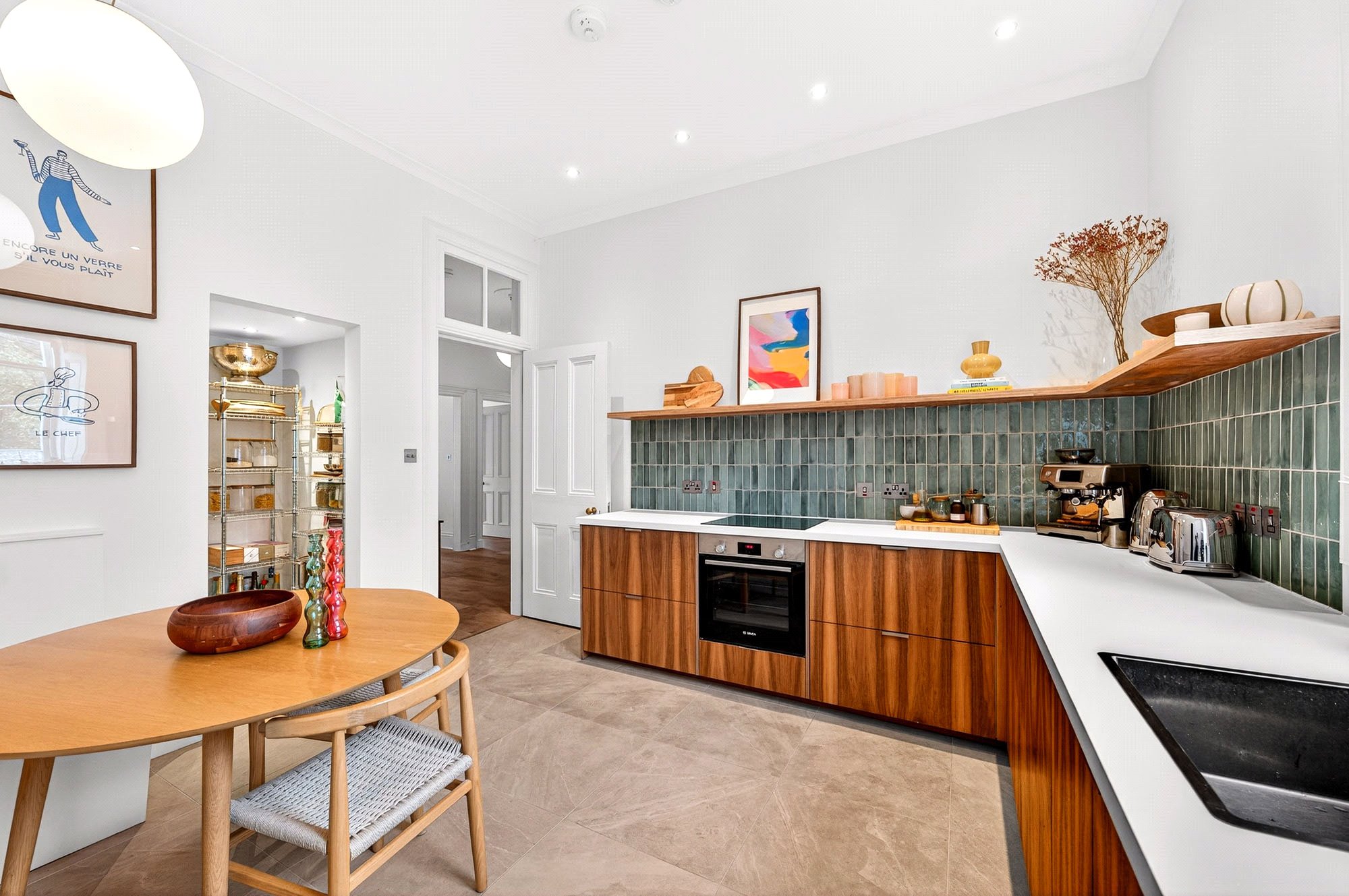 The dining kitchen is a particular highlight of the property – refitted to an exacting standard with sleek modern cabinetry, a full complement of high-specification integrated appliances, and stylish work surfaces. The space has been cleverly designed to incorporate a reconfigured, full-sized pantry which offers valuable storage and additional workspace. The contemporary bathroom completes the accommodation beautifully, featuring a white suite, shower over bath, and elegant tiling that reflects the property’s refined aesthetic.